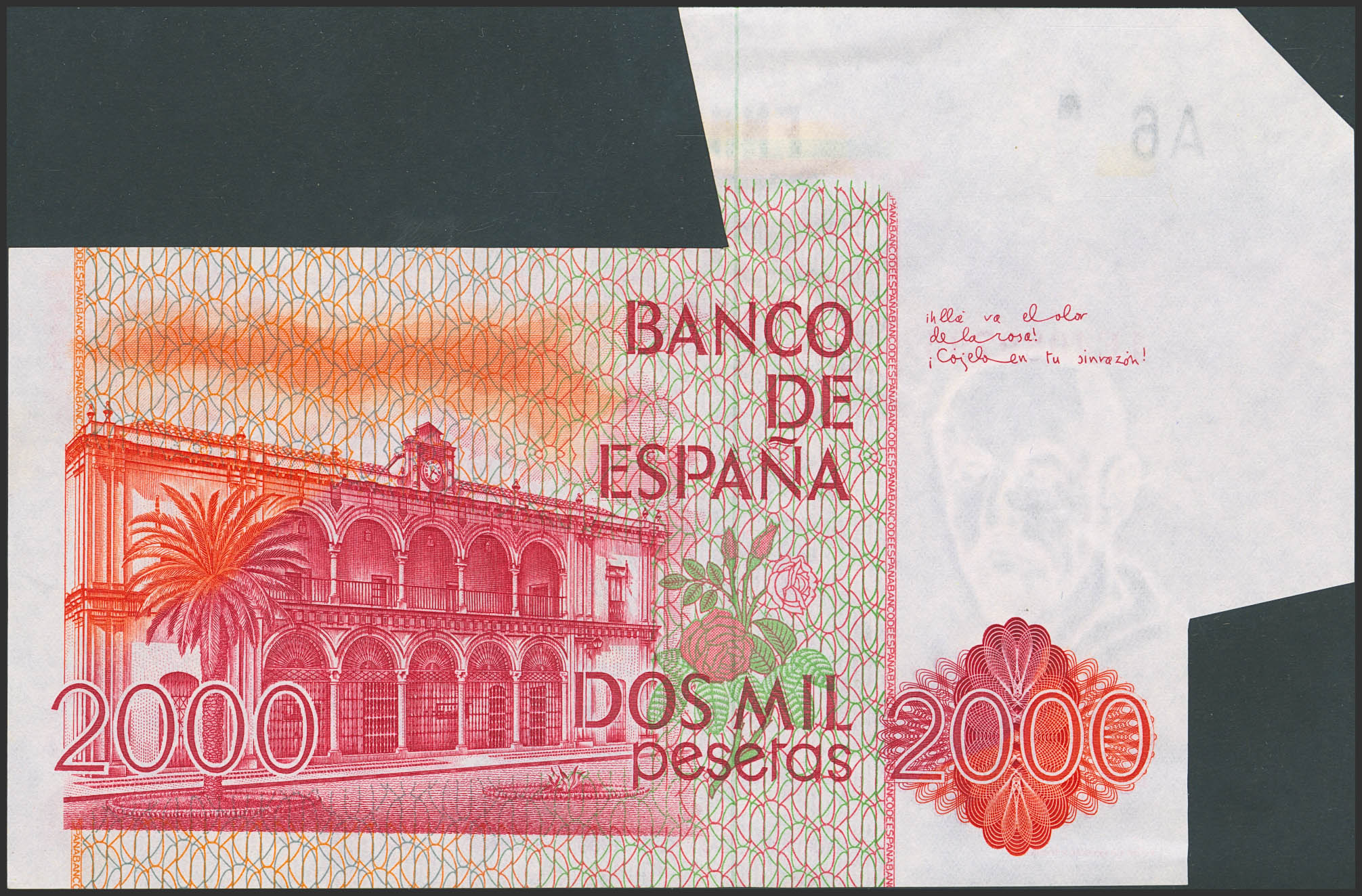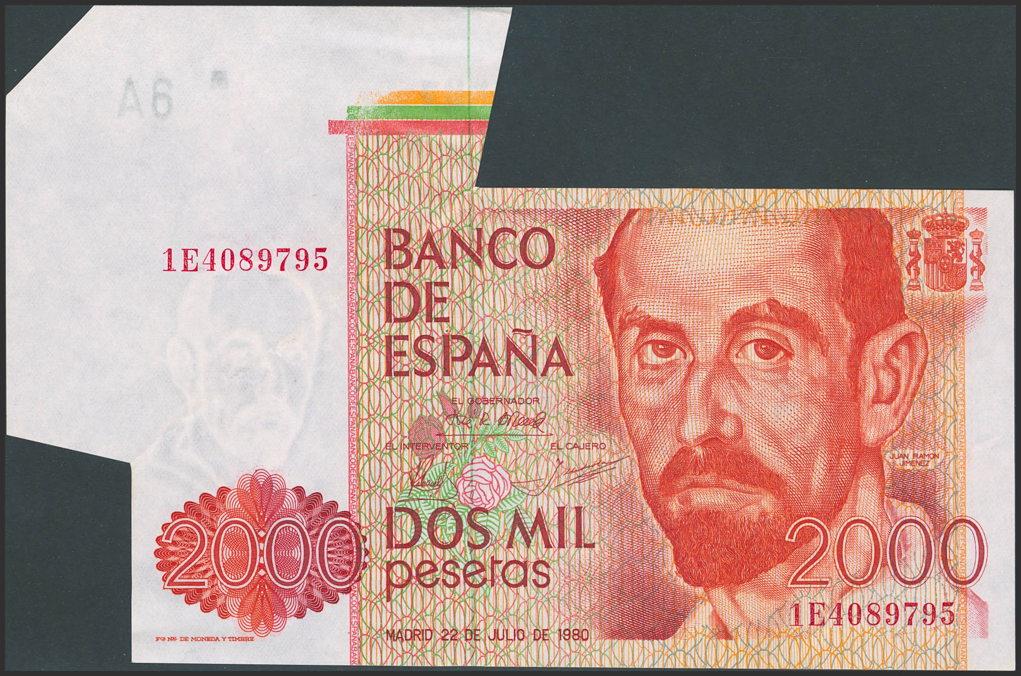 2000 Pesetas. 22 de Julio de 1980. Error de guillotinado en la esquina superior izquierda. Serie 1E. (Edifil 2023: 479a, Pick: 159). Extraordinariamente raro, especialmente con esta espectacular variedad. SC-.