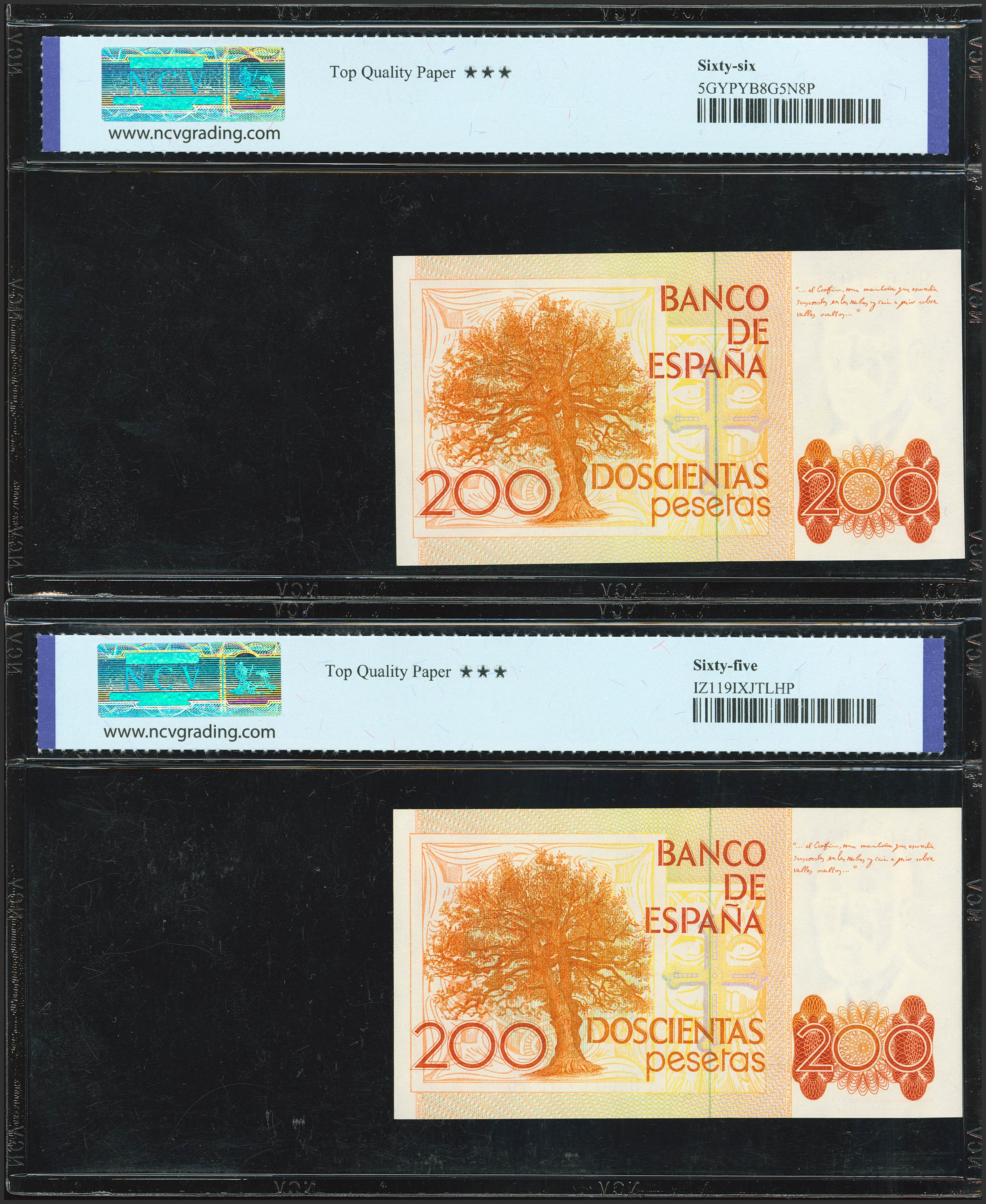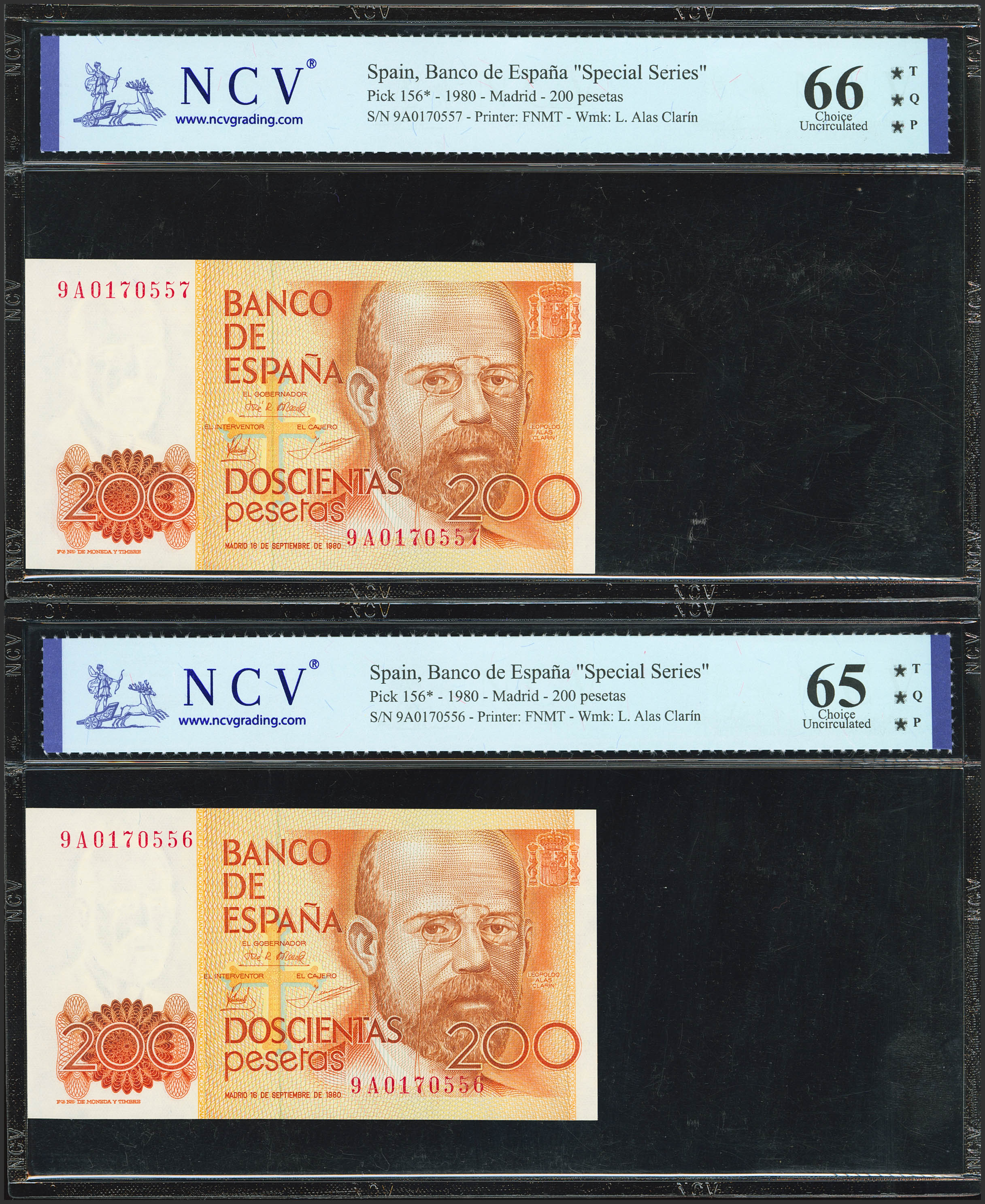 200 Pesetas. 16 de Septiembre de 1980. Pareja correlativa. Serie especial 9A. (Edifil 2023: 480b, Pick: 156*). SC. Encapsulados NCV65TQP/66TQP, ambos.