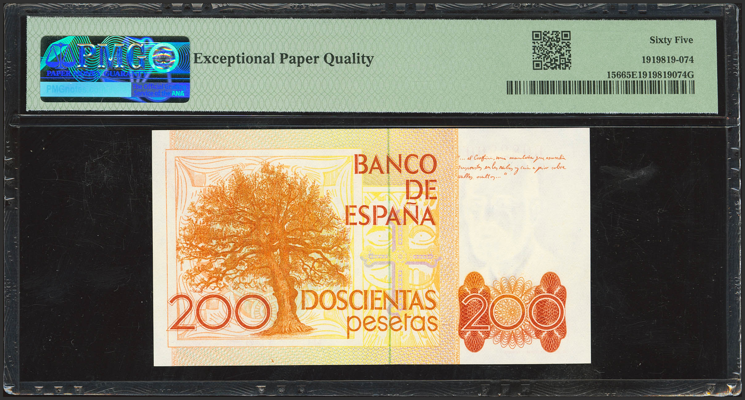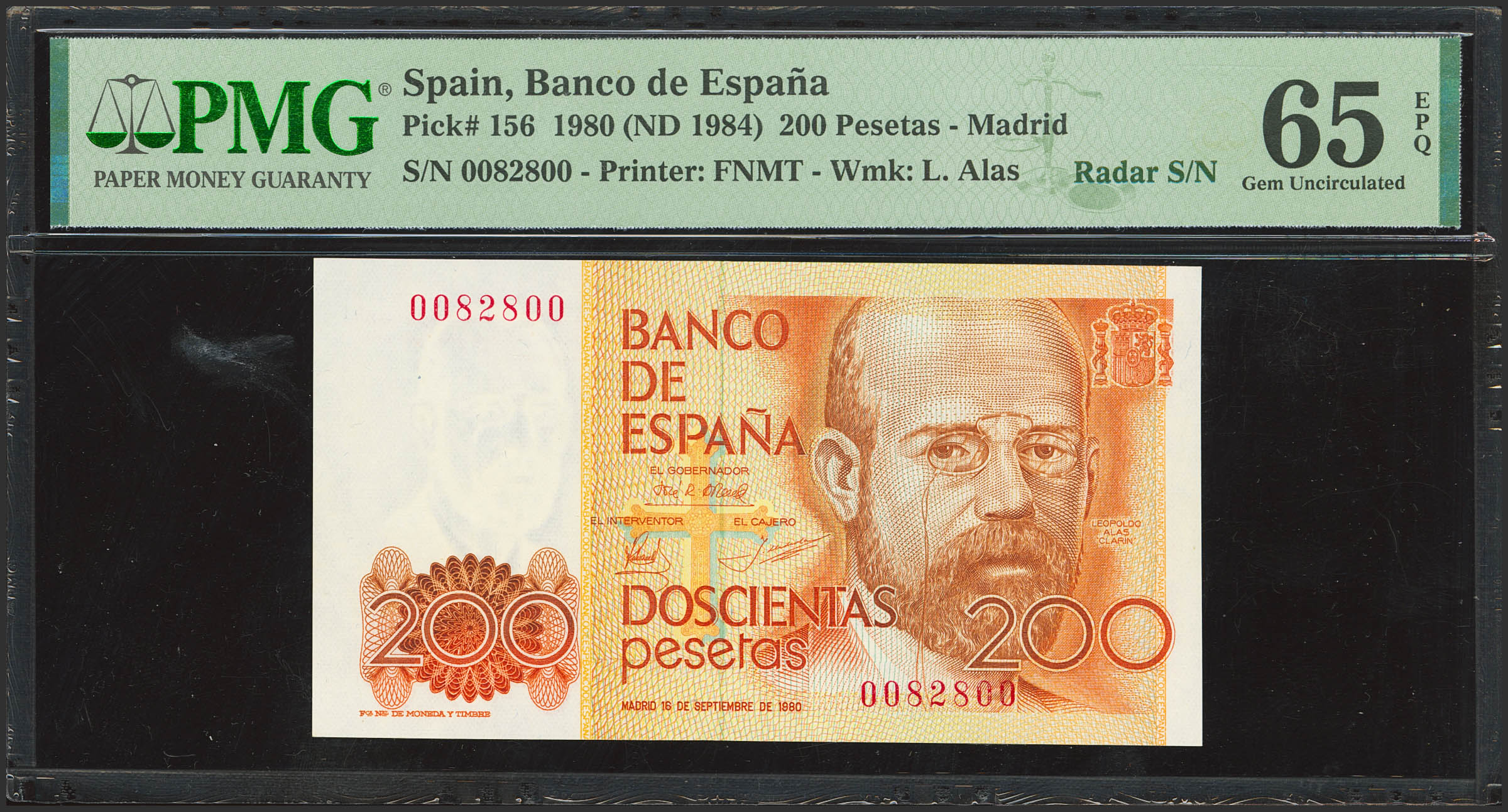 200 Pesetas. 16 de Septiembre de 1980. Sin serie y numeración capicúa. (Edifil 2023: 480, Pick: 156). SC. Encapsulado PMG65EPQ.