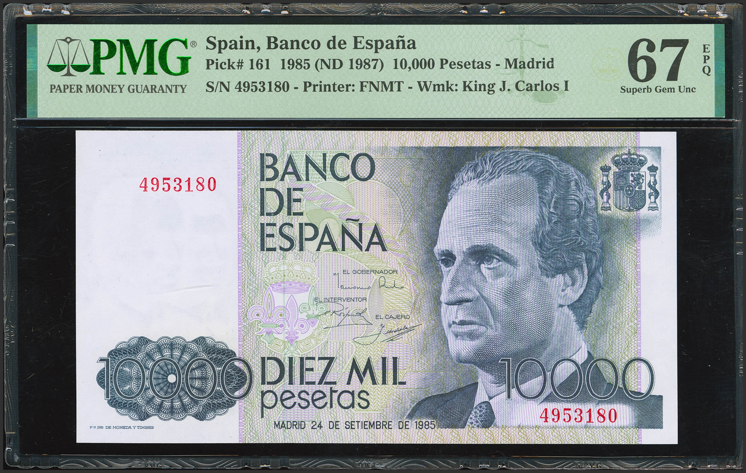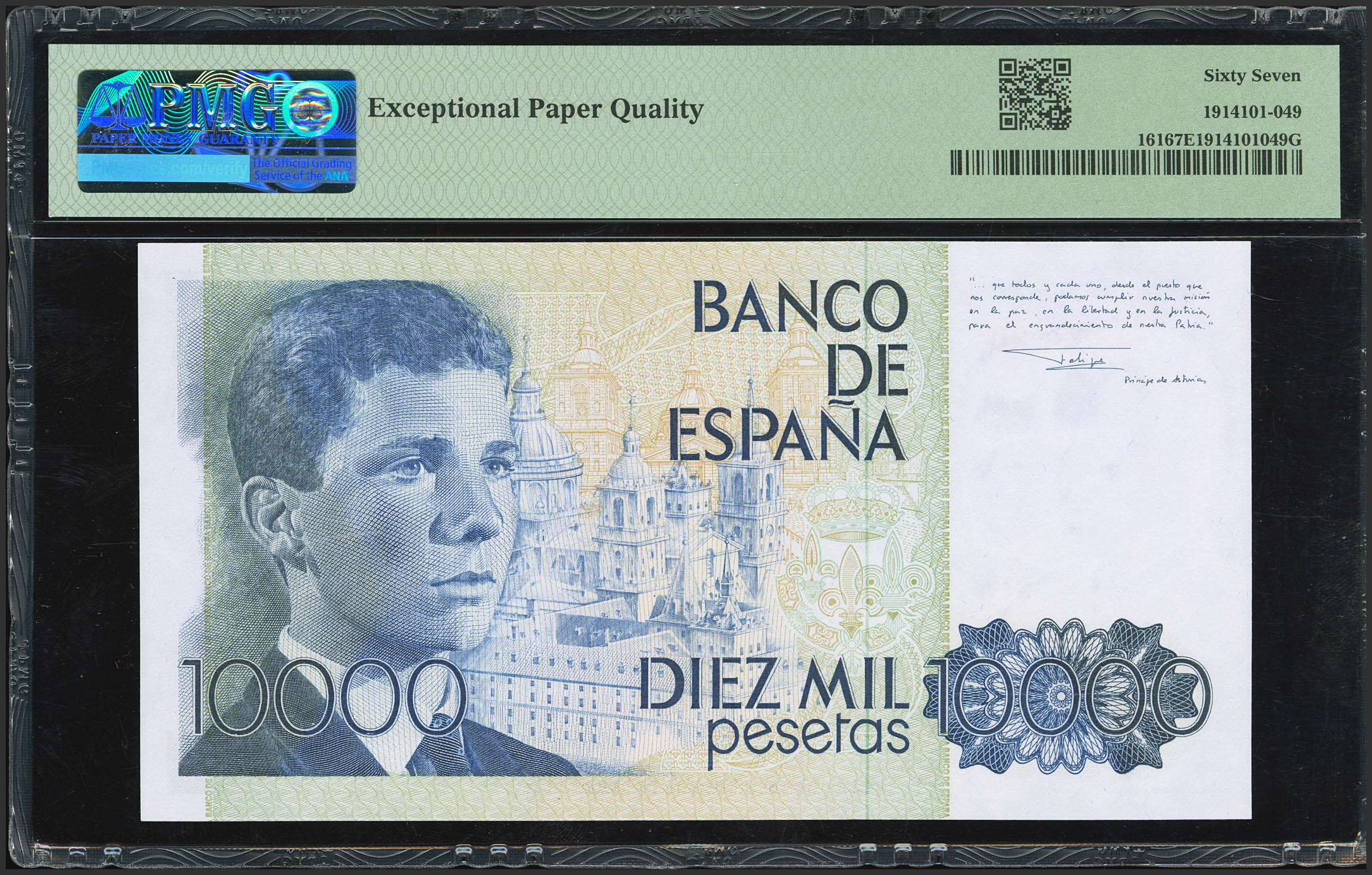 10000 Pesetas. 24 de Septiembre de 1985. Sin serie. (Edifil 2021: 481, Pick: 161). Inusual en esta excepcional calidad. SC. Encapsulado PMG67EPQ.