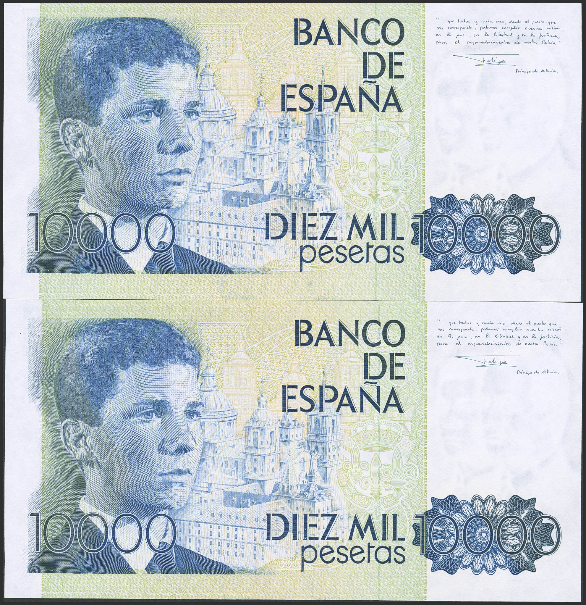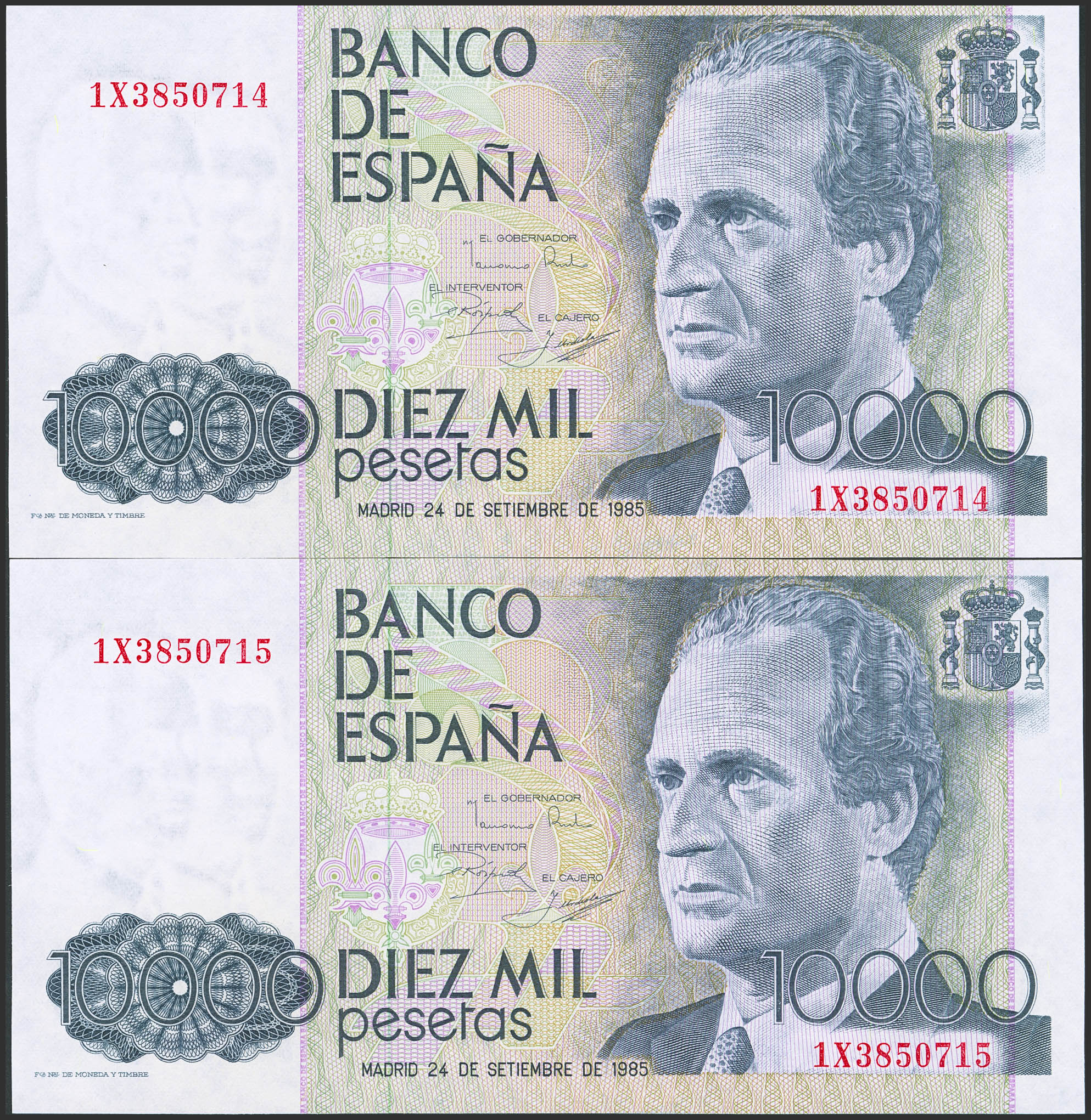 10000 Pesetas. 24 de Septiembre de 1985. Pareja correlativa. Serie 1X. (Edifil 2023: 481a). SC-.