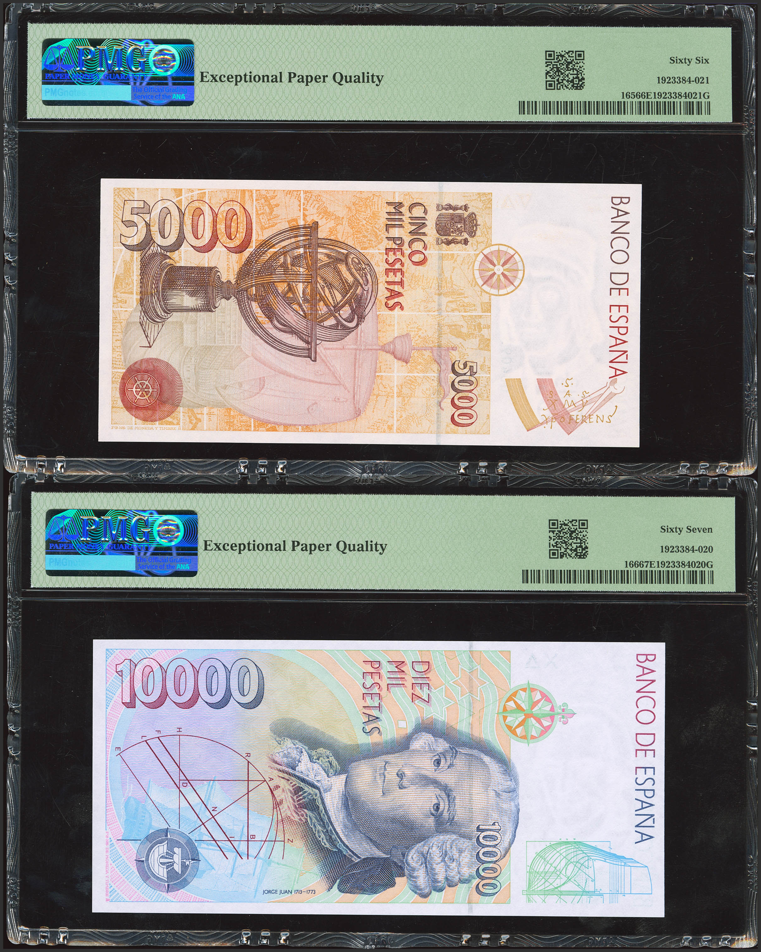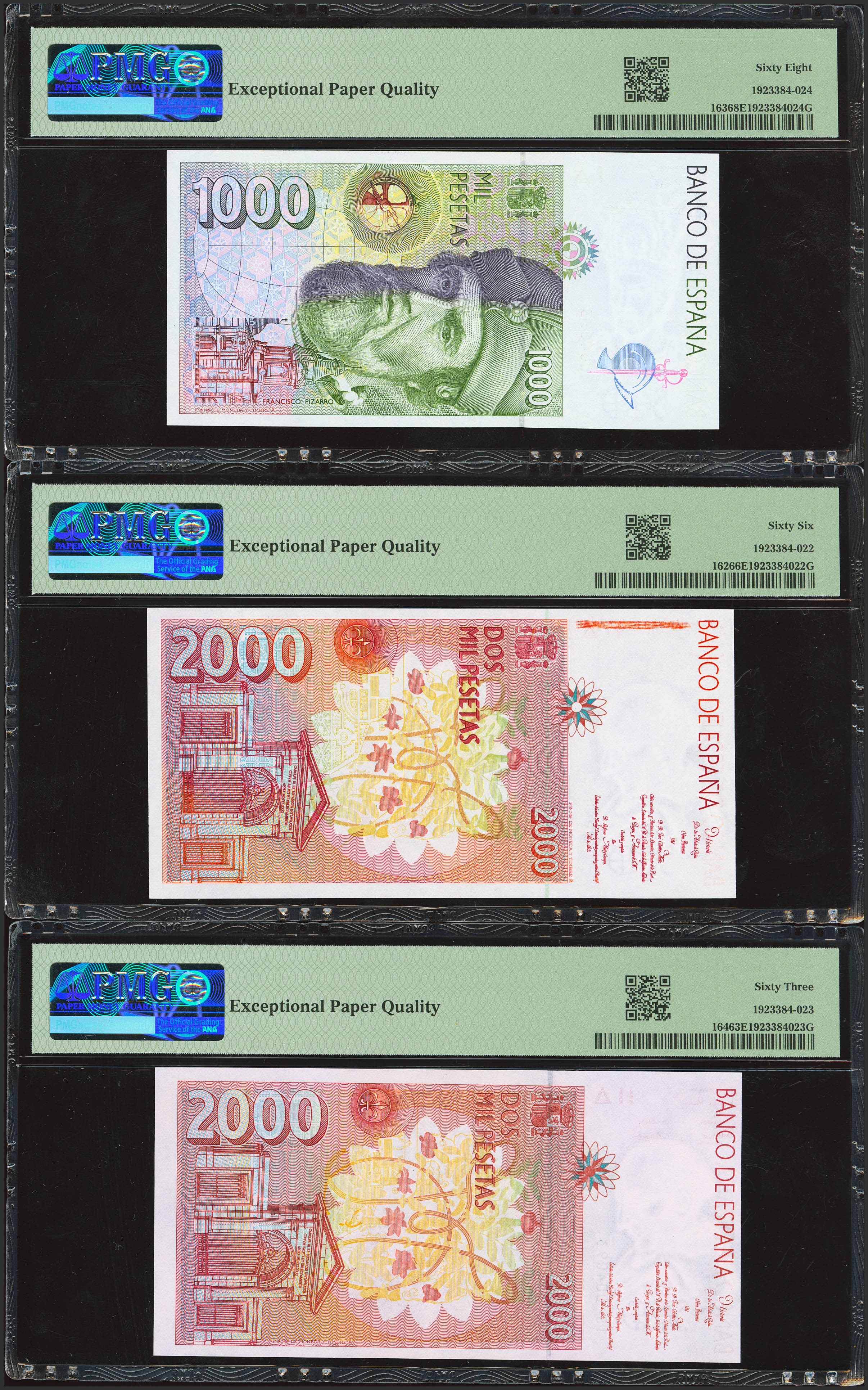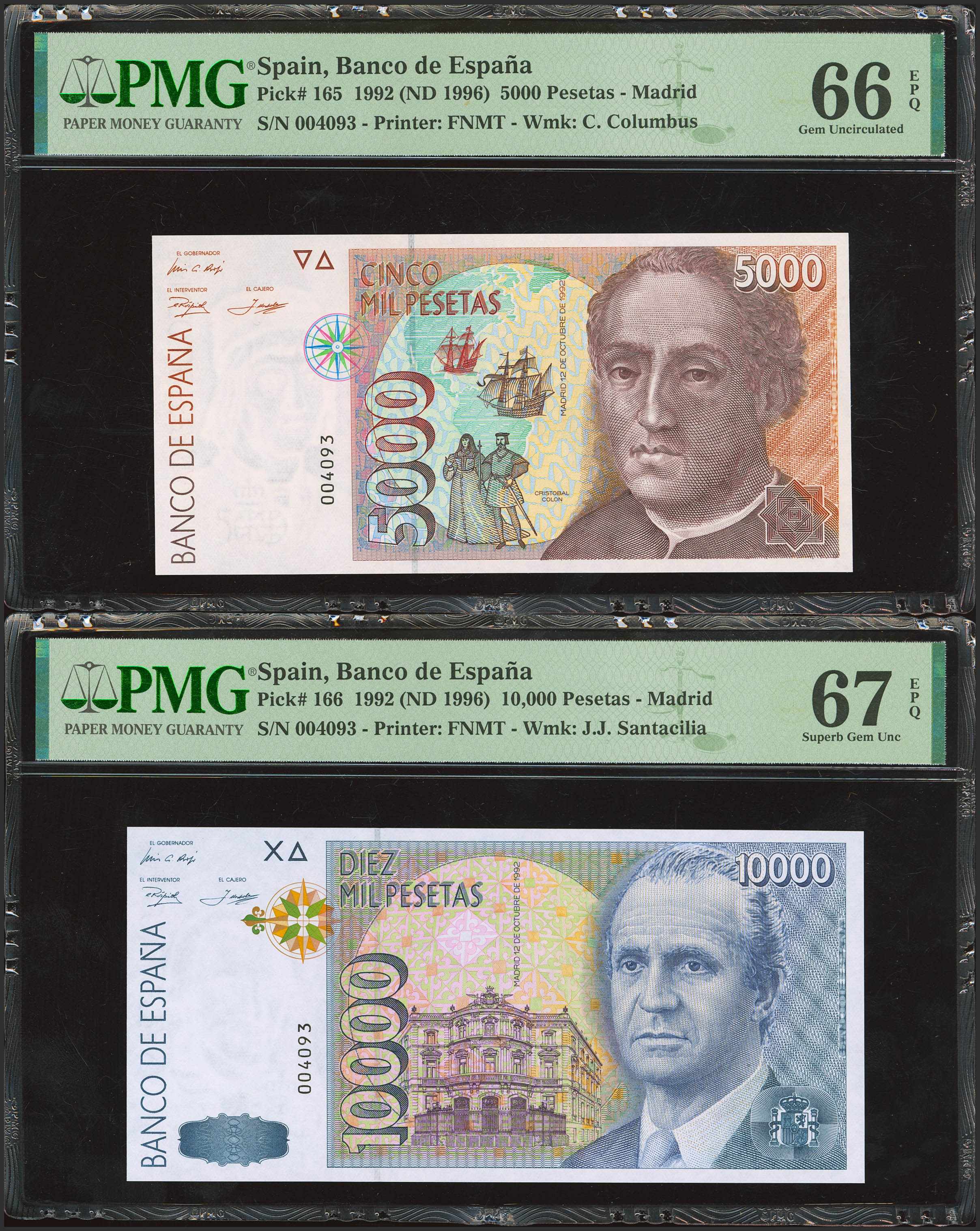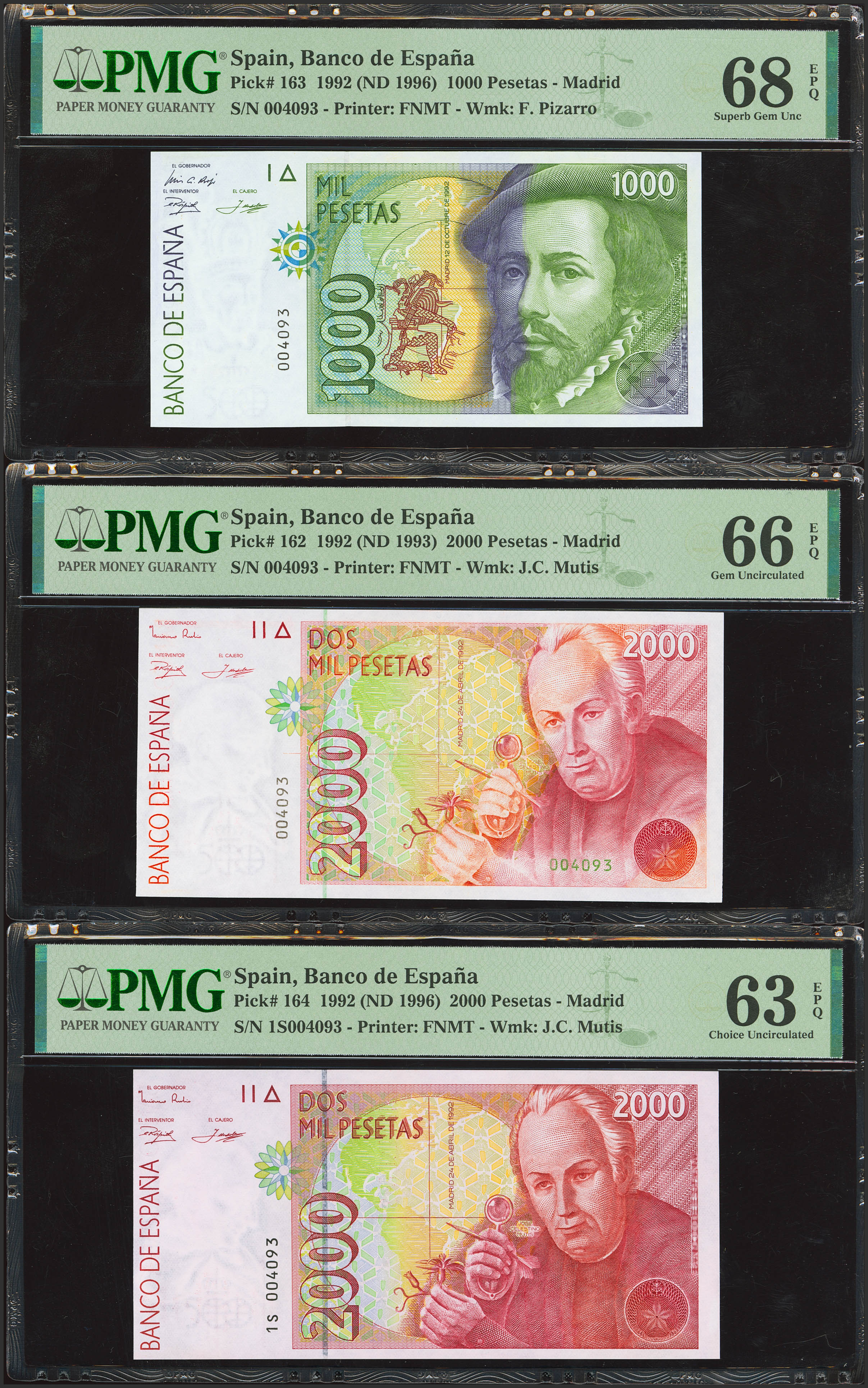 Serie completa de 5 billetes de la emisión de 1992 (incluyendo el de 2000 Pesetas de 1995 con la serie 1S). Sin serie y todos ellos con la misma baja numeración 004093. (Edifil 2023: 482/85, 482A). Rarísimo conjunto, especialmente en esta excepcional calidad. SC. Encapsulados PMG68EPQ, 66EPQ, 63EPQ, 66EPQ, 67EPQ.