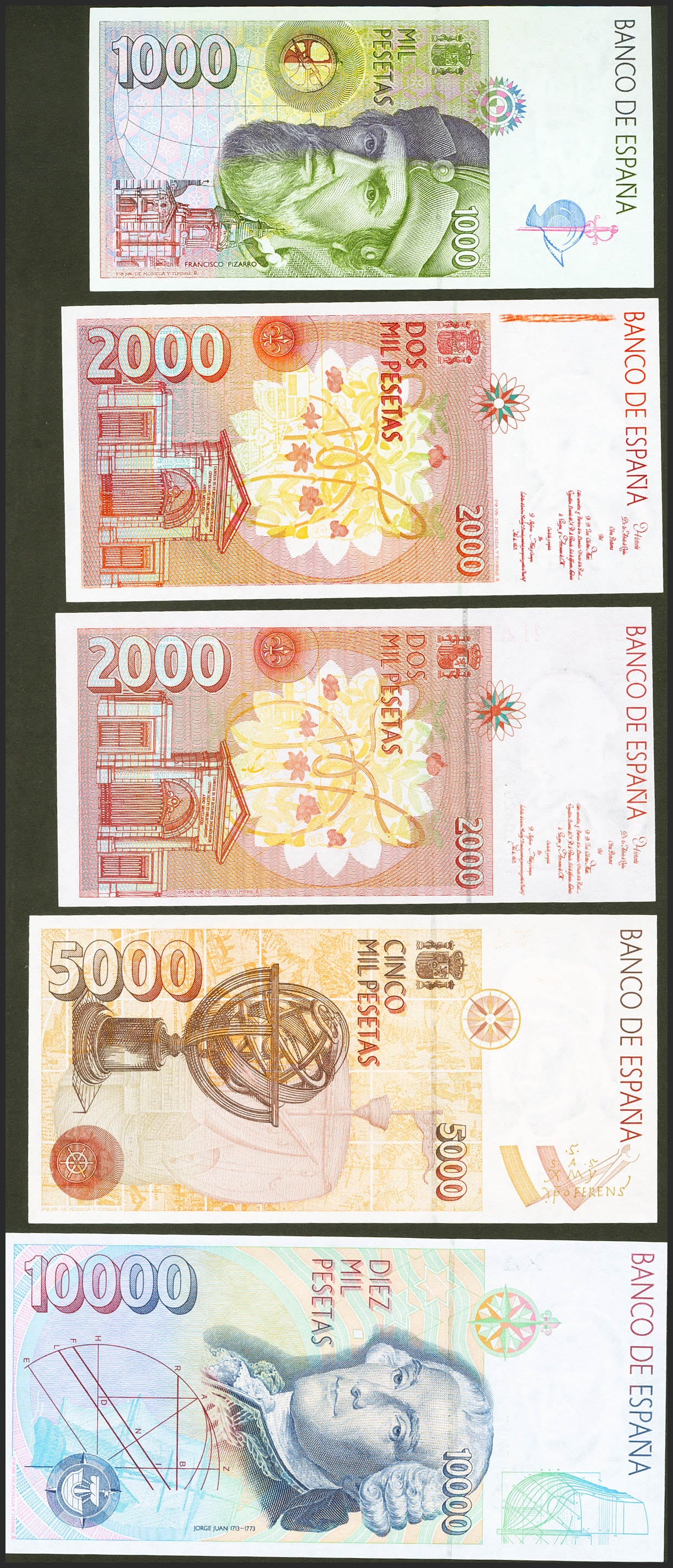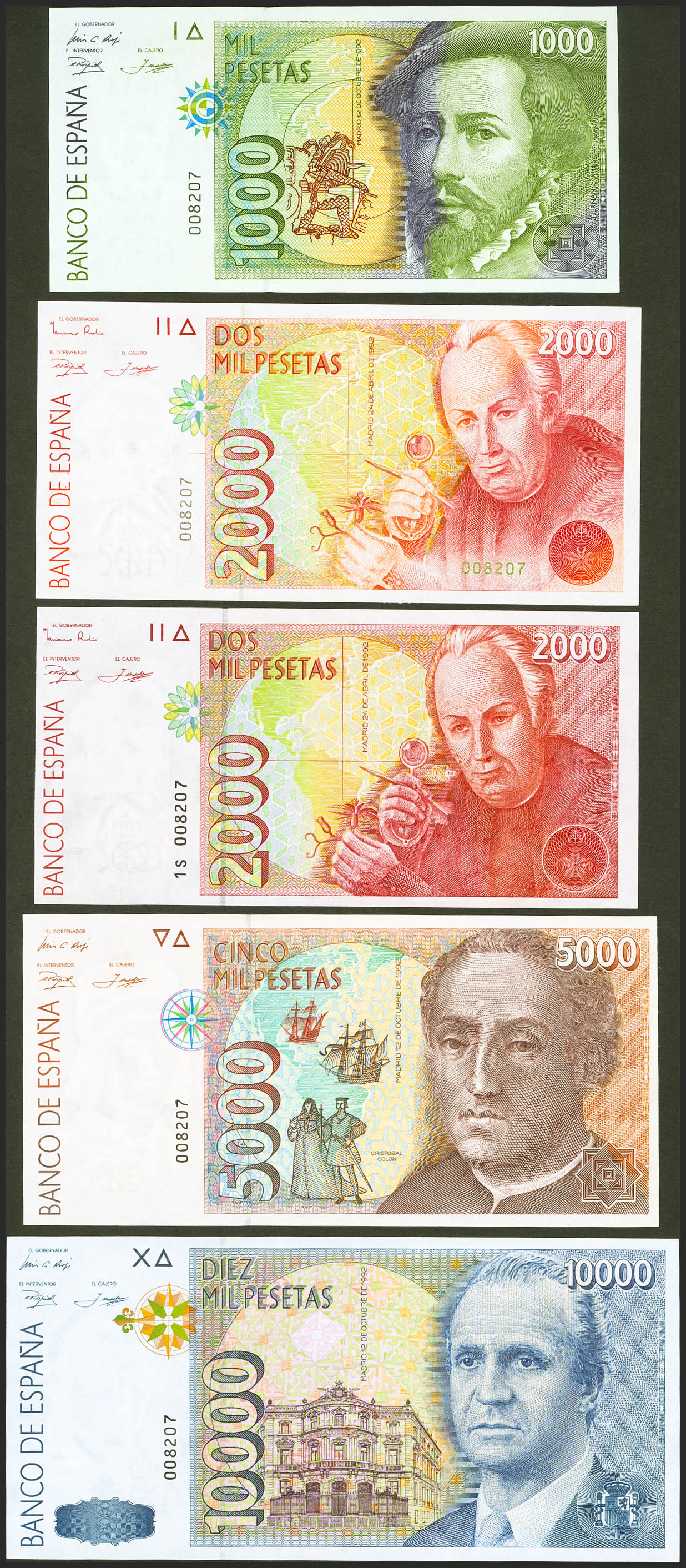 Serie completa de los billetes de 1000, 2000 (además otro con la numeración 1S), 5000 y 10000 Pesetas emitidos en 1992 y todos ellos con el mismo número de serie Nº008207. (Edifil 2017: 482/85, 482A). Raro conjunto. SC.