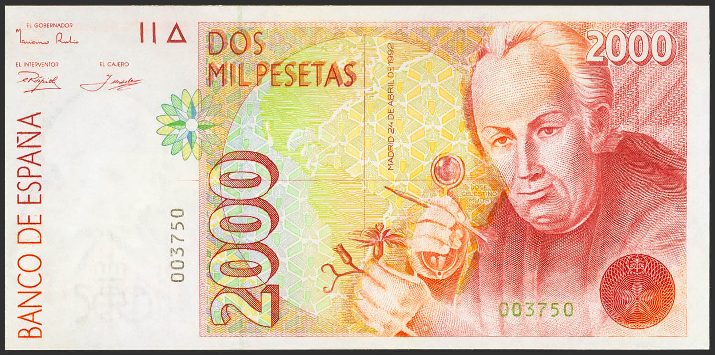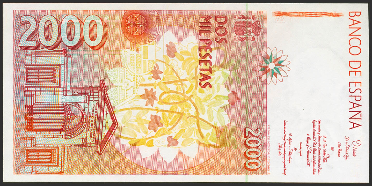 2000 Pesetas. 24 de Abril de 1992. Sin serie y numeración bajísima. (Edifil 2021: 482). SC.