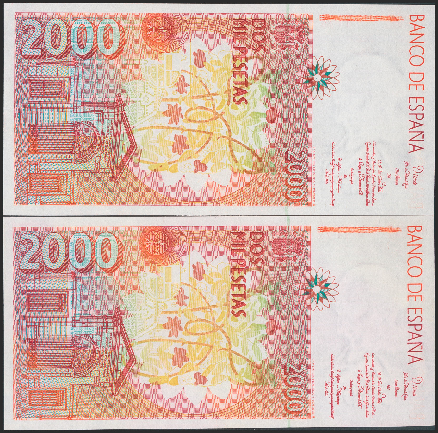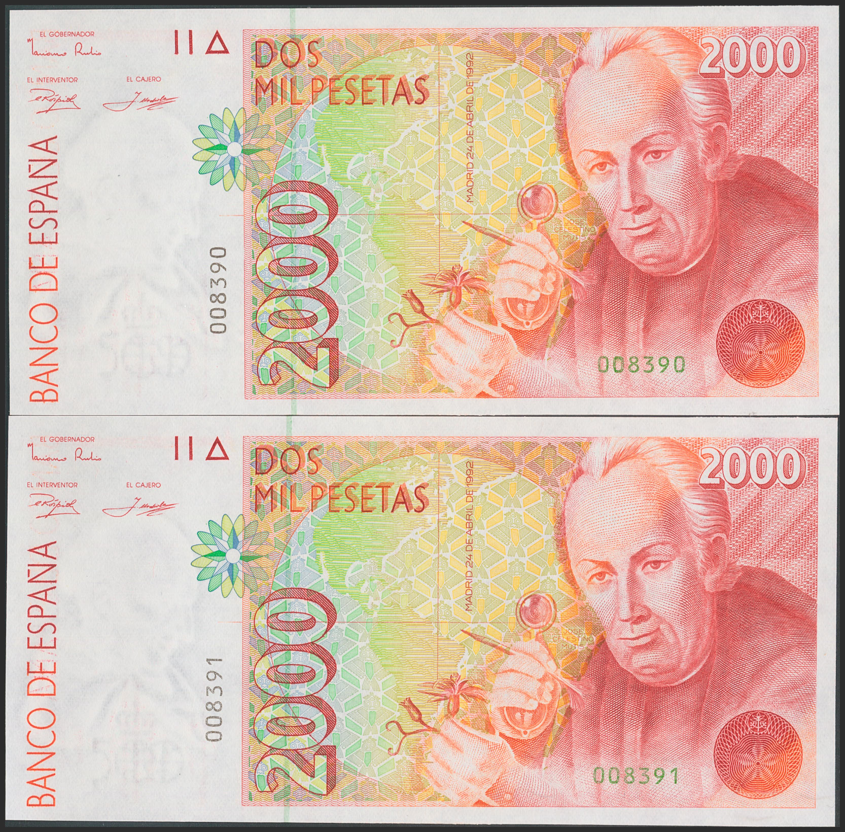 2000 Pesetas. 24 de Abril de 1992. Pareja correlativa. Sin serie y numeración baja. (Edifil 2017: 482). SC.