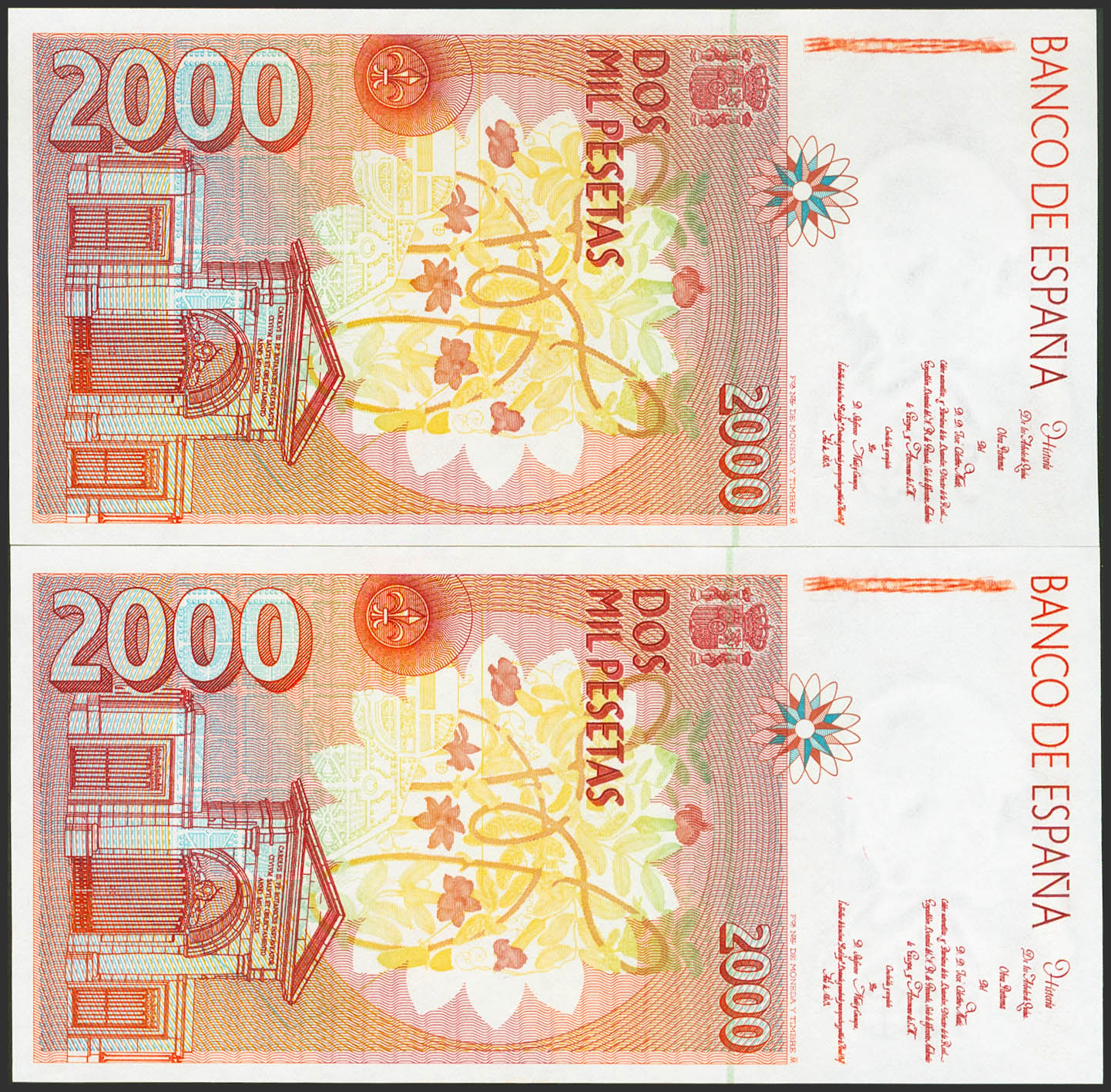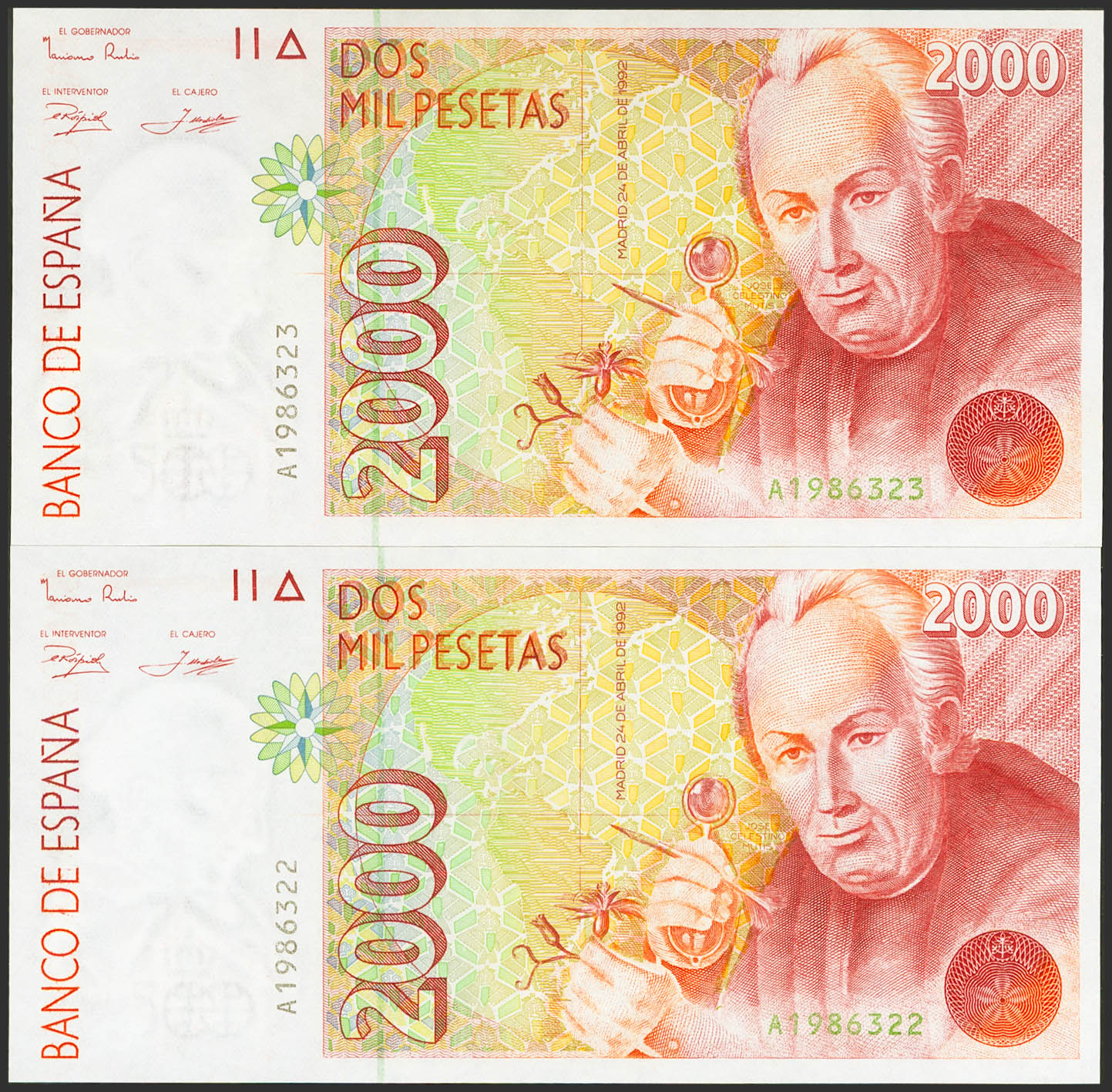 2000 Pesetas. 24 de Abril de 1992. Pareja correlativa. Serie A. (Edifil 2023: 482a). SC.