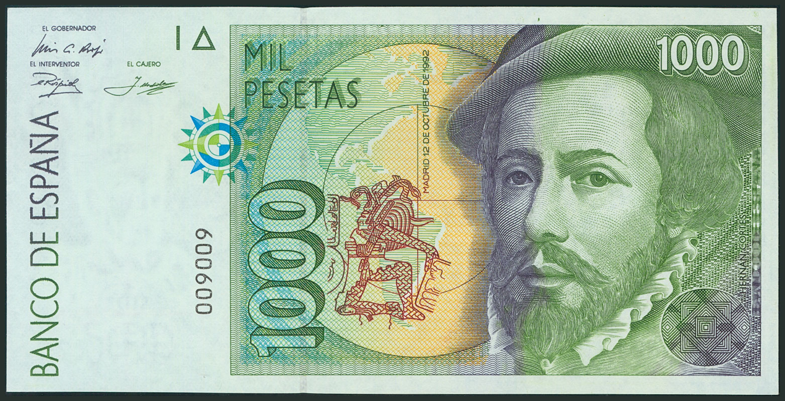 1000 Pesetas. 12 de Octubre de 1992. Sin serie y numeración baja y capicúa imperfecto. (Edifil 2017: 483). SC.