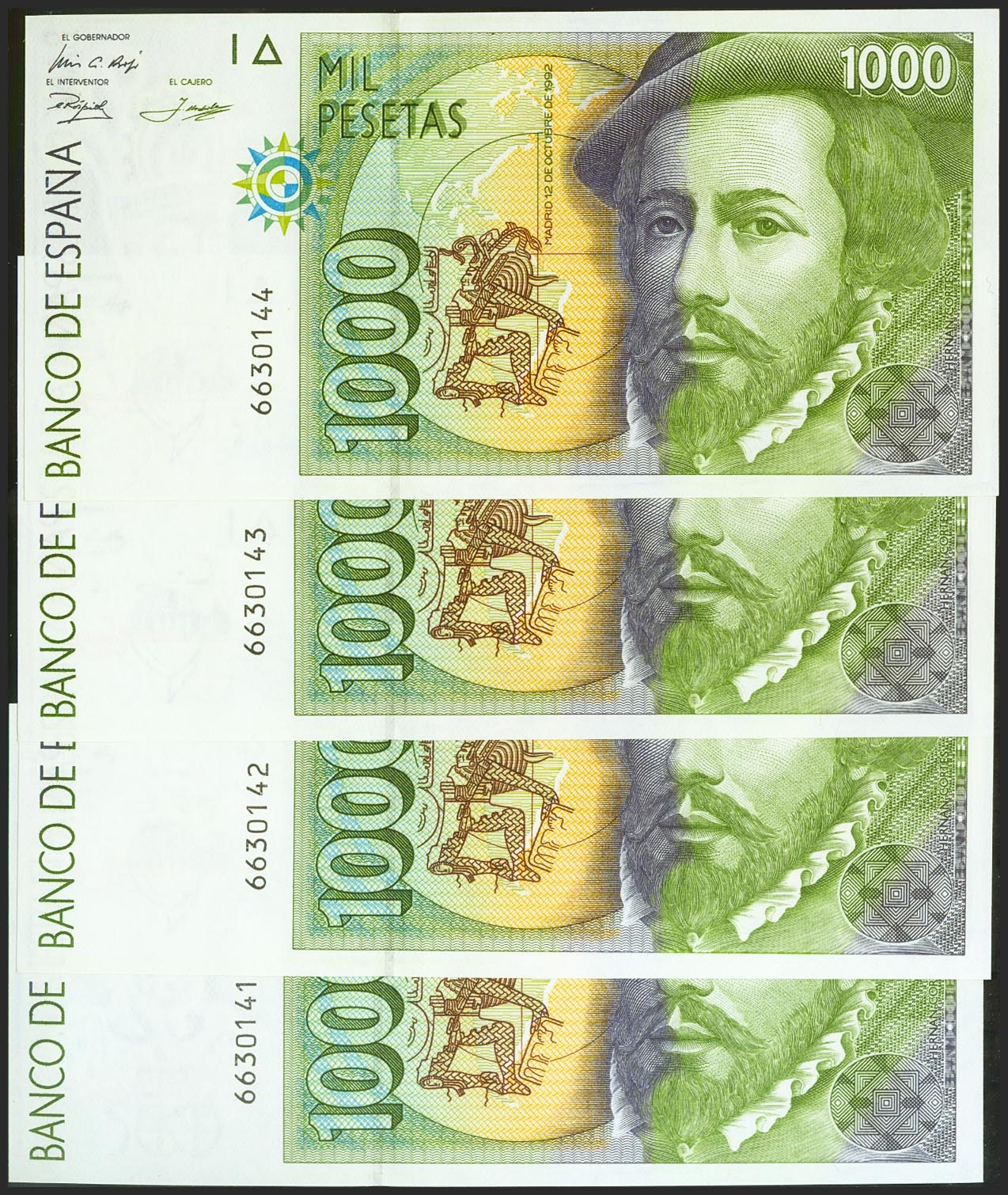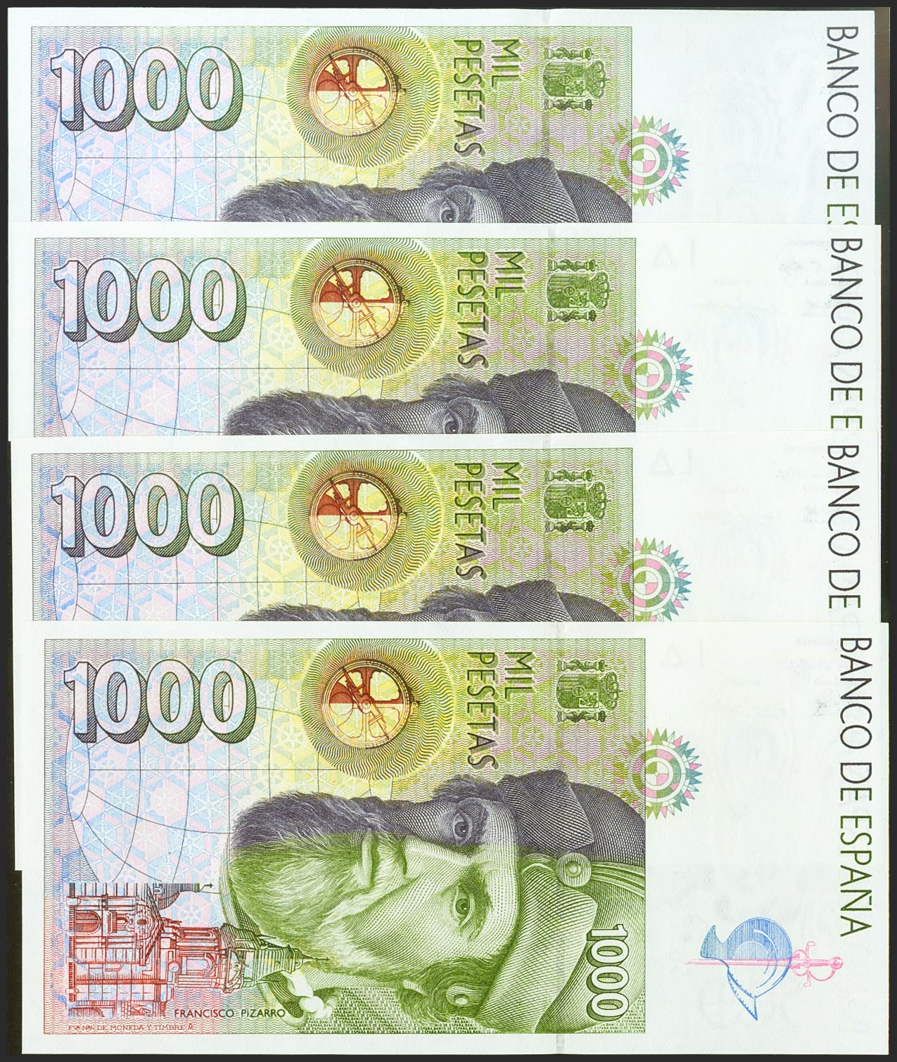 Conjunto de 4 billetes de 1000 Pesetas, emitidos el 12 de Octubre de 1992, sin serie. (Edifil 2021: 483). SC.