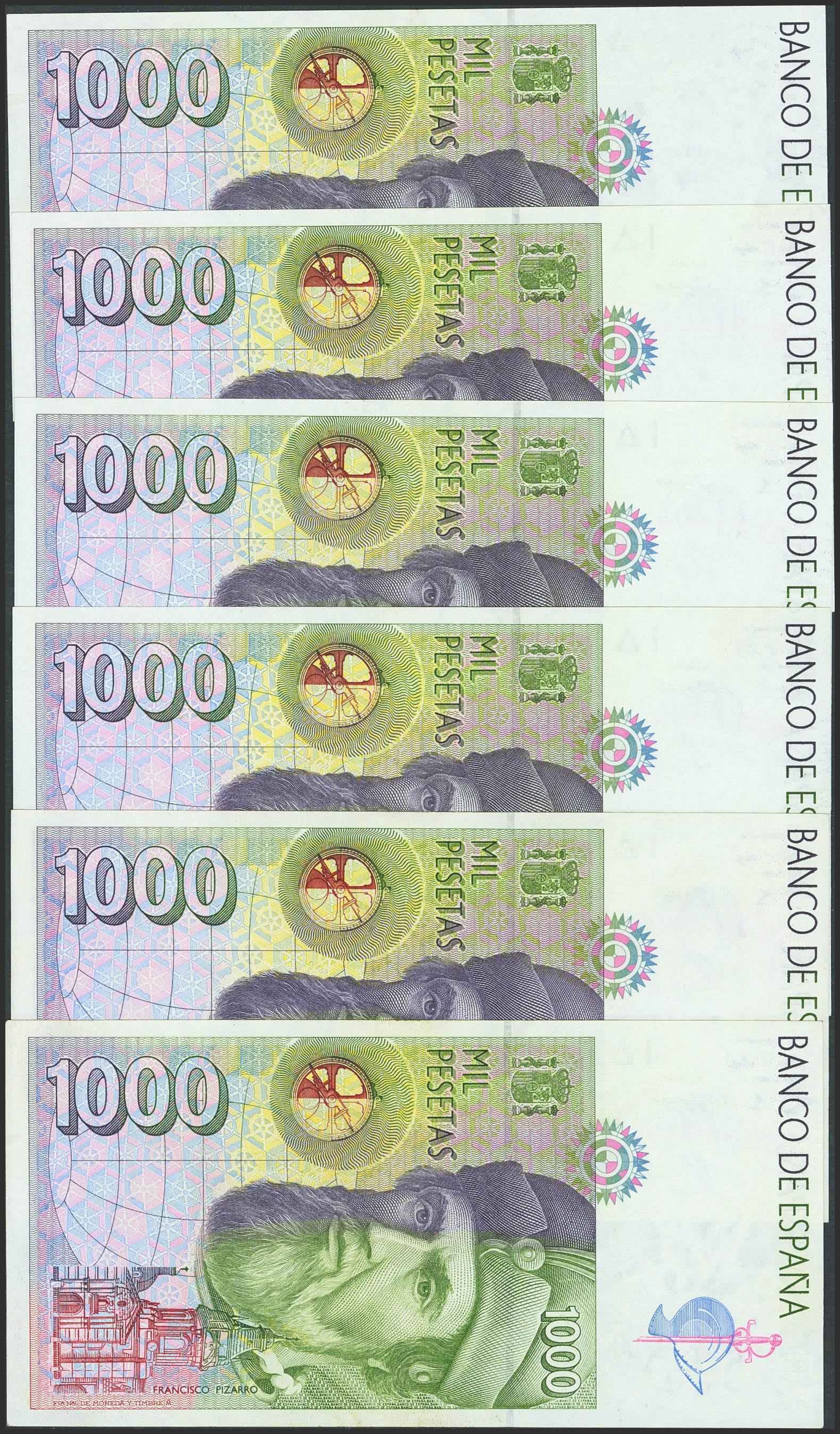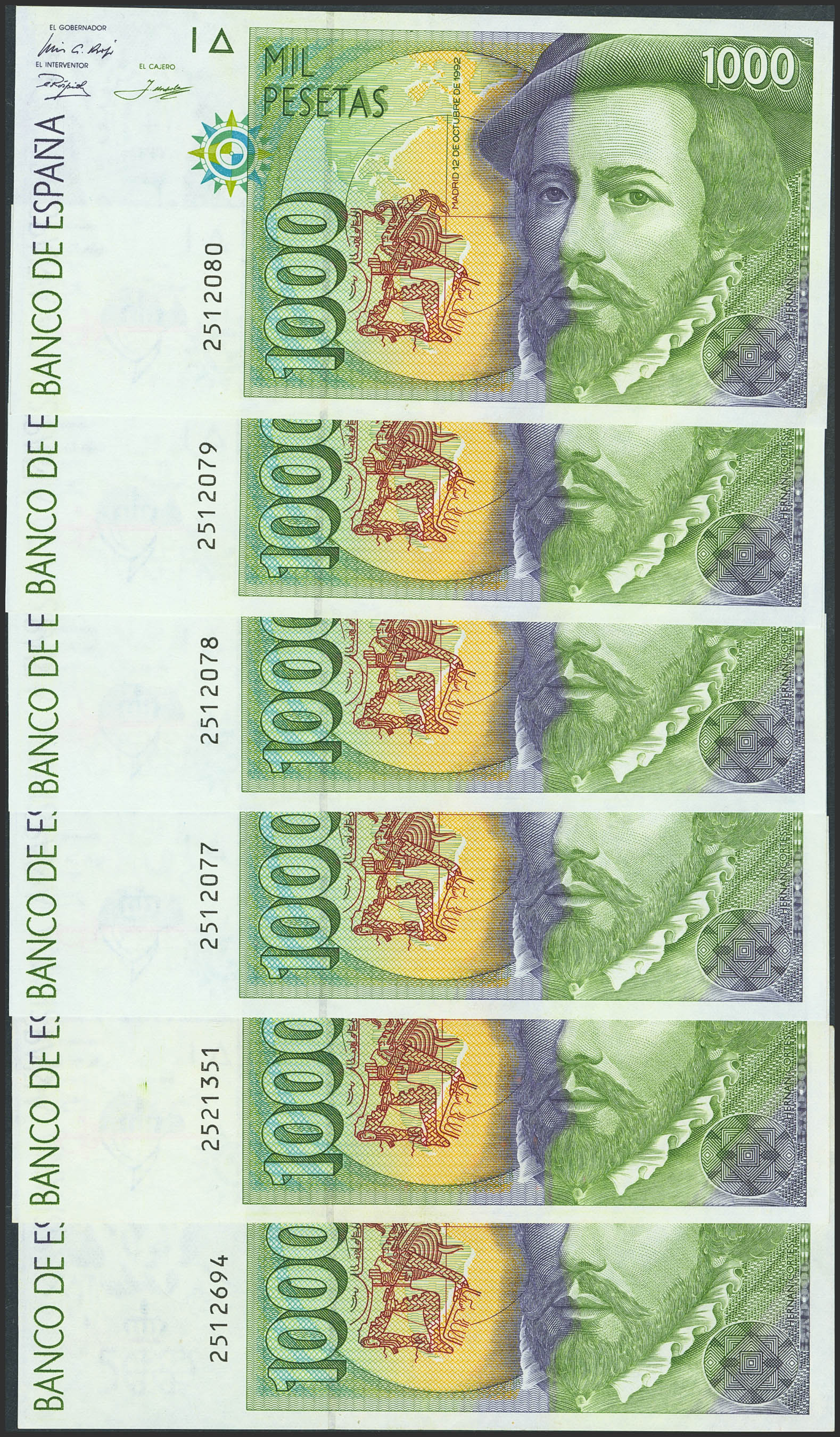 Conjunto de 4 billetes correlativos y 2 billetes de 1000 Pesetas emitidos el 12 de Octubre de 1992 y sin serie. (Edifil 2023: 483). EBC+/SC.