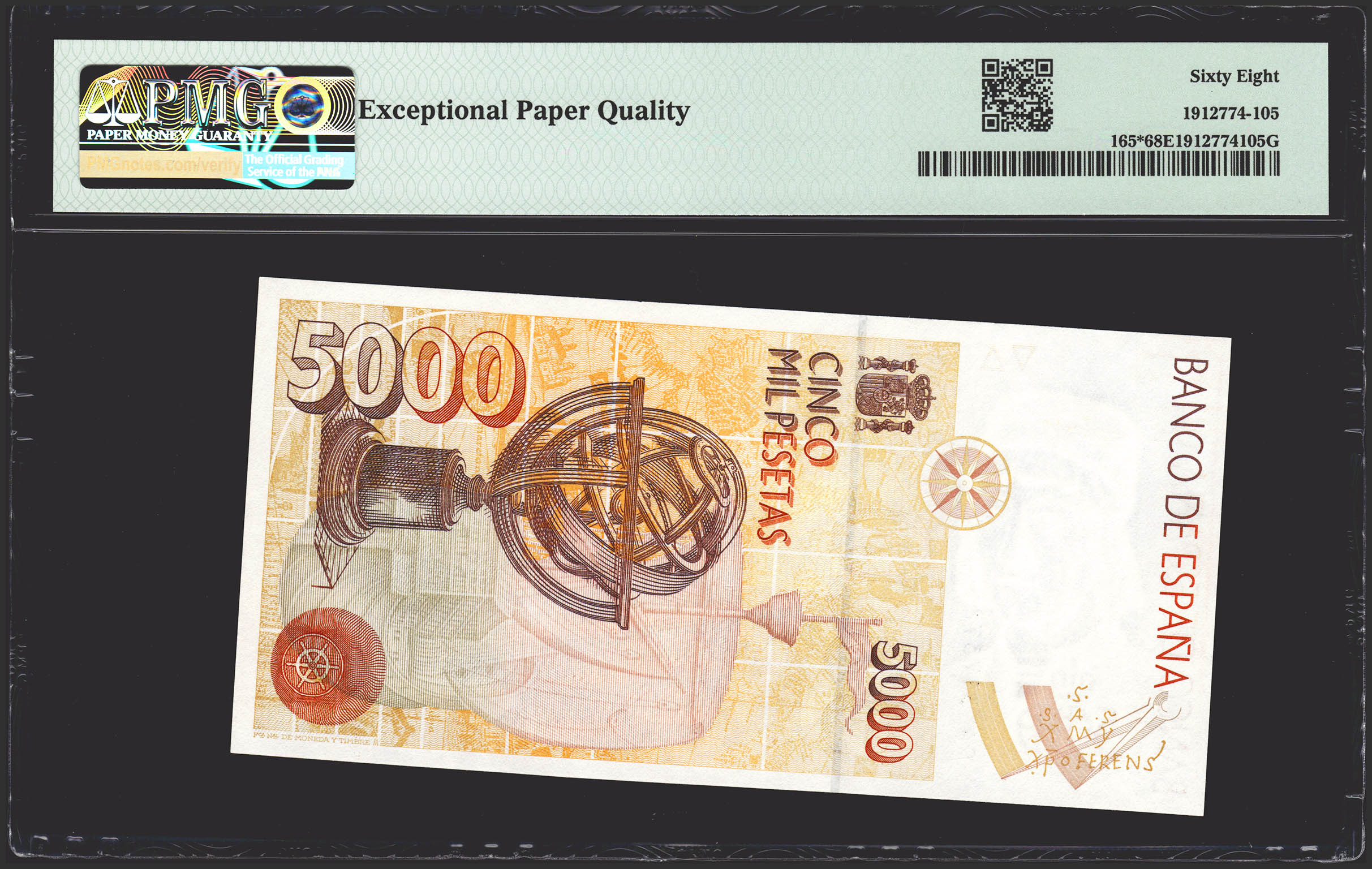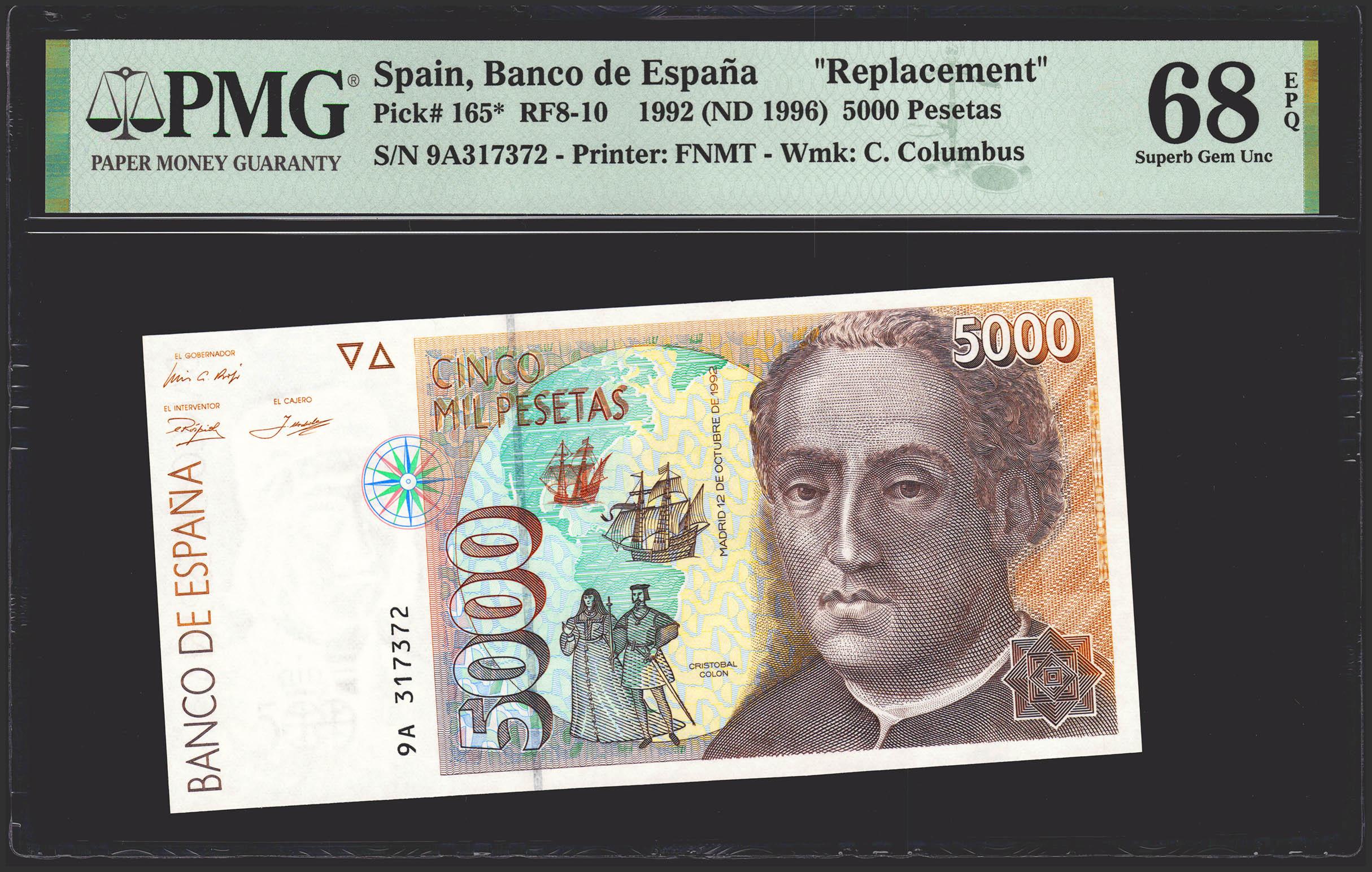 5000 Pesetas. 12 de Octubre de 1992. Serie especial 9A. (Edifil 2021: 484b, Pick: 165*). Rarísimo en esta excepcional calidad. SC. Encapsulado PMG68EPQ.