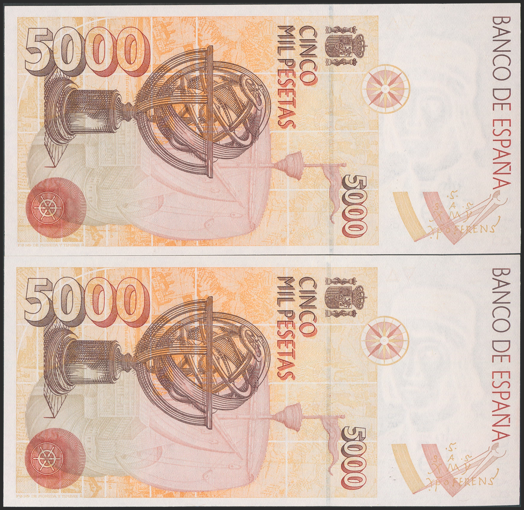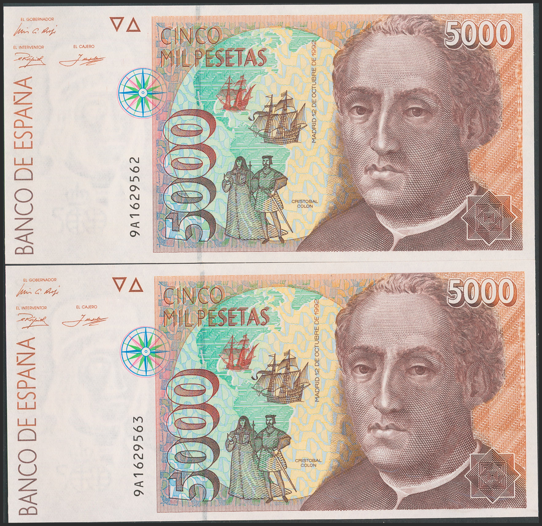 5000 Pesetas. 12 de Octubre de 1992. Pareja correlativa. Serie 9A, numeración especial. (Edifil 2017: 484b). SC.