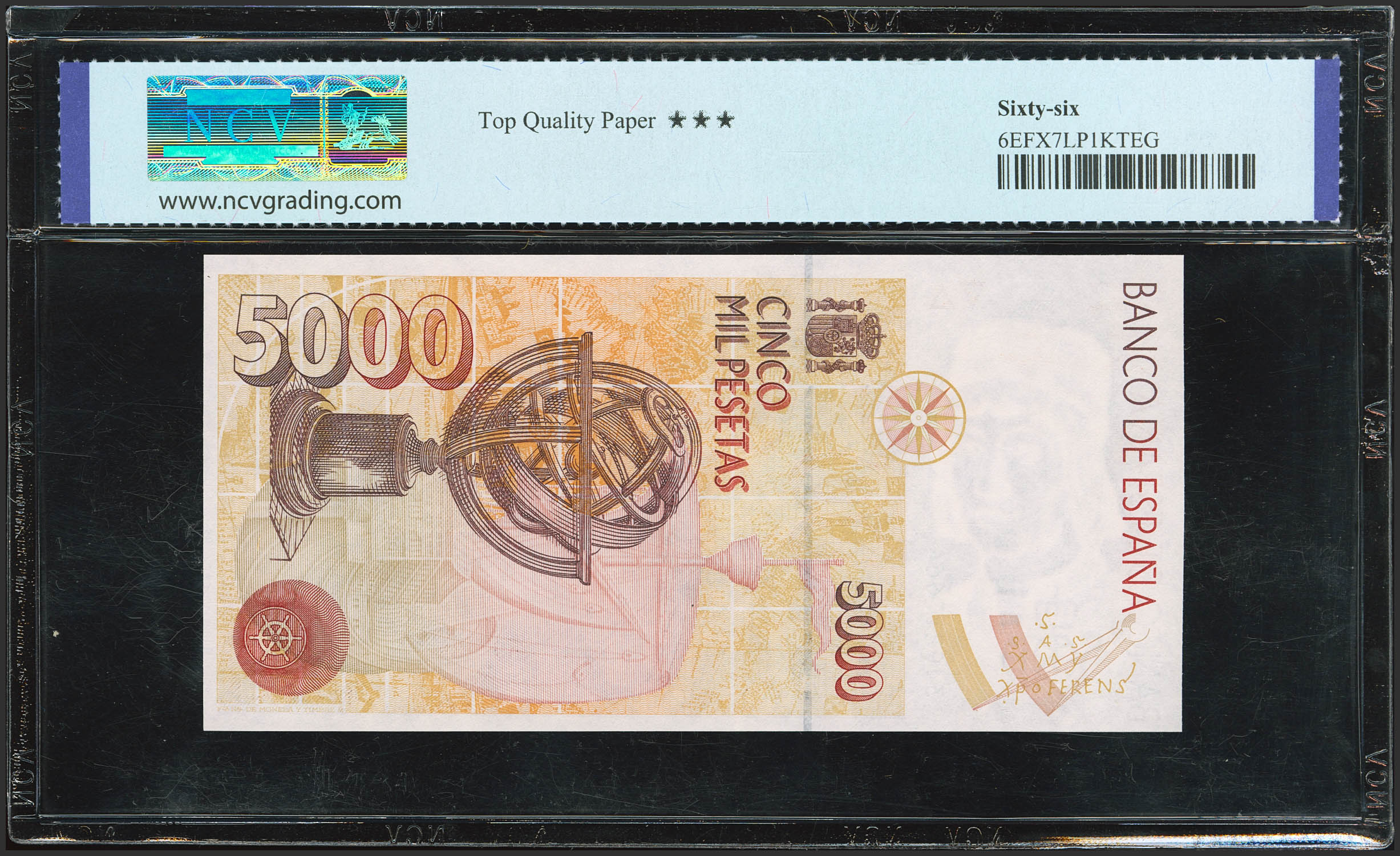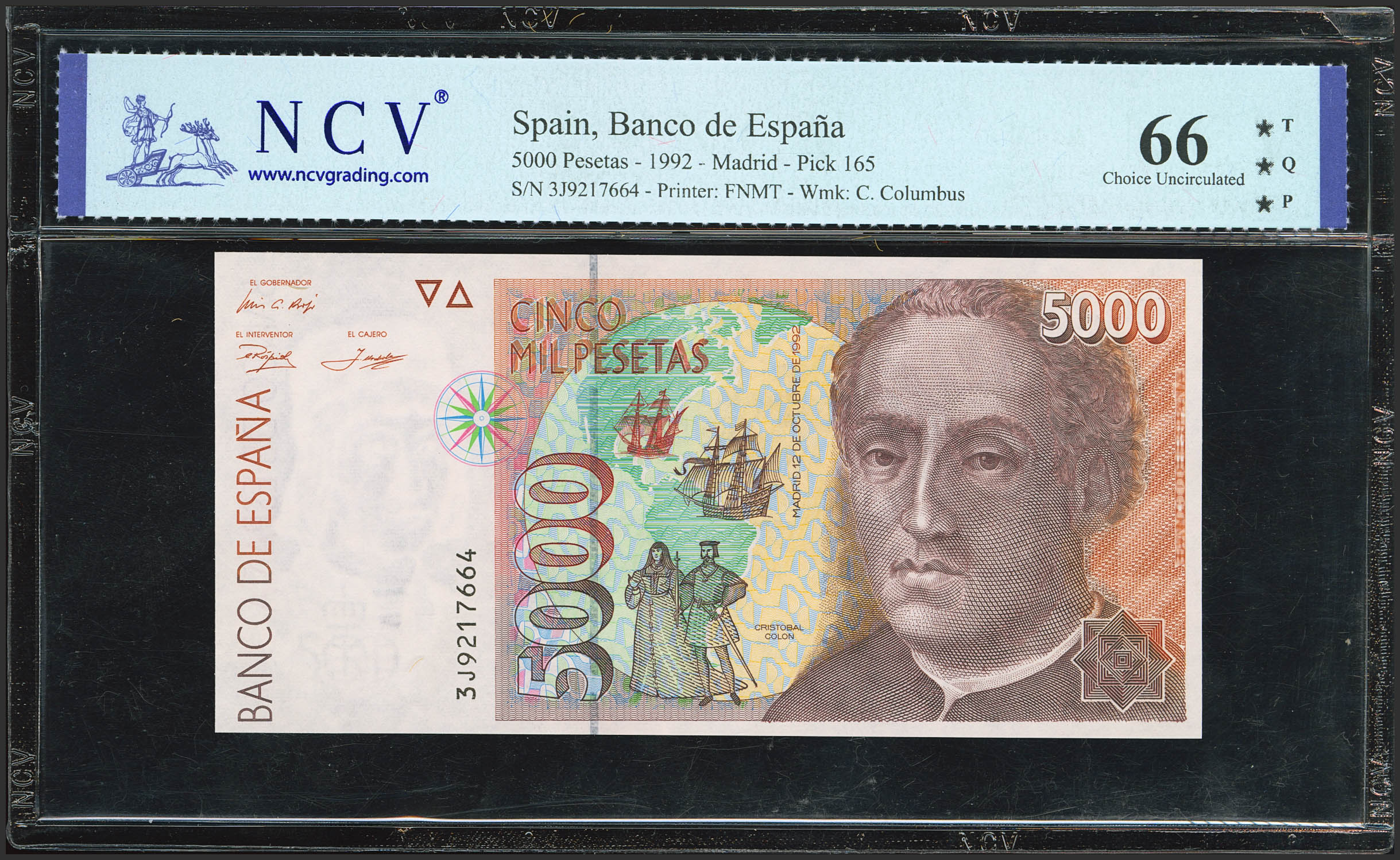 5000 Pesetas. 12 de Octubre de 1992. Serie 3J. (Edifil 2023: 484a, Pick: 165). SC. Encapsulado NCV66TQP.