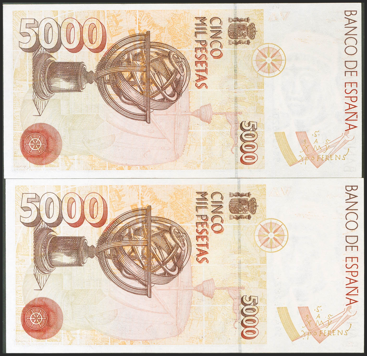 5000 Pesetas. 12 de Octubre de 1992. Pareja correlativa. Serie 5Q. (Edifil 2021: 484a). SC.