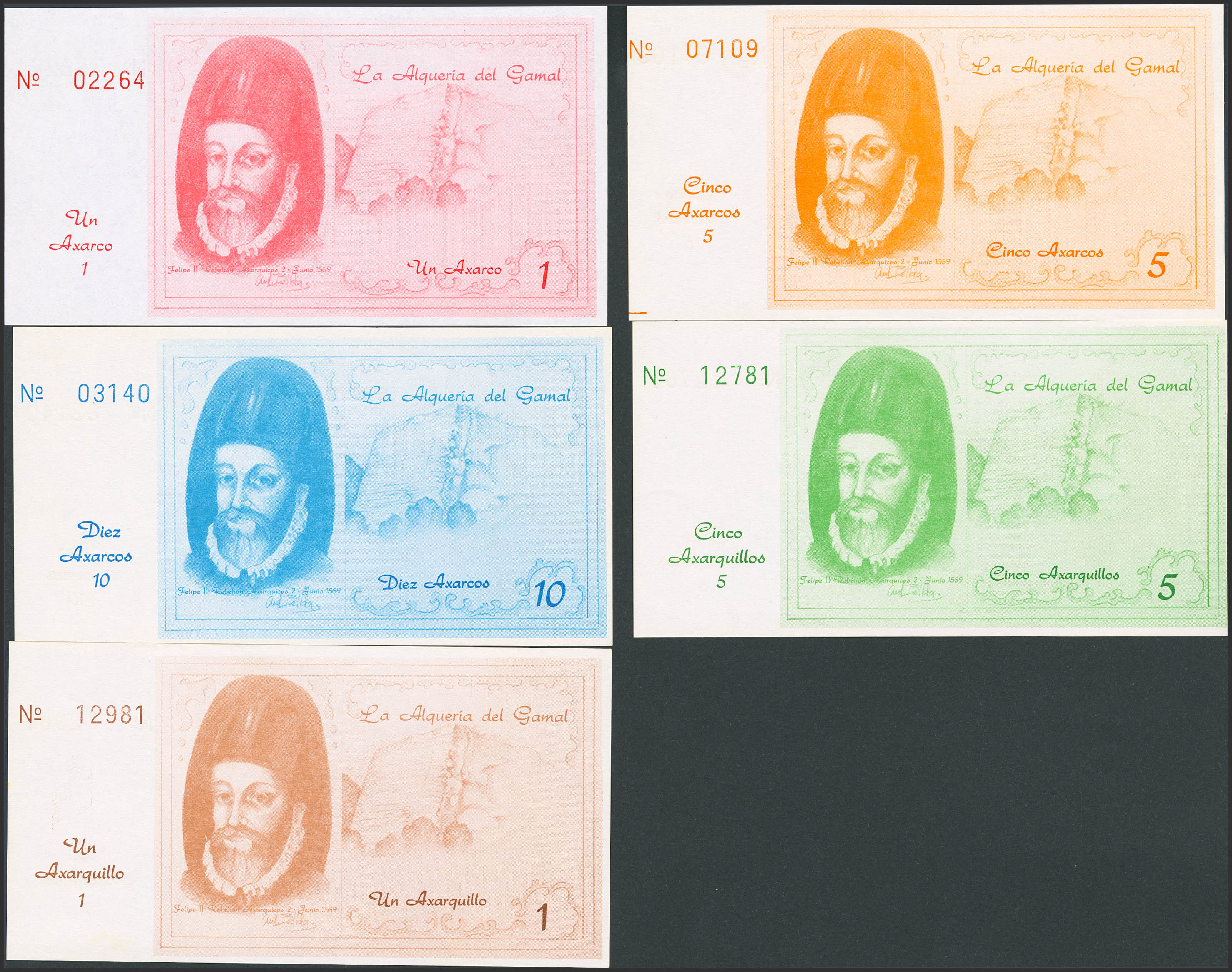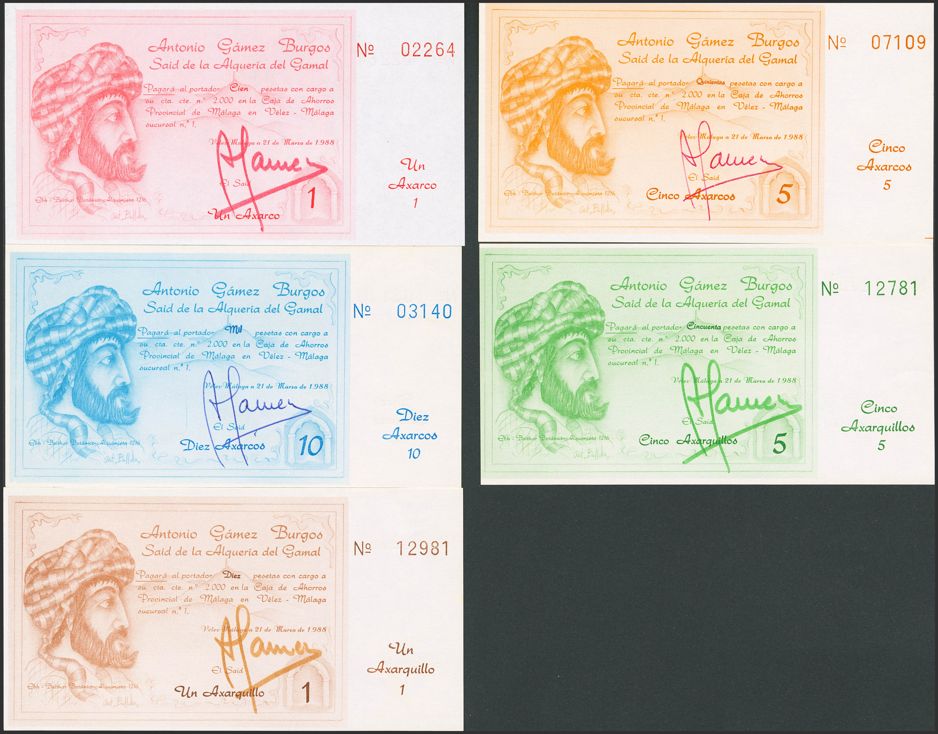 Serie de 5 billetes de 1 y 5 Axarquillos y de 1, 5 y 10 Axarcos. 21 Marzo 1988. Vélez, Málaga. Antonio Gámez Burgos, Said de la Arquería de Gamal. SC/SC-.