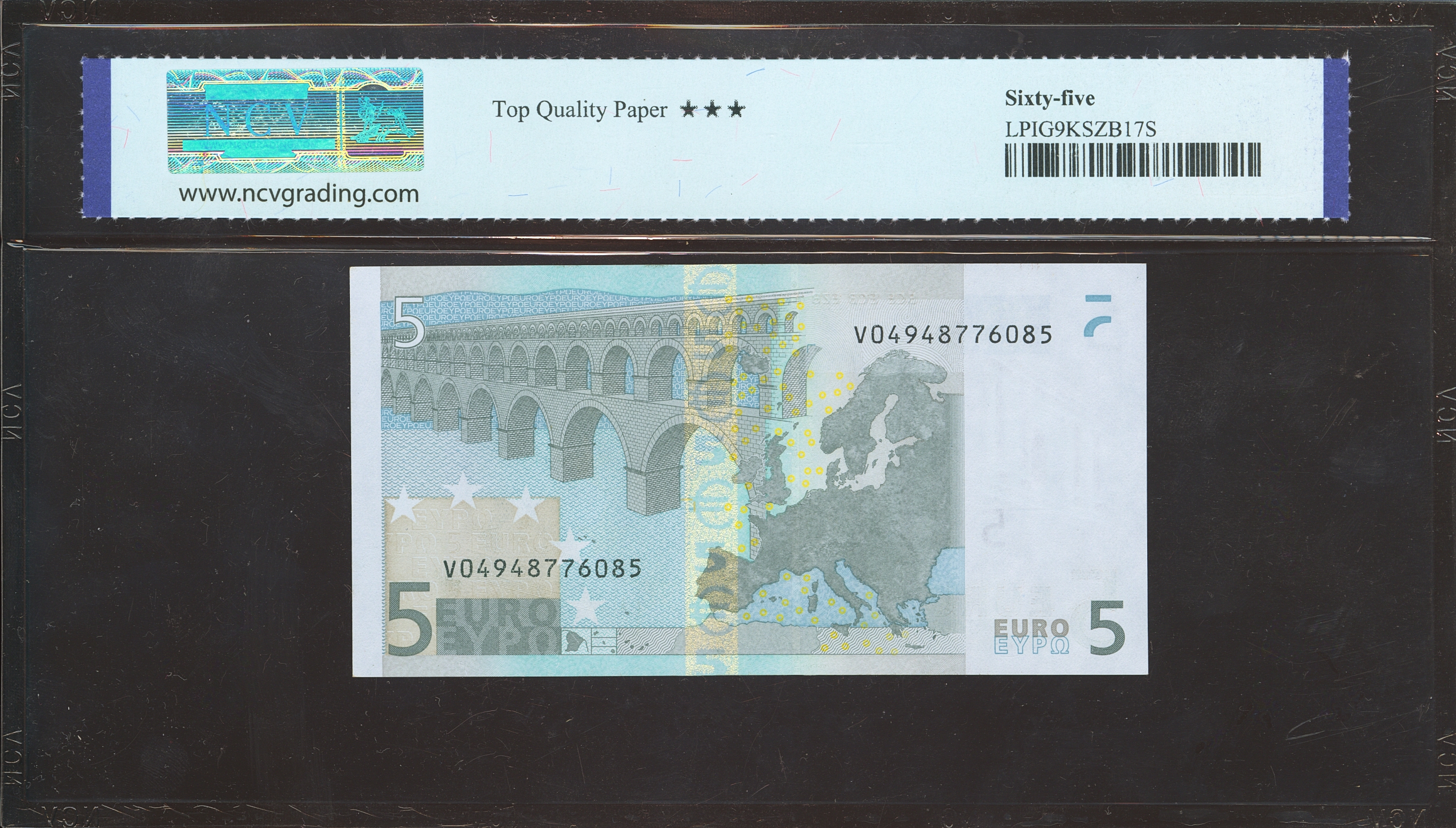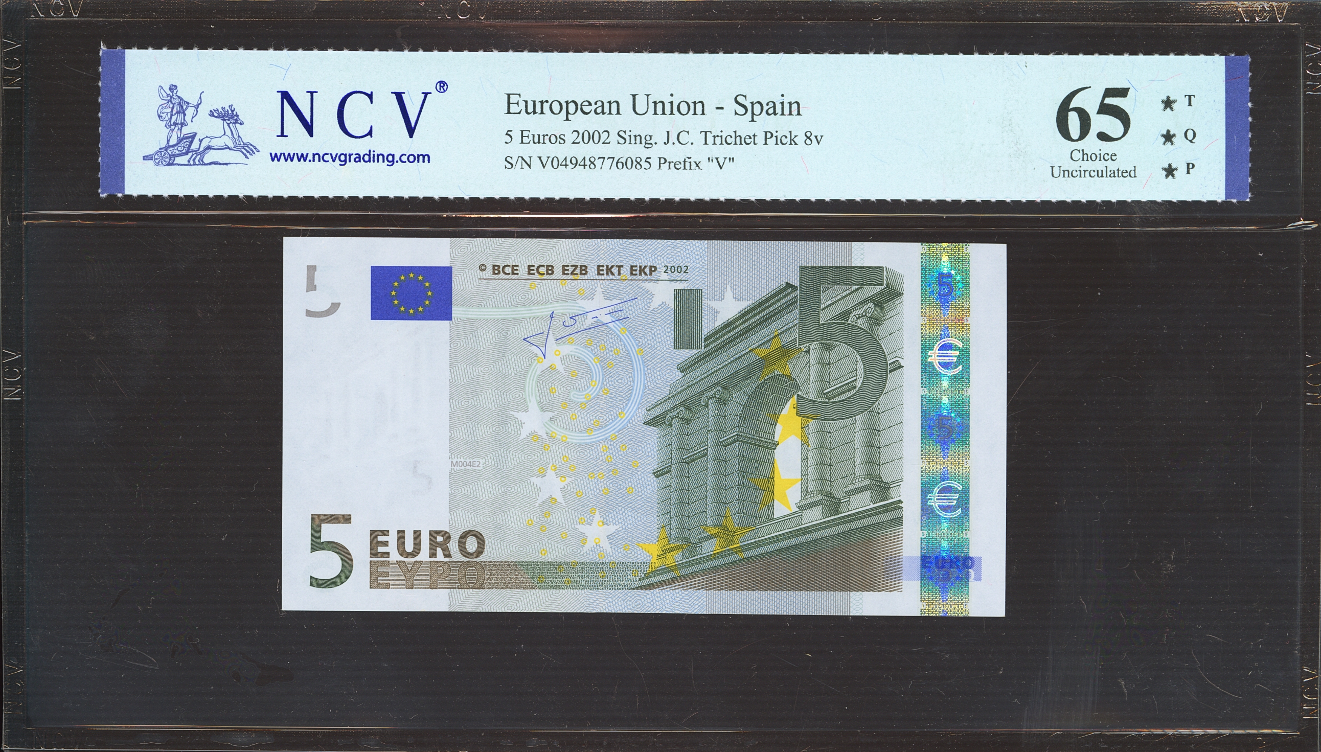 5 Euros. 1 de Enero de 2002. Firma Trichet. Serie V (España). (Edifil 2023: 486A). SC. Encapsulado NCV65TQP.