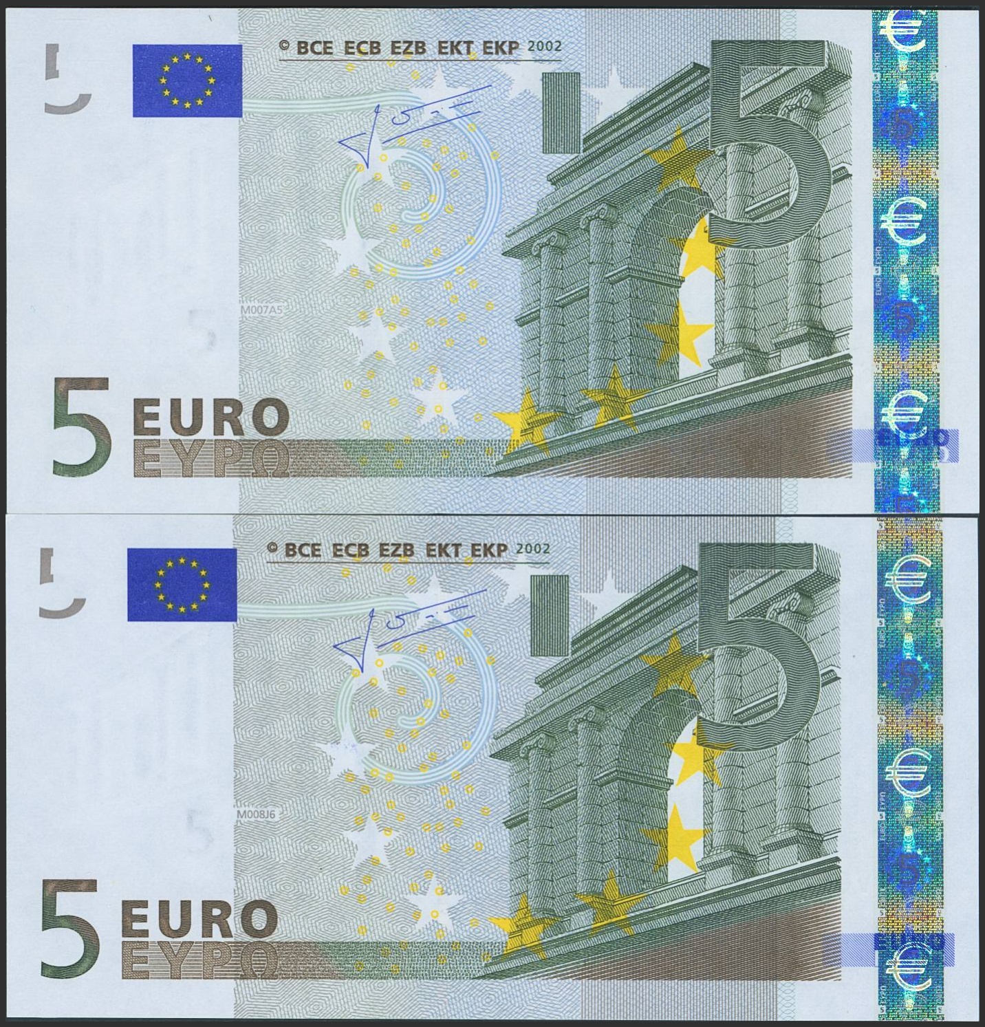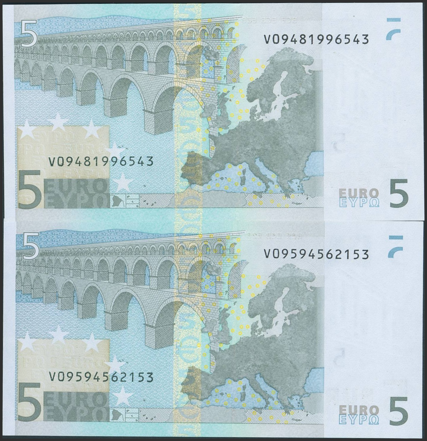 Conjunto de 2 billetes de 5 Euros, emitidos el 1 de Enero de 2002 con la Firma Trichet y la serie V (España). (Edifil 2023: 486A). SC.
