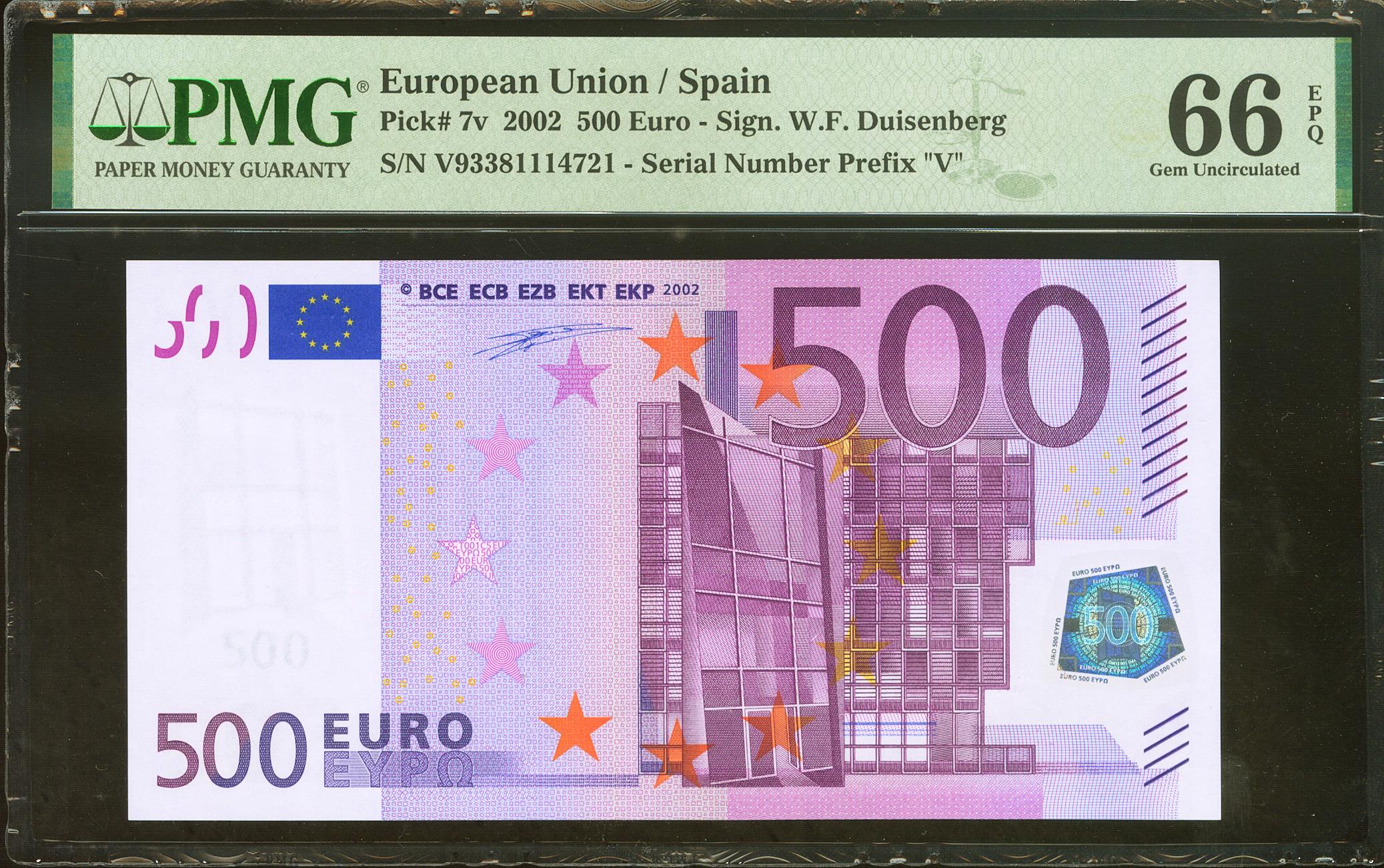 500 Euros. 1 de Enero de 2002. Firma Duisenberg. Serie V (España). (Edifil 2021: 492). Inusual. SC. Encapsulado PMG66EPQ.