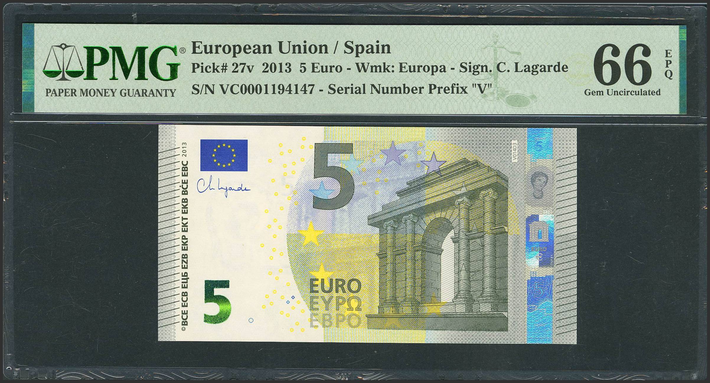 5 Euros. 2013. Firma Lagarde. Serie VC (España). (Edifil 2023: 493Aa, Pick: 27v). SC. Encapsulado PMG66EPQ.