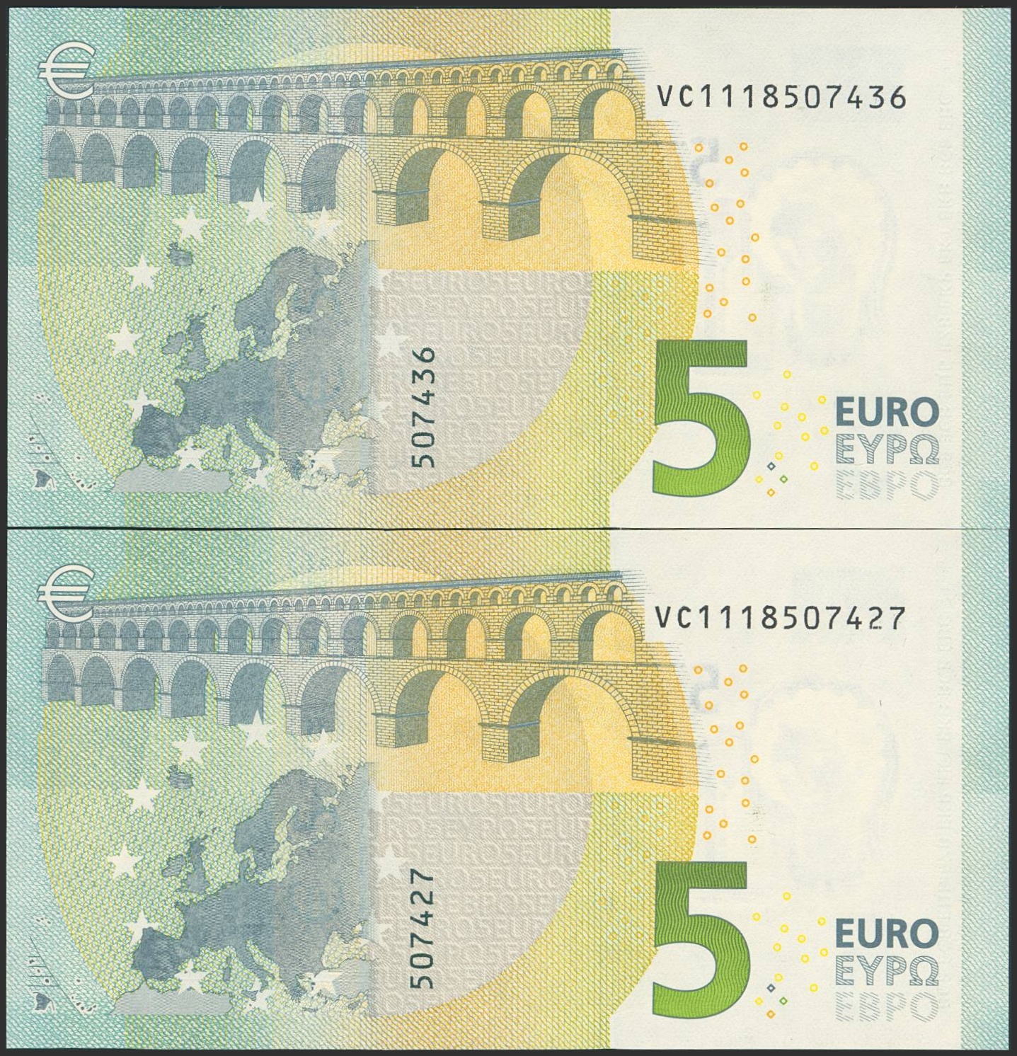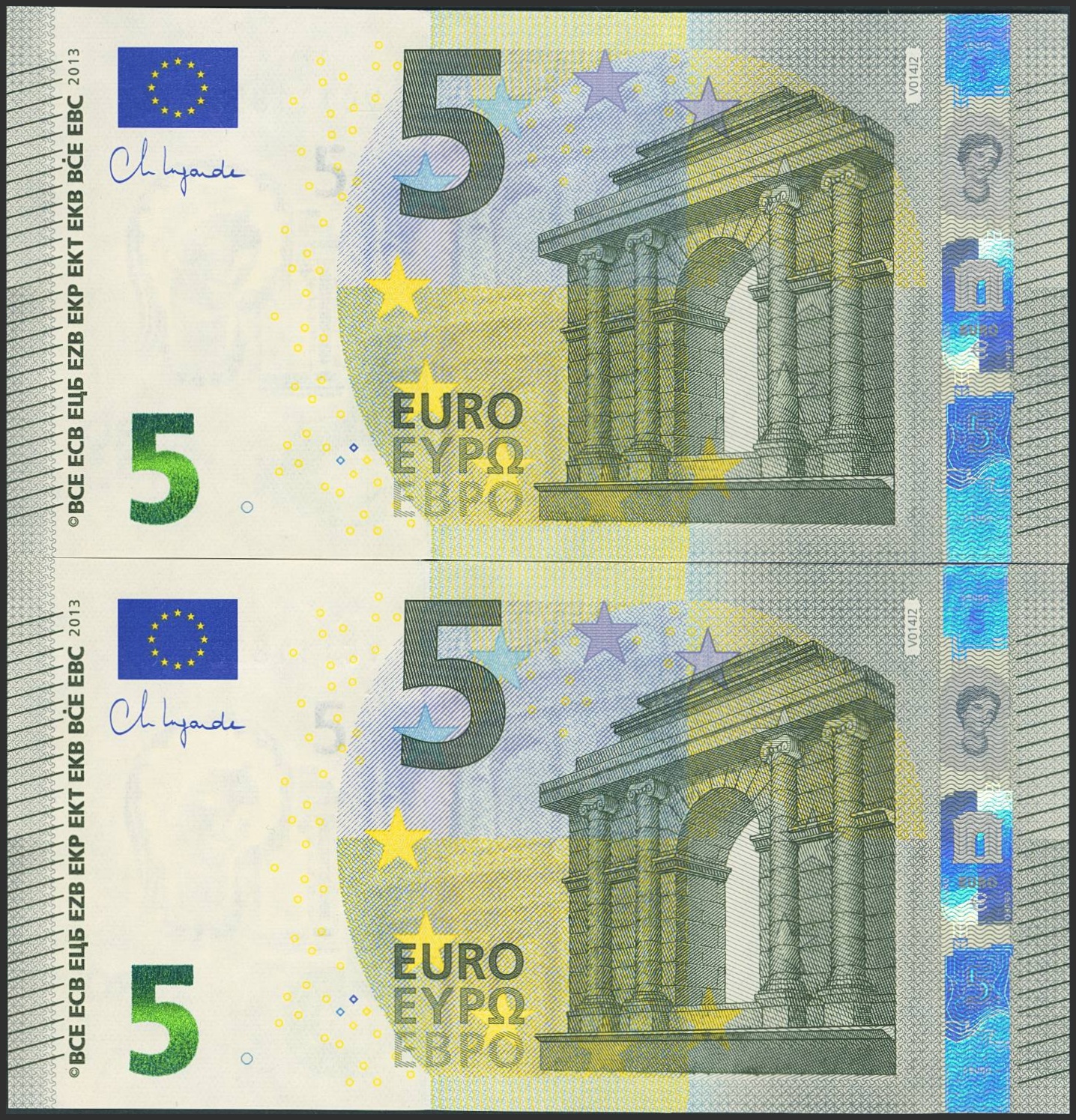 5 Euros. 2 de Mayo de 2013. Pareja correlativa (cabe recordar que el último dígito de la numeración de todos los billetes denominados en euros es para control interno del Banco Central Europeo, el que marca la correlatividad de los billetes es el penúltimo dígito). Firma Lagarde. Serie VC (España). (Edifil 2023: 493Aa). SC.