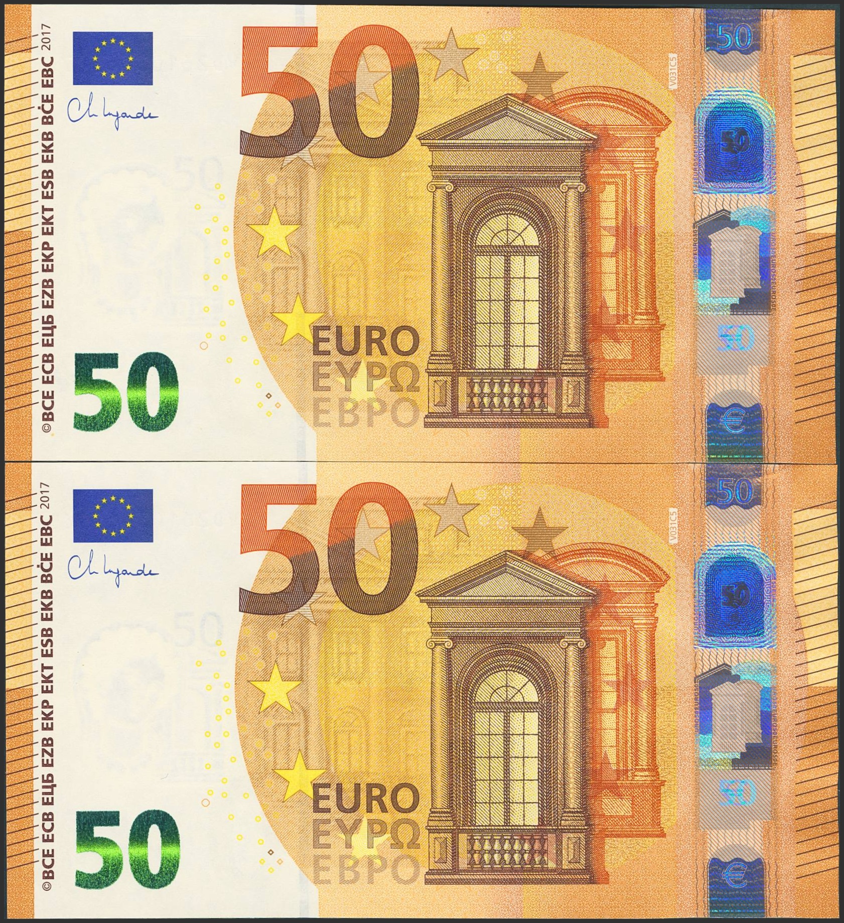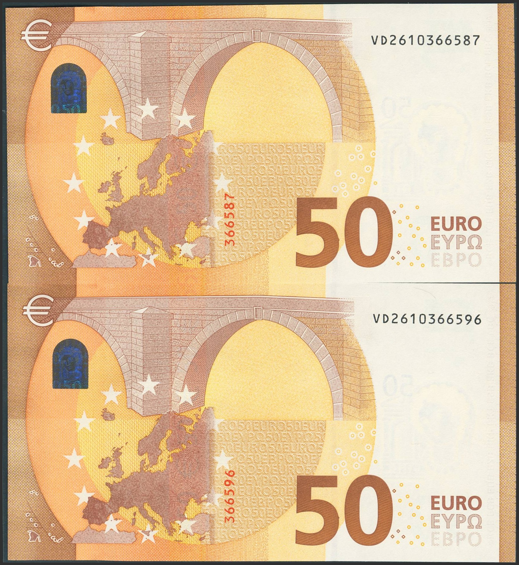 50 Euros. 4 de Abril de 2017. Pareja correlativa (cabe recordar que el último dígito de todos los billetes denominados en euros es para control interno del Banco Central Europeo, el que marca la correlatividad de los billetes es el penúltimo dígito). Firma Draghi. Serie VD (España). (Edifil 2023: 496Ab). SC.