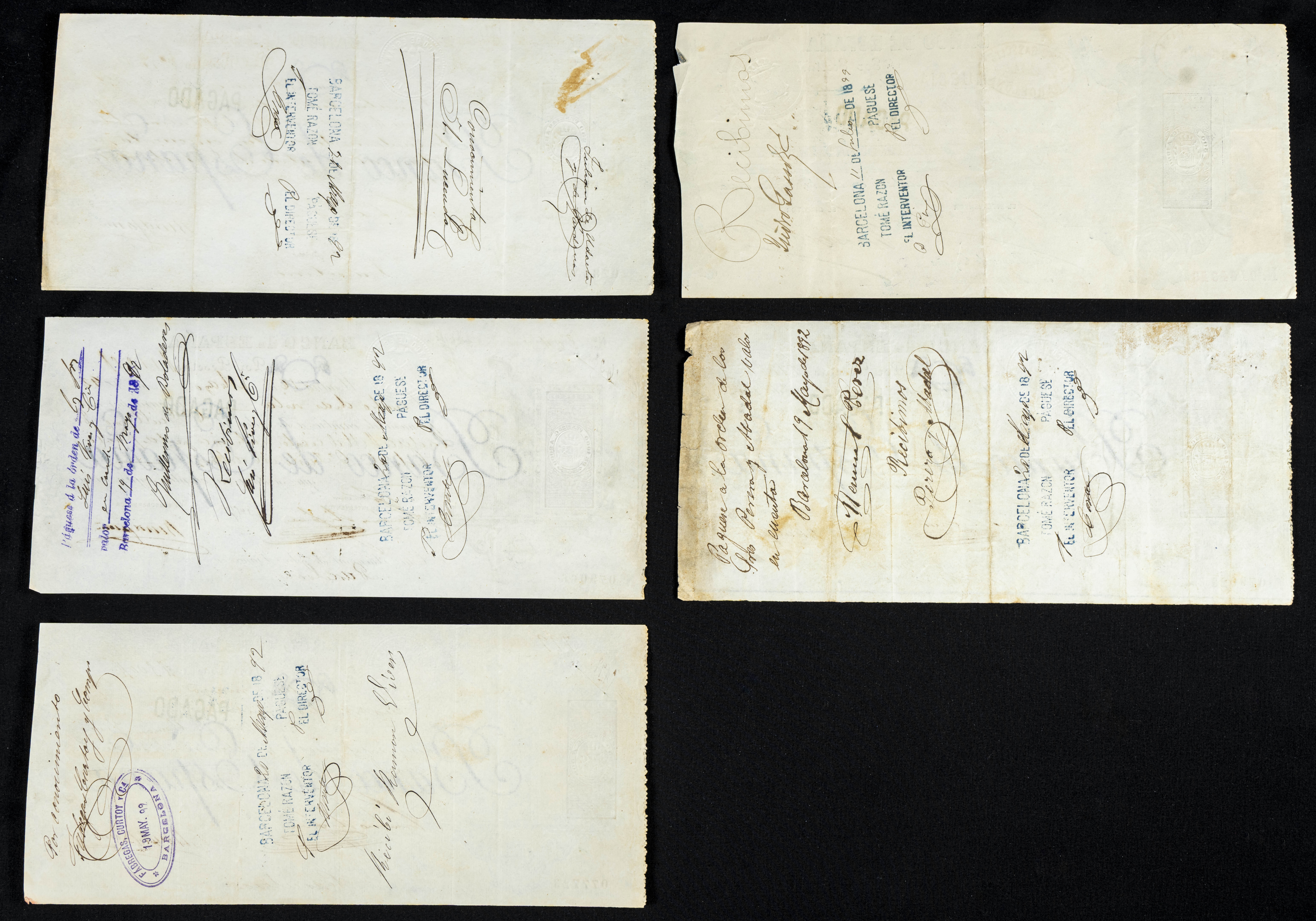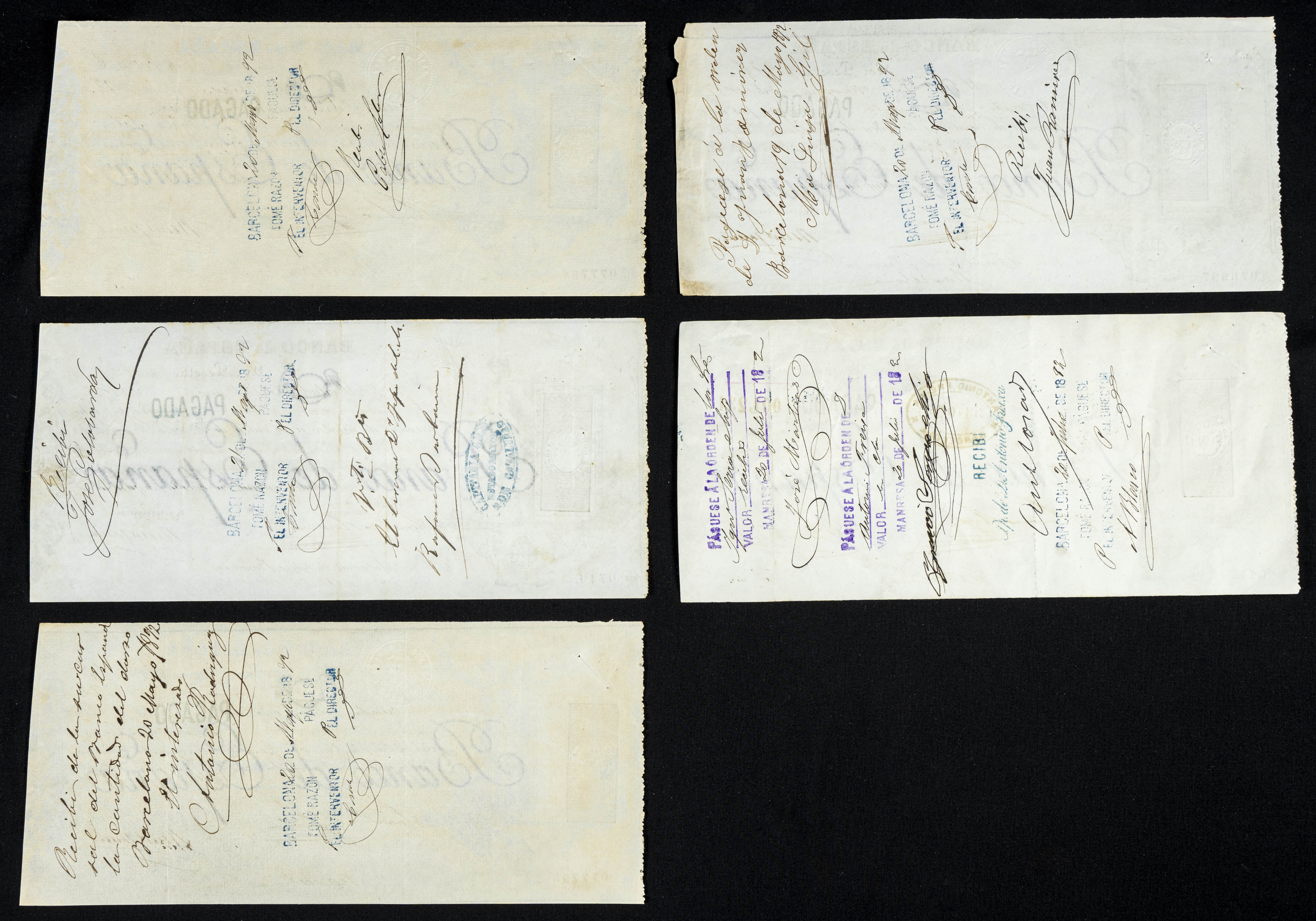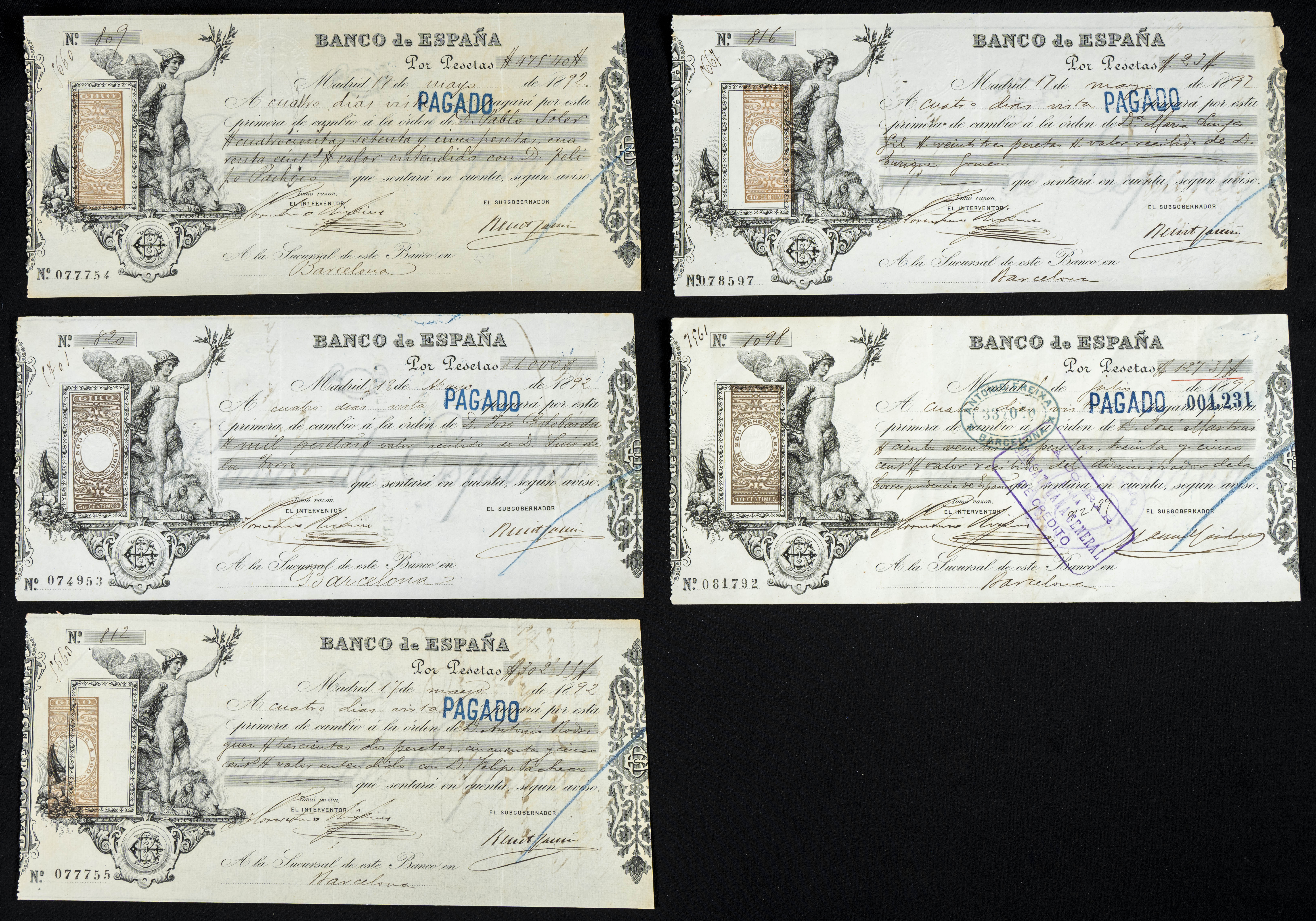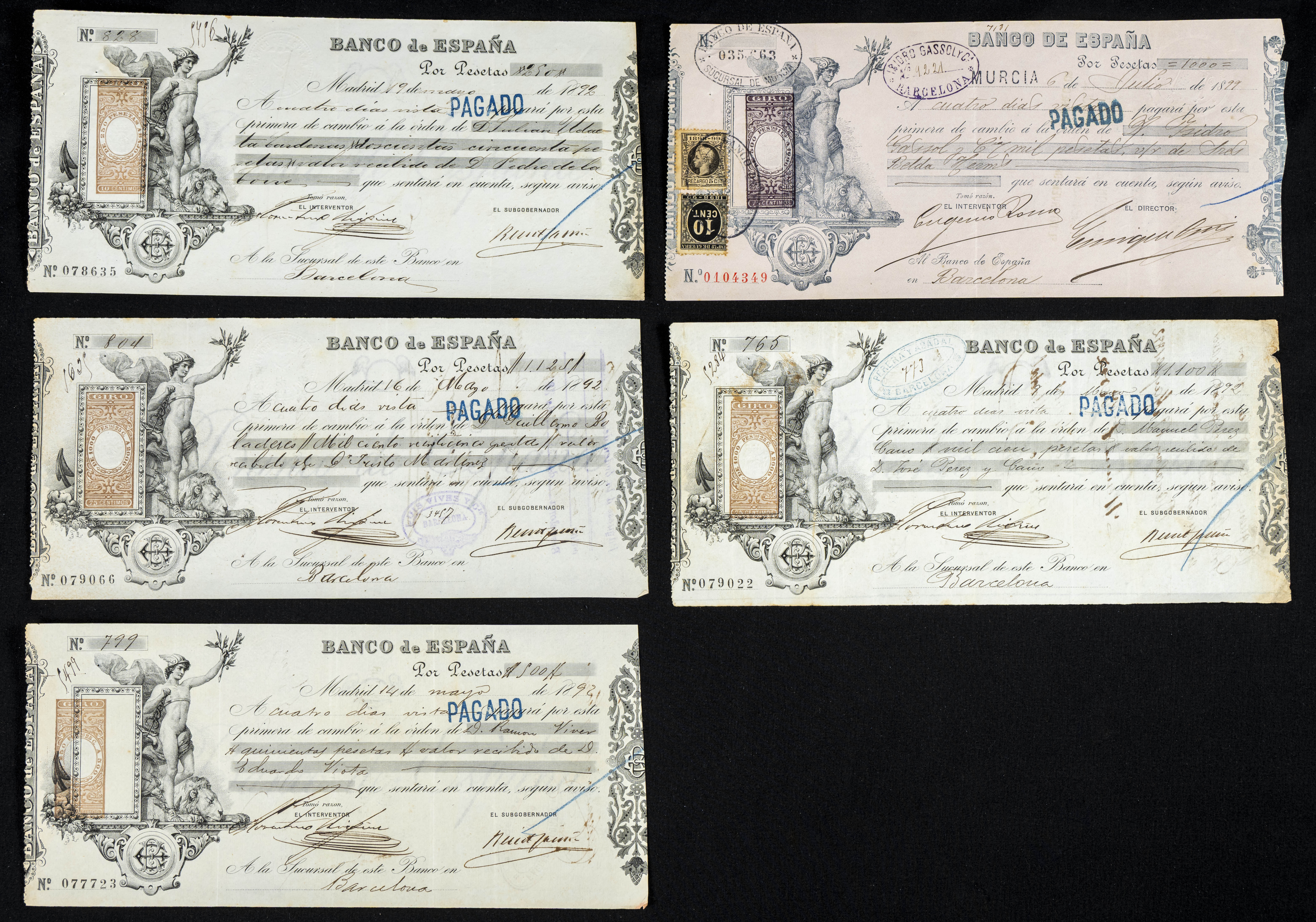 Conjunto de 10 Giros del Banco de España de 1892 tasados con los Timbres de Estado Fiscales correspondientes. A EXAMINAR.