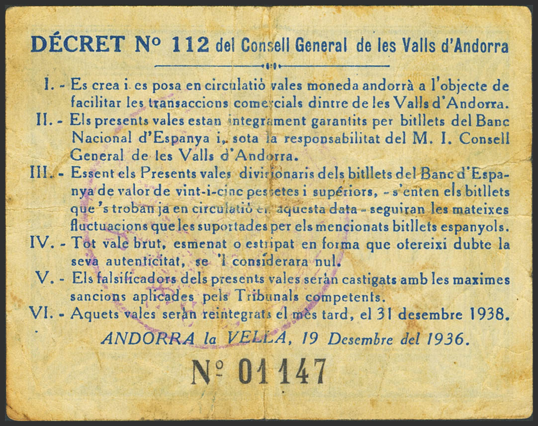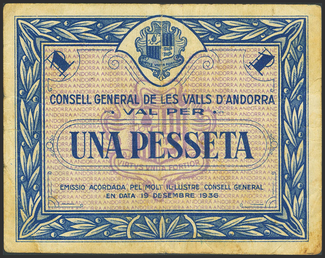 ANDORRA. 1 Pesseta. 19 de Diciembre de 1936. Sin serie. (Edifil 2023: 2) MBC-.
