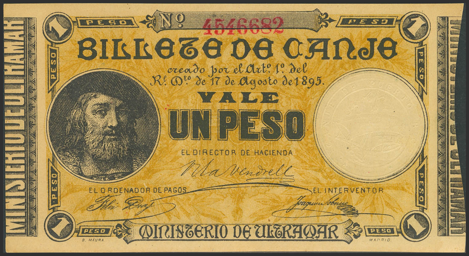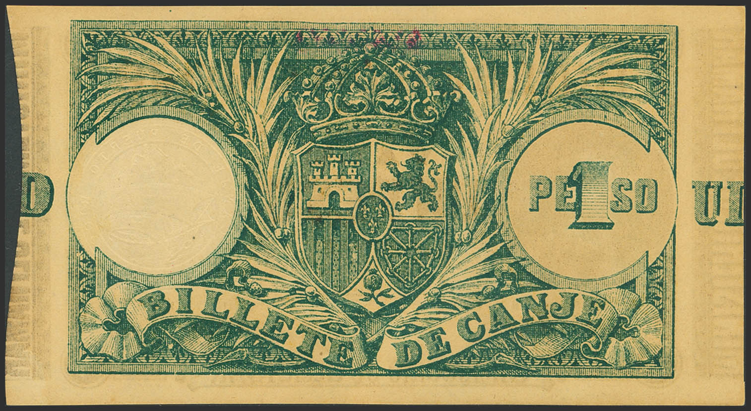 PUERTO RICO. 1 Peso. 17 de Agosto de 1895. Sin serie. (Edifil 2023: 11). Muy raro, conserva todo su apresto original. SC--.