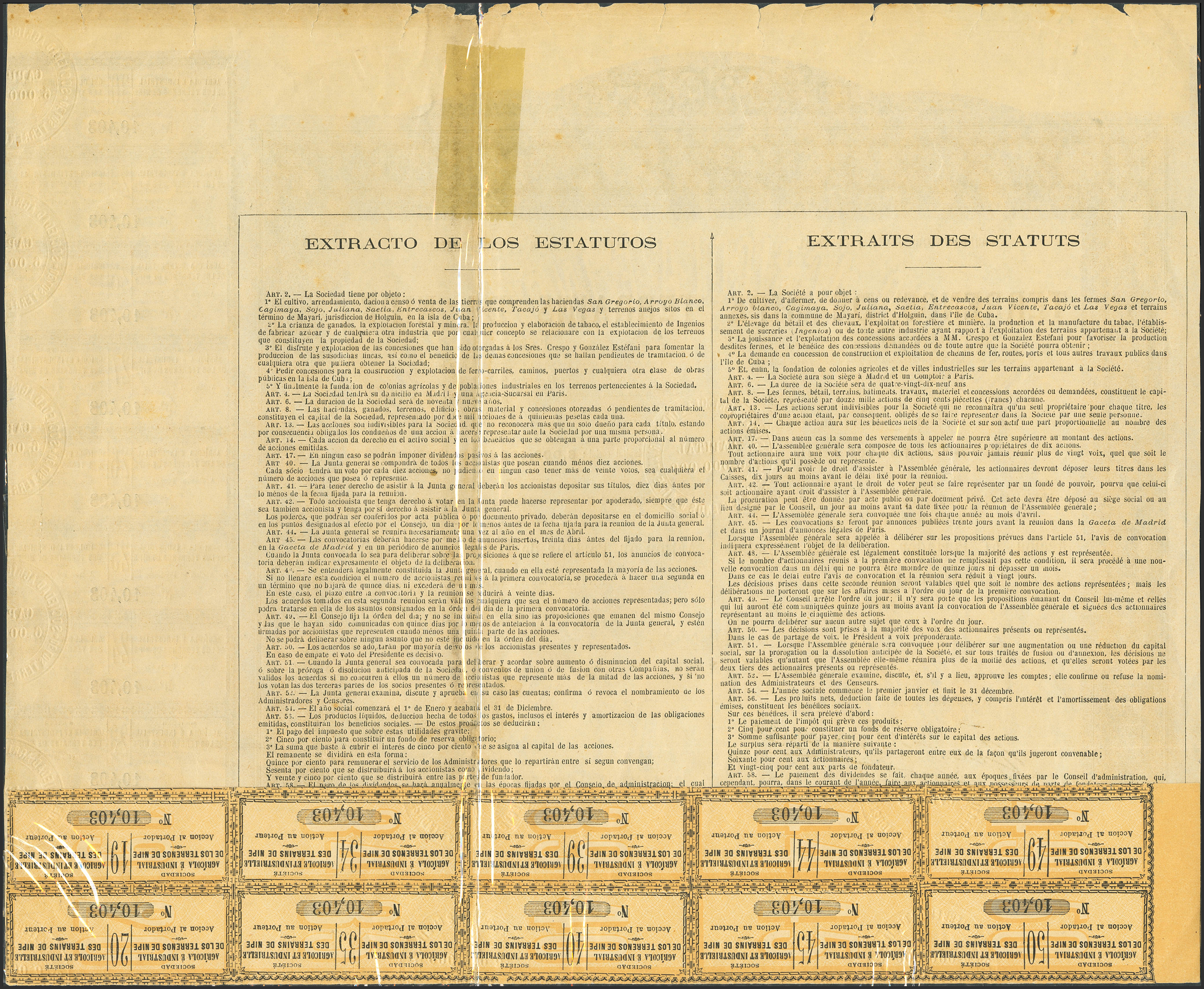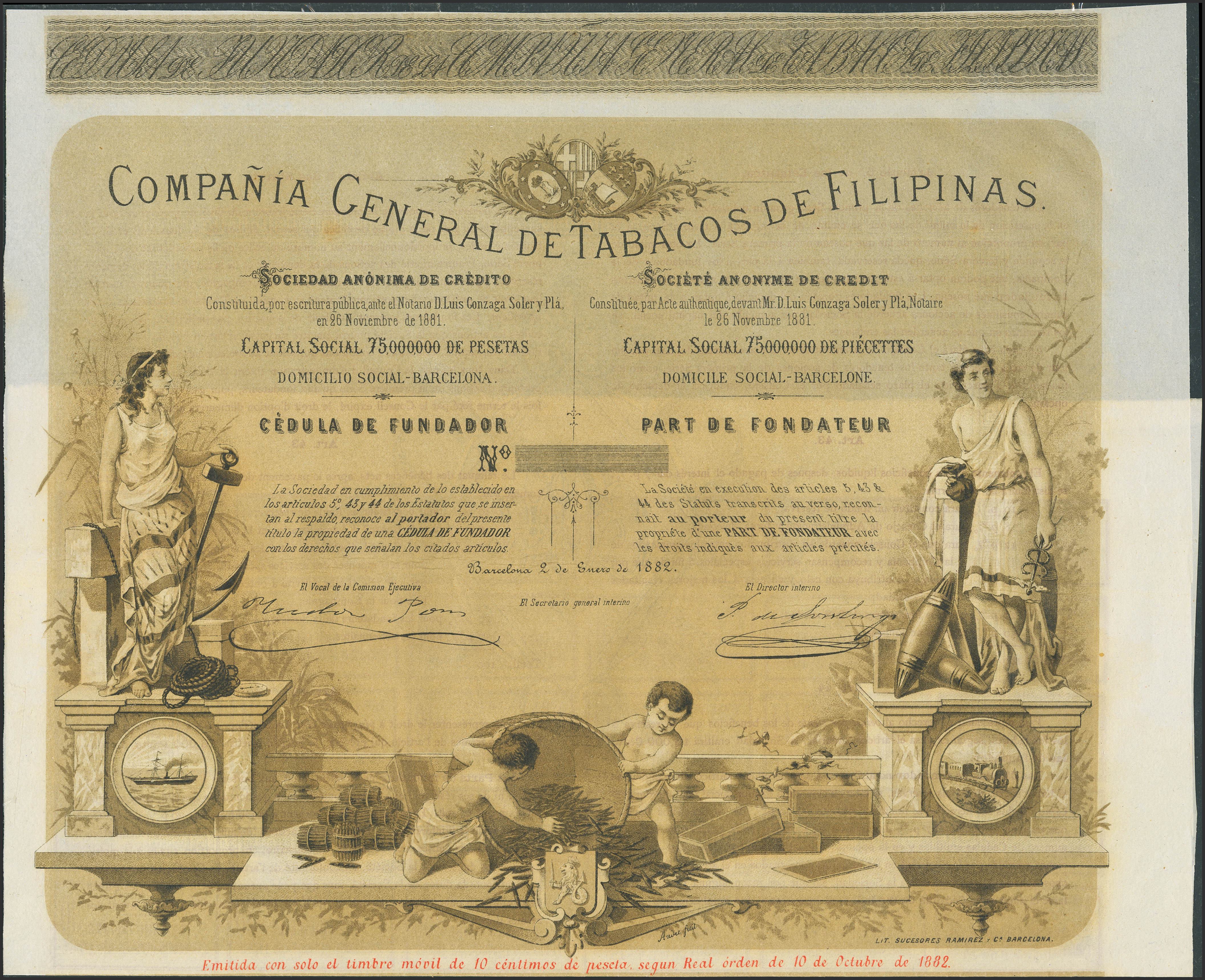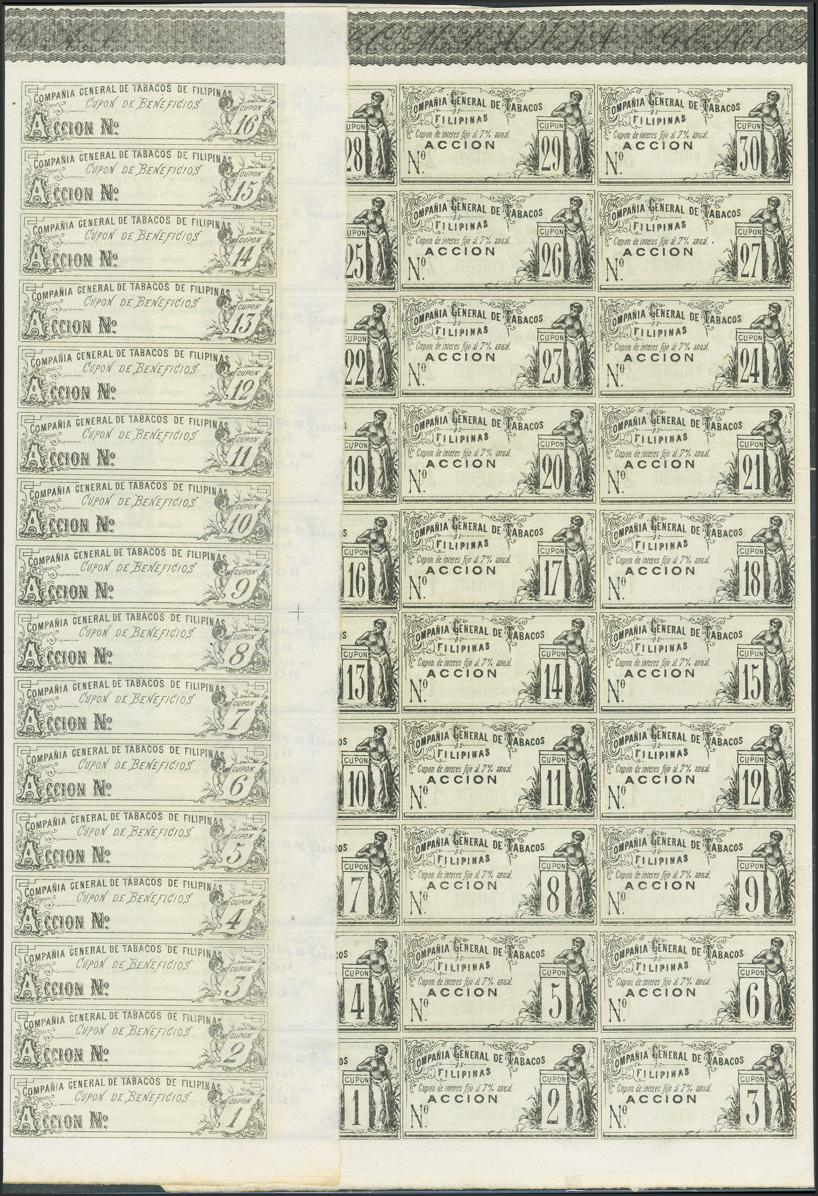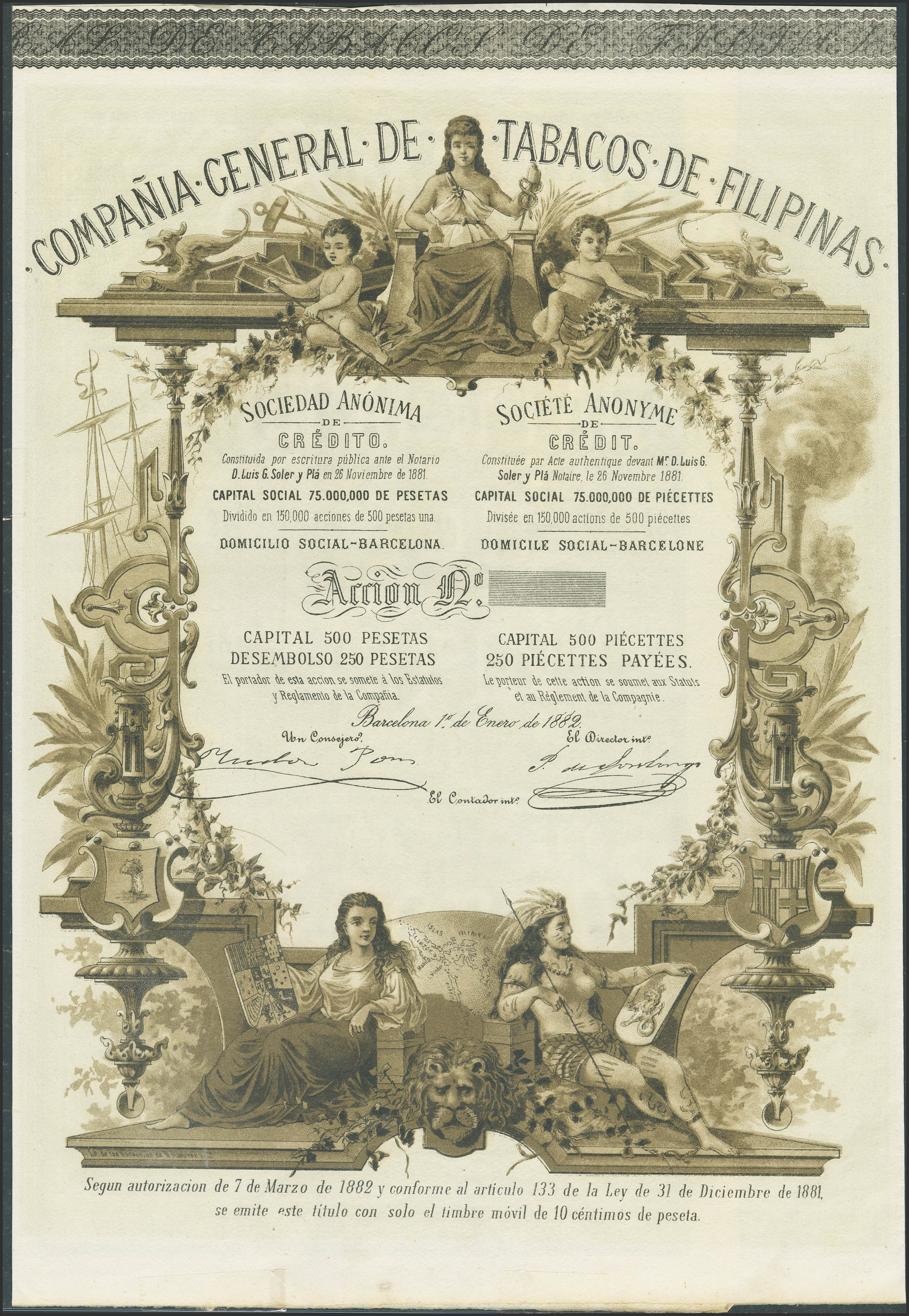 Conjunto de dos acciones de la COMPAÑIA GENERAL DE TABACOS DE FILIPINAS de 1882 (diferentes formatos), además se incluyen dos de Cuba (una del ayuntamiento de La Habana y otra de Terrenos de Nipe) y una de Terrenos de Katanga (Congo Belga). A EXAMINAR.