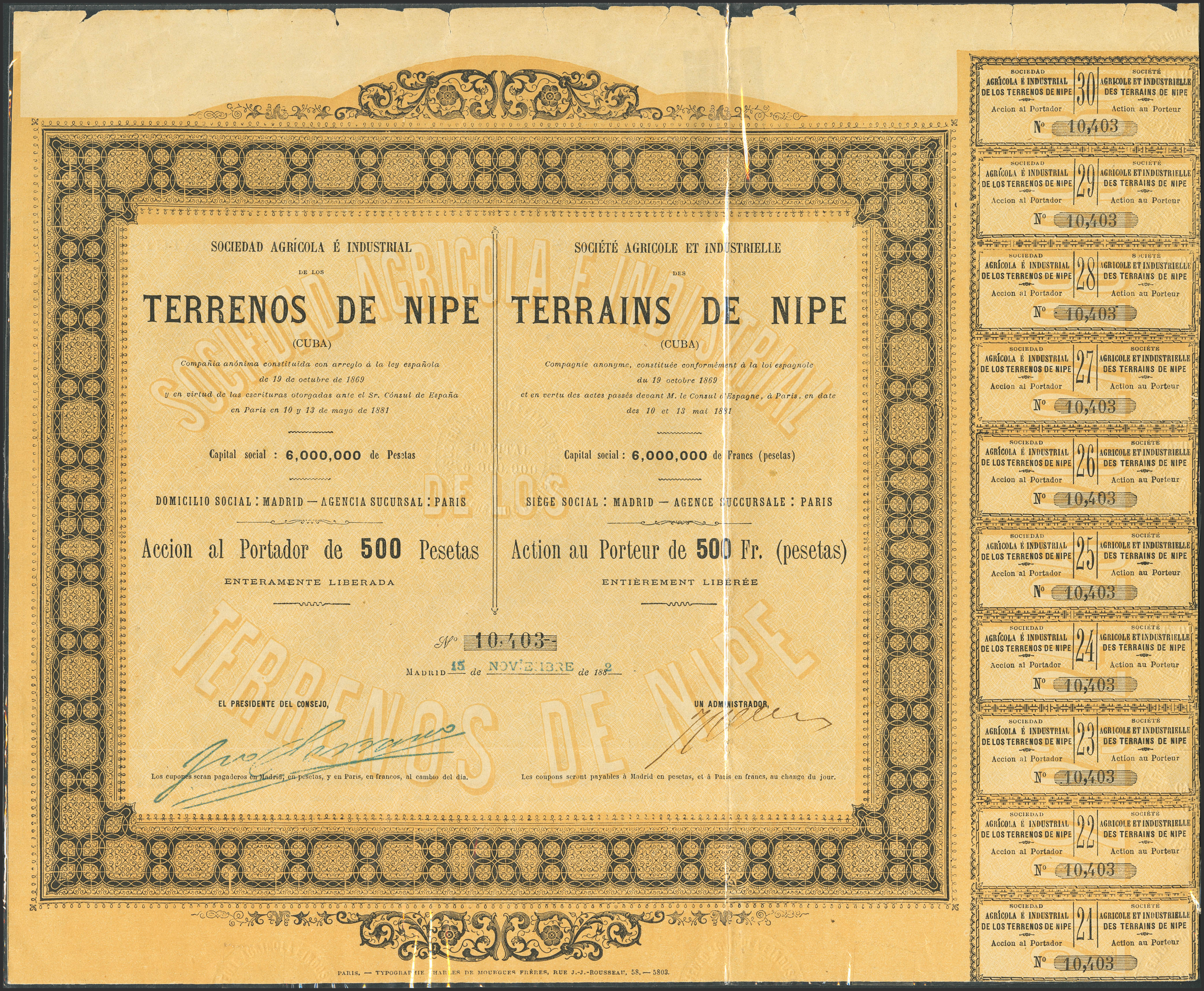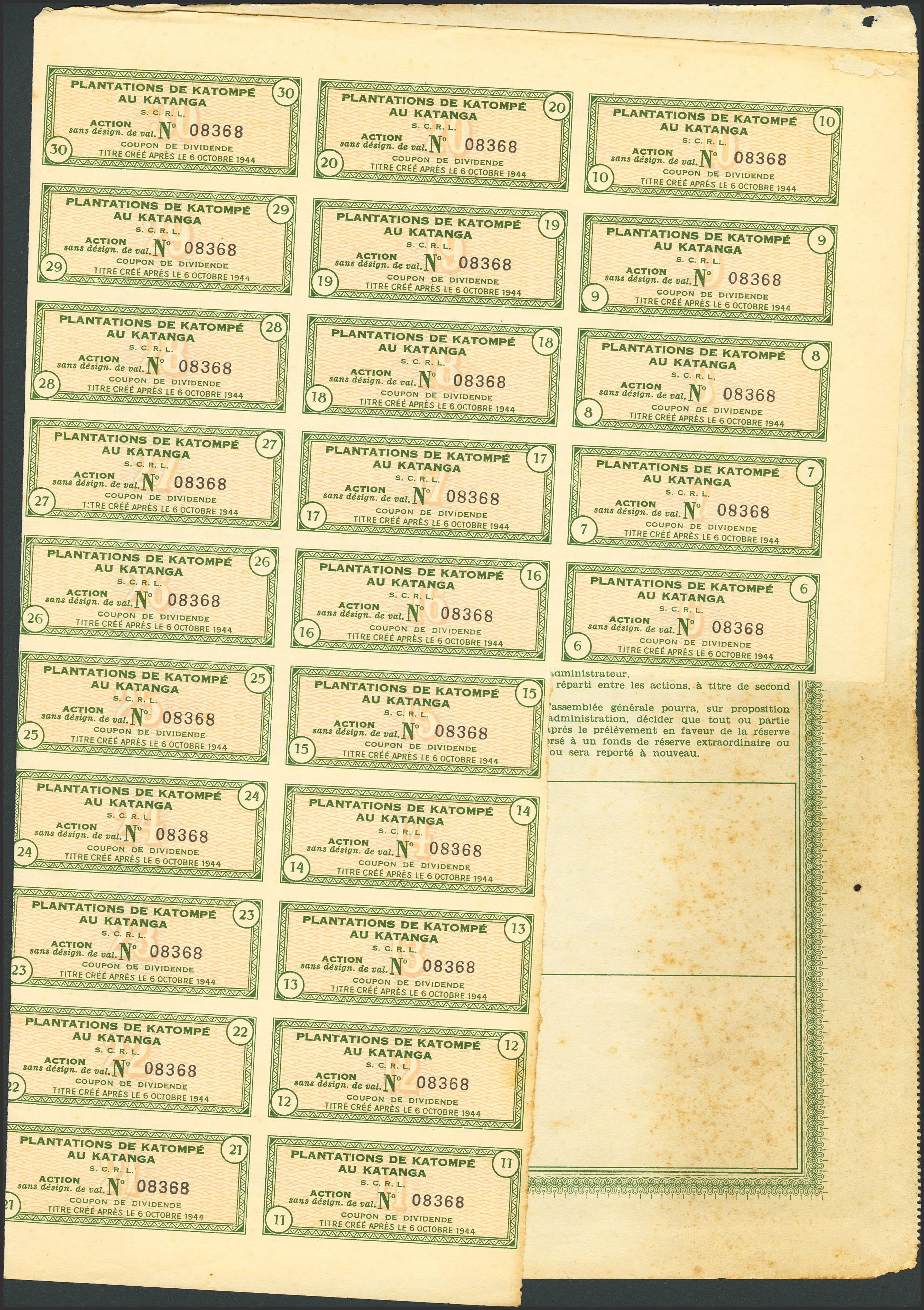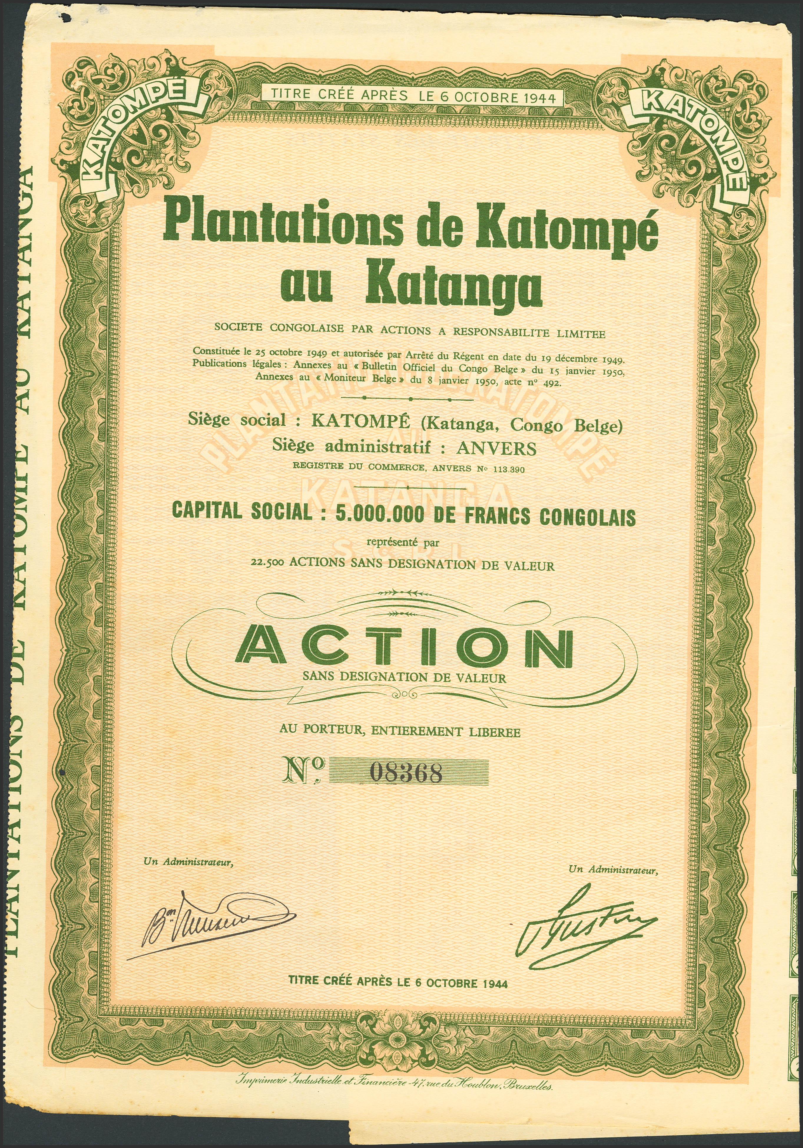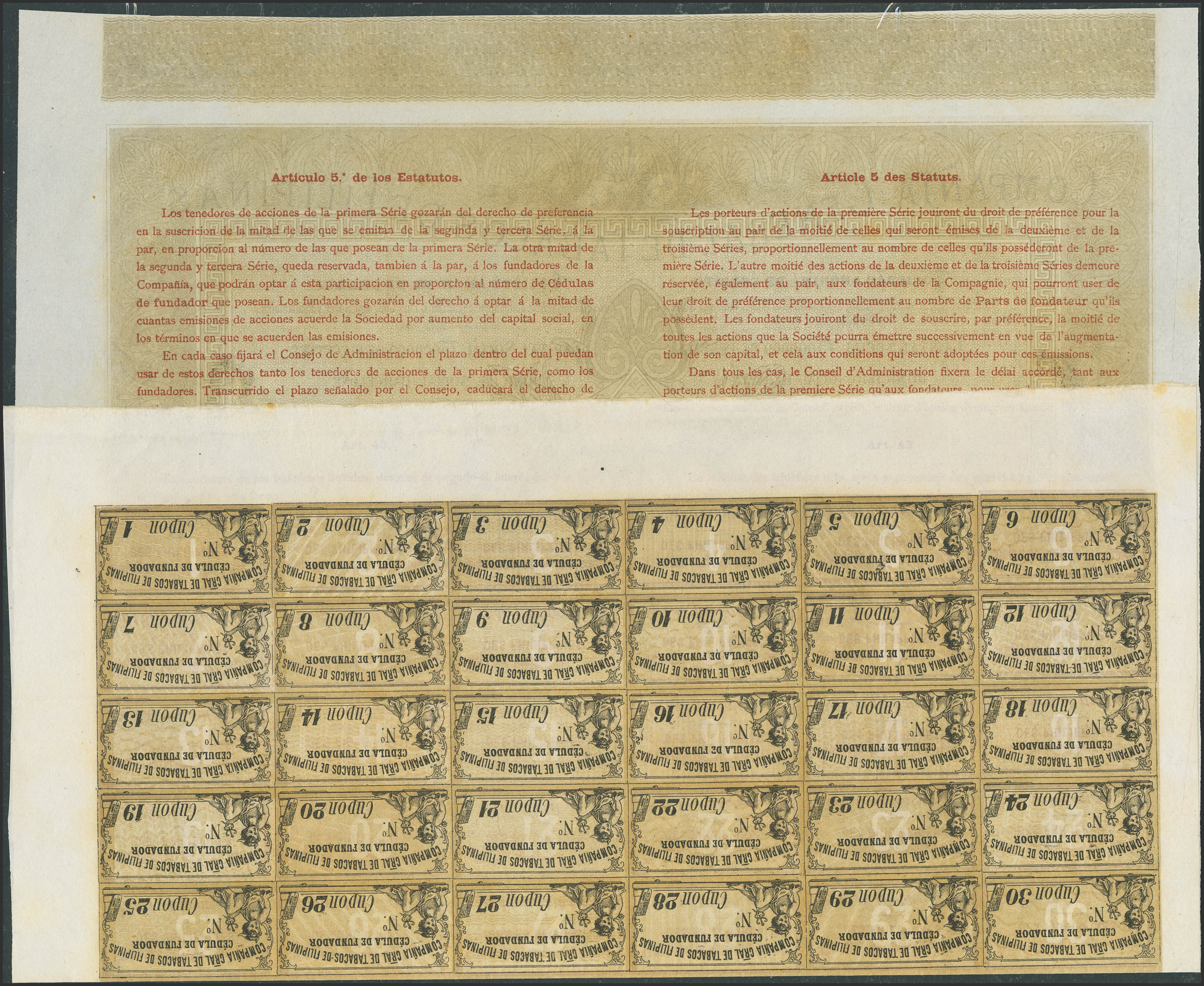 Conjunto de dos acciones de la COMPAÑIA GENERAL DE TABACOS DE FILIPINAS de 1882 (diferentes formatos), además se incluyen dos de Cuba (una del ayuntamiento de La Habana y otra de Terrenos de Nipe) y una de Terrenos de Katanga (Congo Belga). A EXAMINAR.