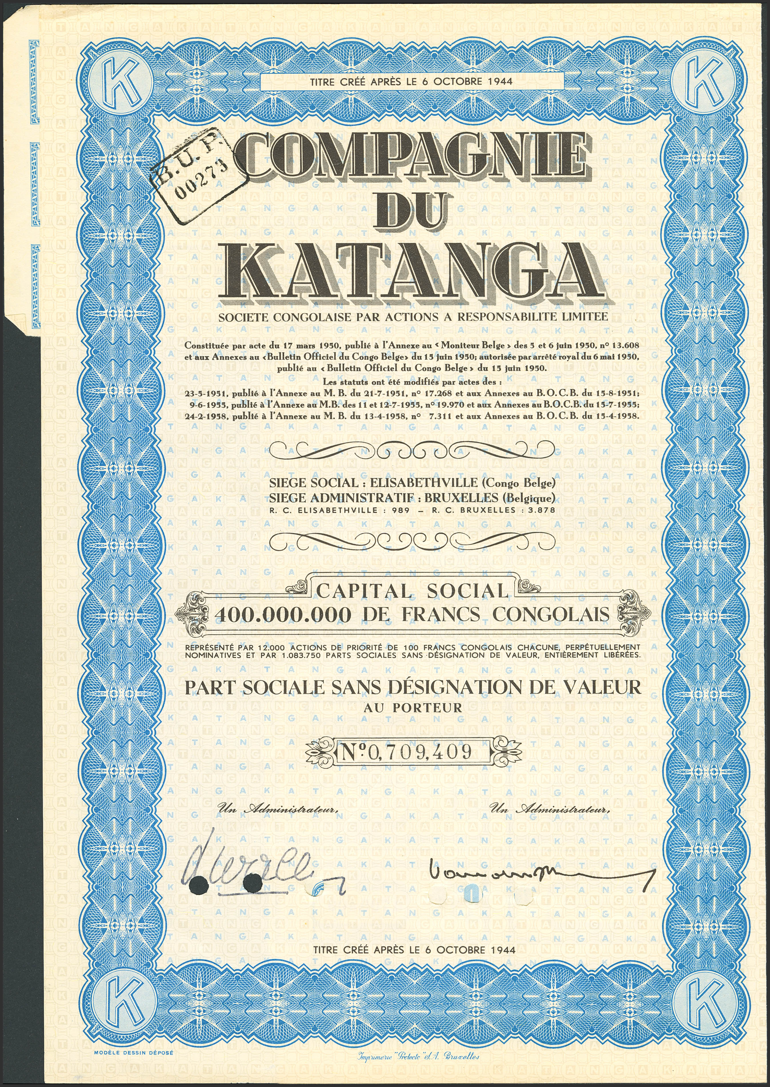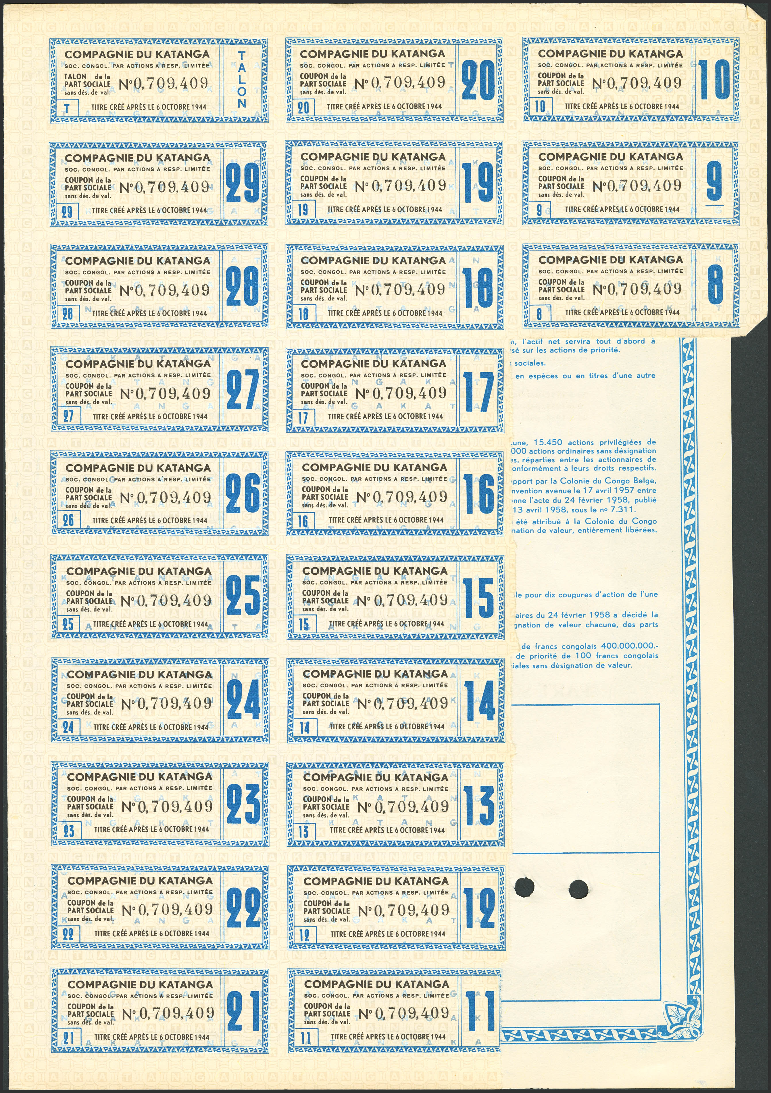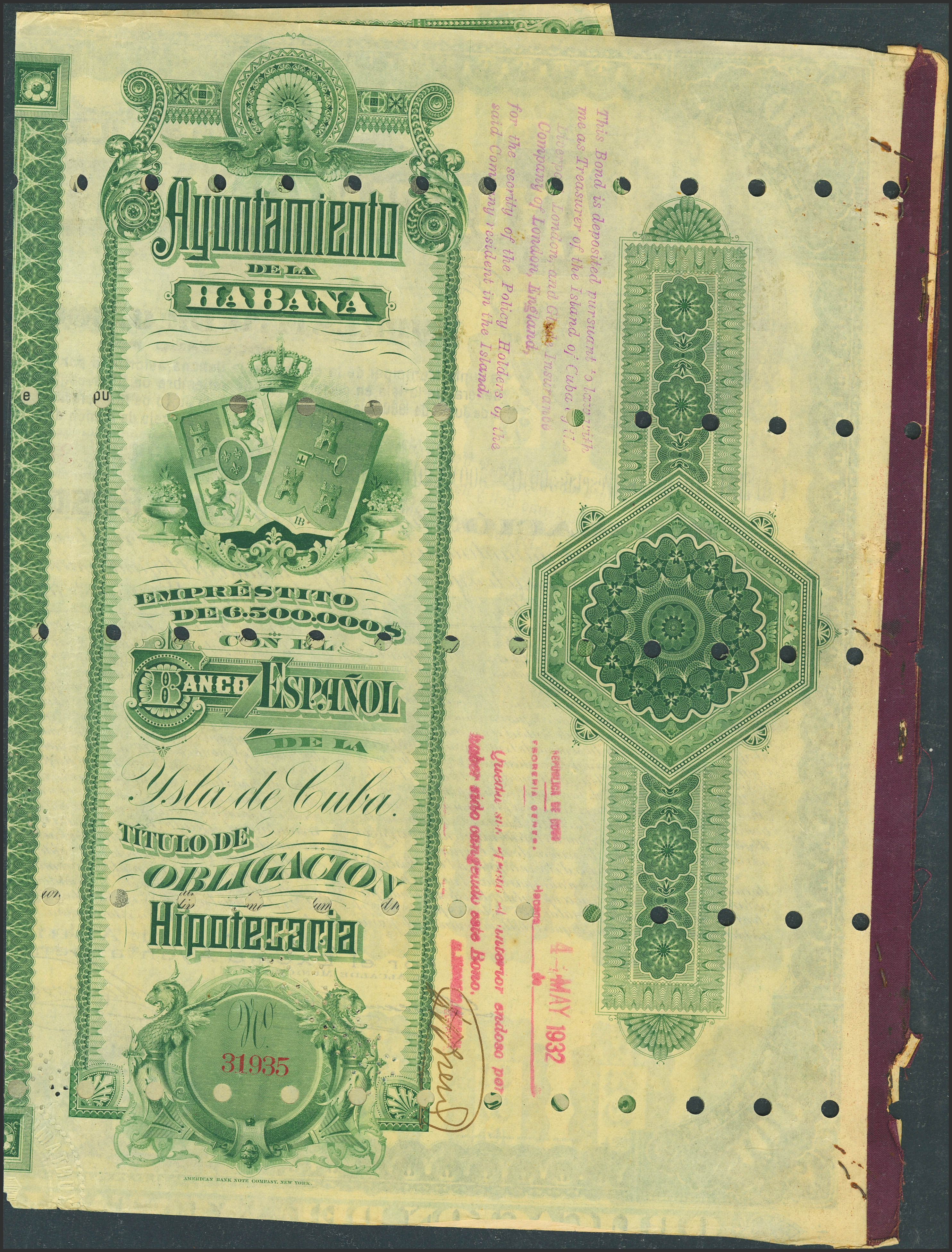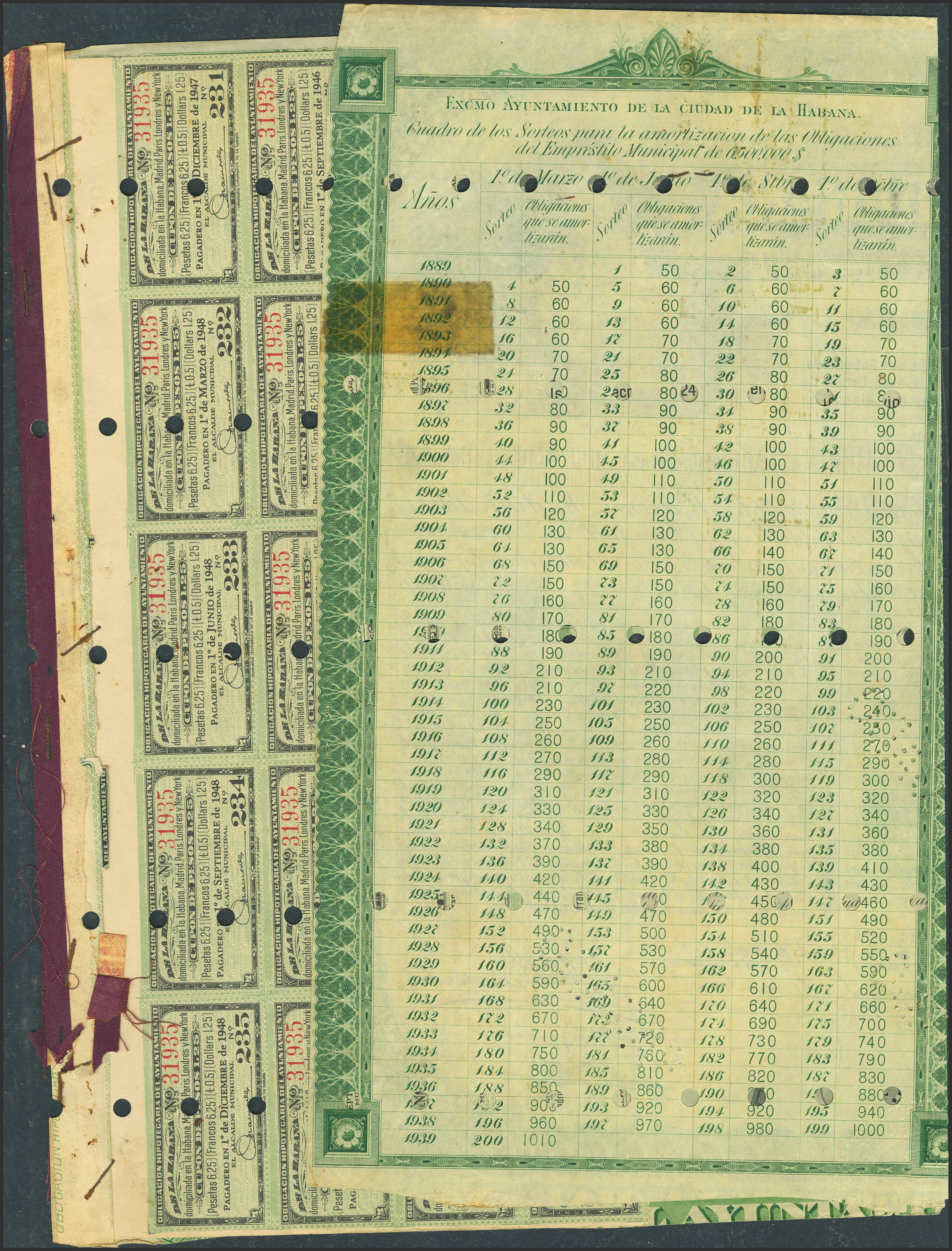 Conjunto de dos acciones de la COMPAÑIA GENERAL DE TABACOS DE FILIPINAS de 1882 (diferentes formatos), además se incluyen dos de Cuba (una del ayuntamiento de La Habana y otra de Terrenos de Nipe) y una de Terrenos de Katanga (Congo Belga). A EXAMINAR.