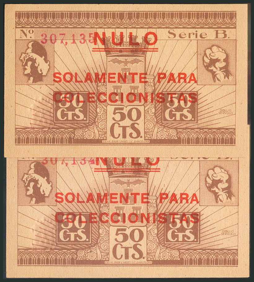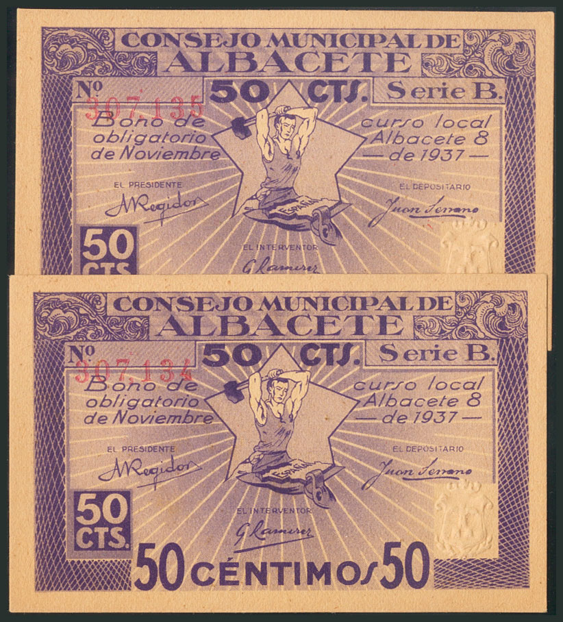 ALBACETE. 50 Céntimos. 8 de Noviembre de 1937. Pareja correlativa. Tampón "Nulo solamente para coleccionistas". Serie B. (González: 131). SC.