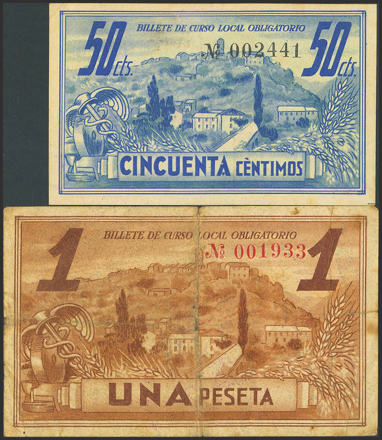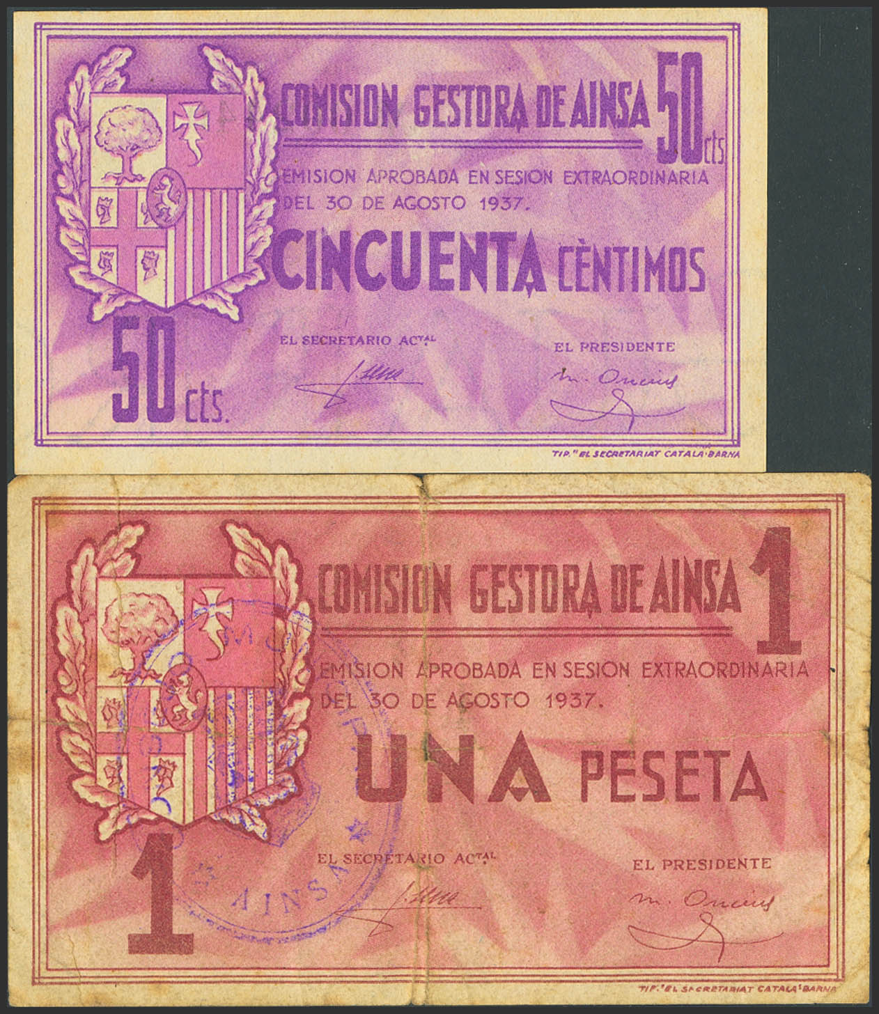 AINSA (HUESCA). 50 Céntimos y 1 Peseta. 30 de Agosto de 1937. (González: 105, 106). Inusuales. EBC+/BC+.
