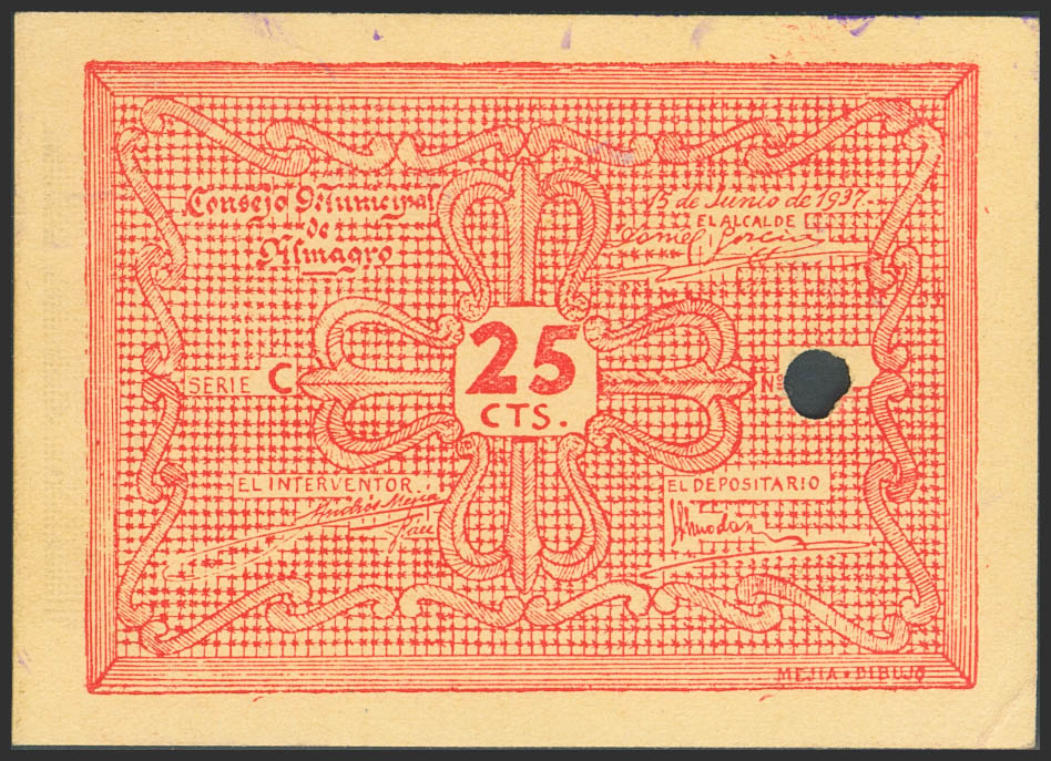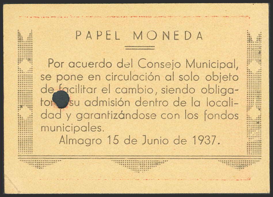 ALAMAGRO (CIUDAD REAL). 25 Céntimos. 15 de Junio de 1937. Taladrado. (González: 546). Inusual, especialmente en esta calidad. SC--.