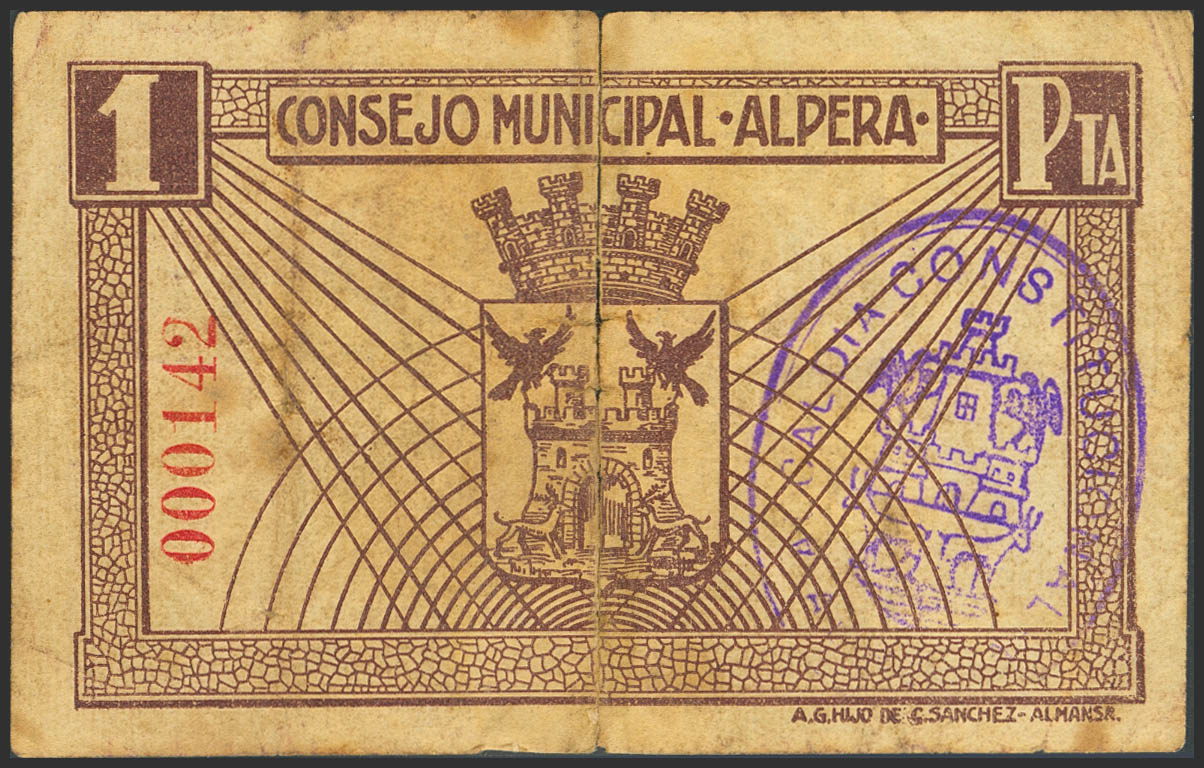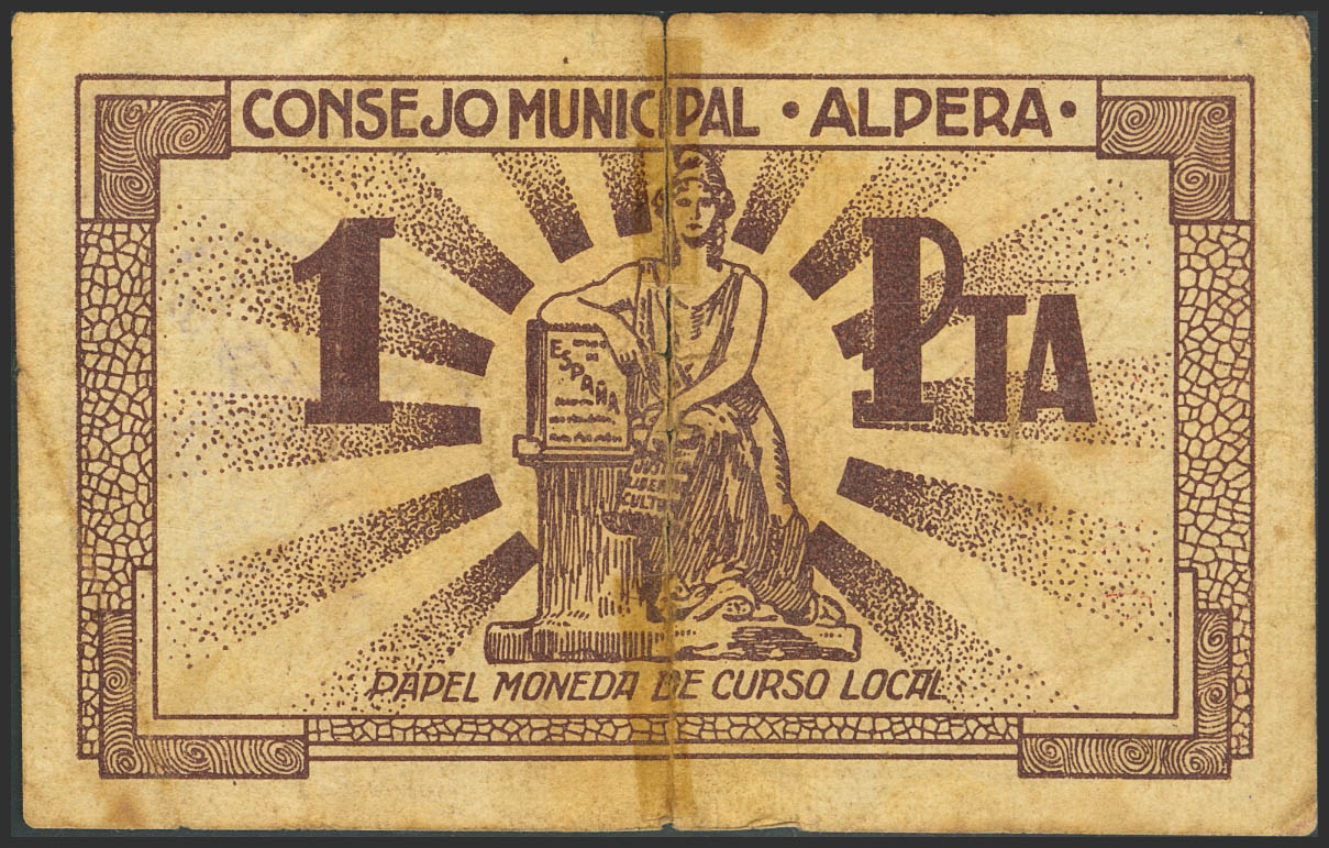ALPERA (ALBACETE). 1 Peseta. (1937ca). (González: 650). Raro, presencia de cinta adhesiva. RC-.