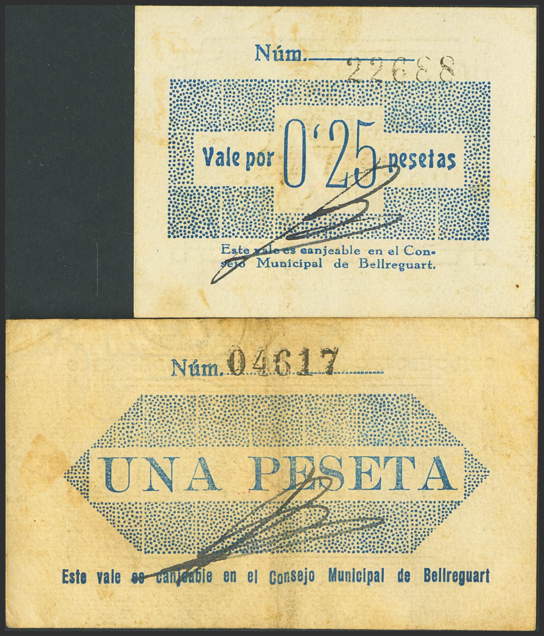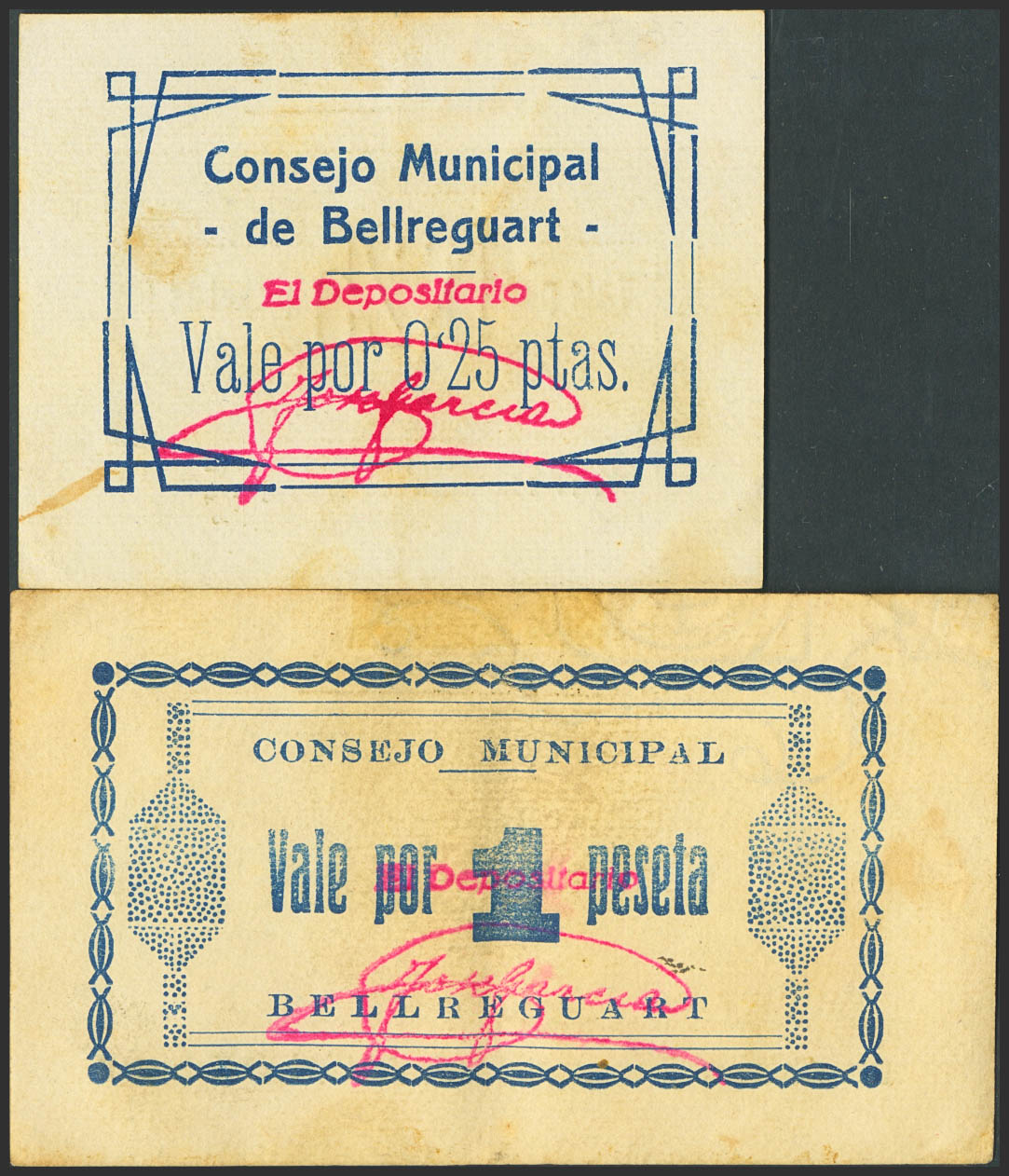 BELLREGUART (VALENCIA). 25 Céntimos y 1 Peseta. (1937ca). (González: 955/56). Rara serie completa. EBC-/MBC+.