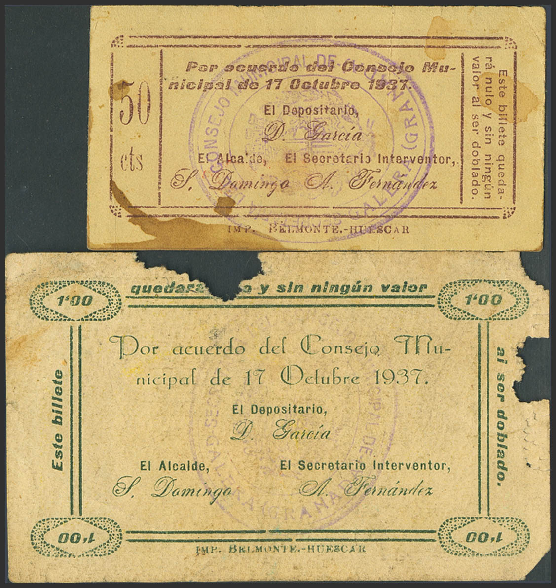 GALERA (GRANADA). 50 Céntimos y 1 Peseta. 17 de Septiembre de 1937. (González: 2597, 2598). Muy raros. MBC+/RC.