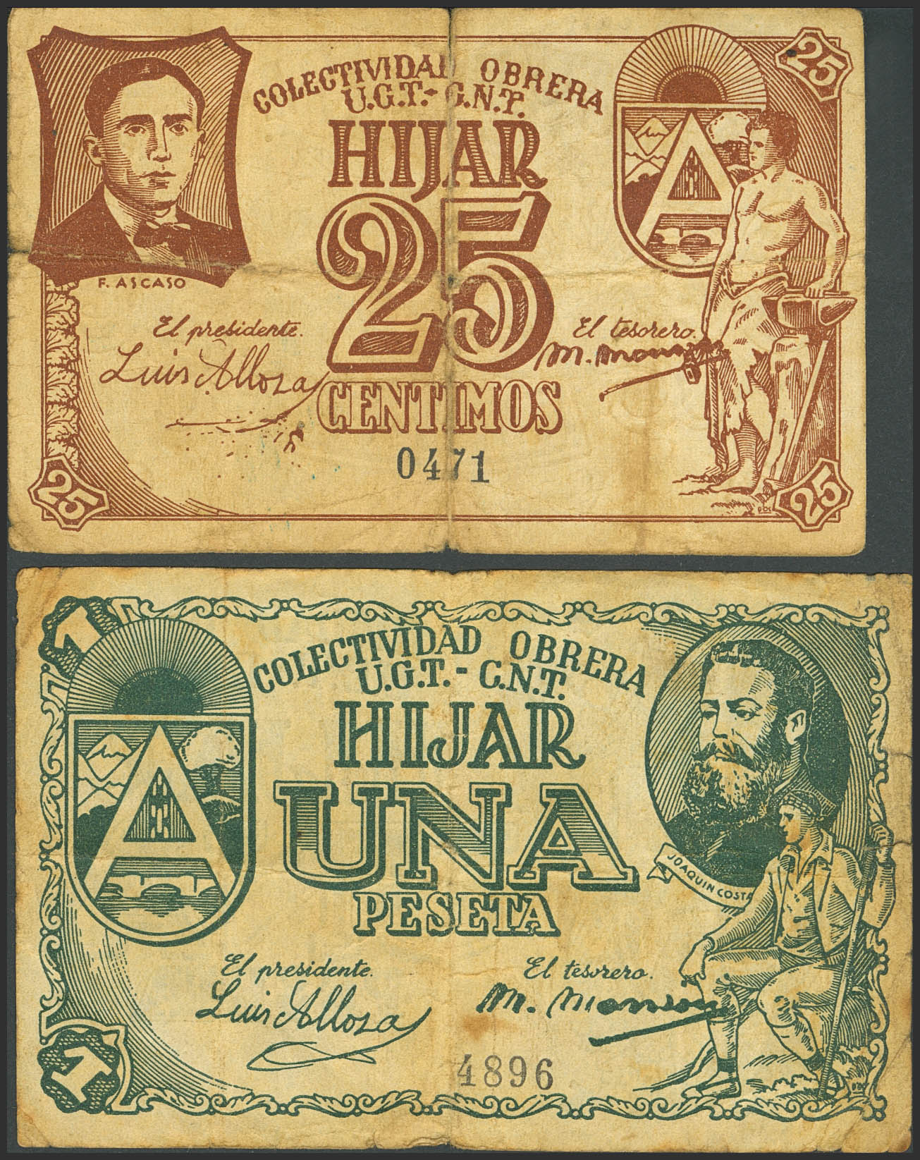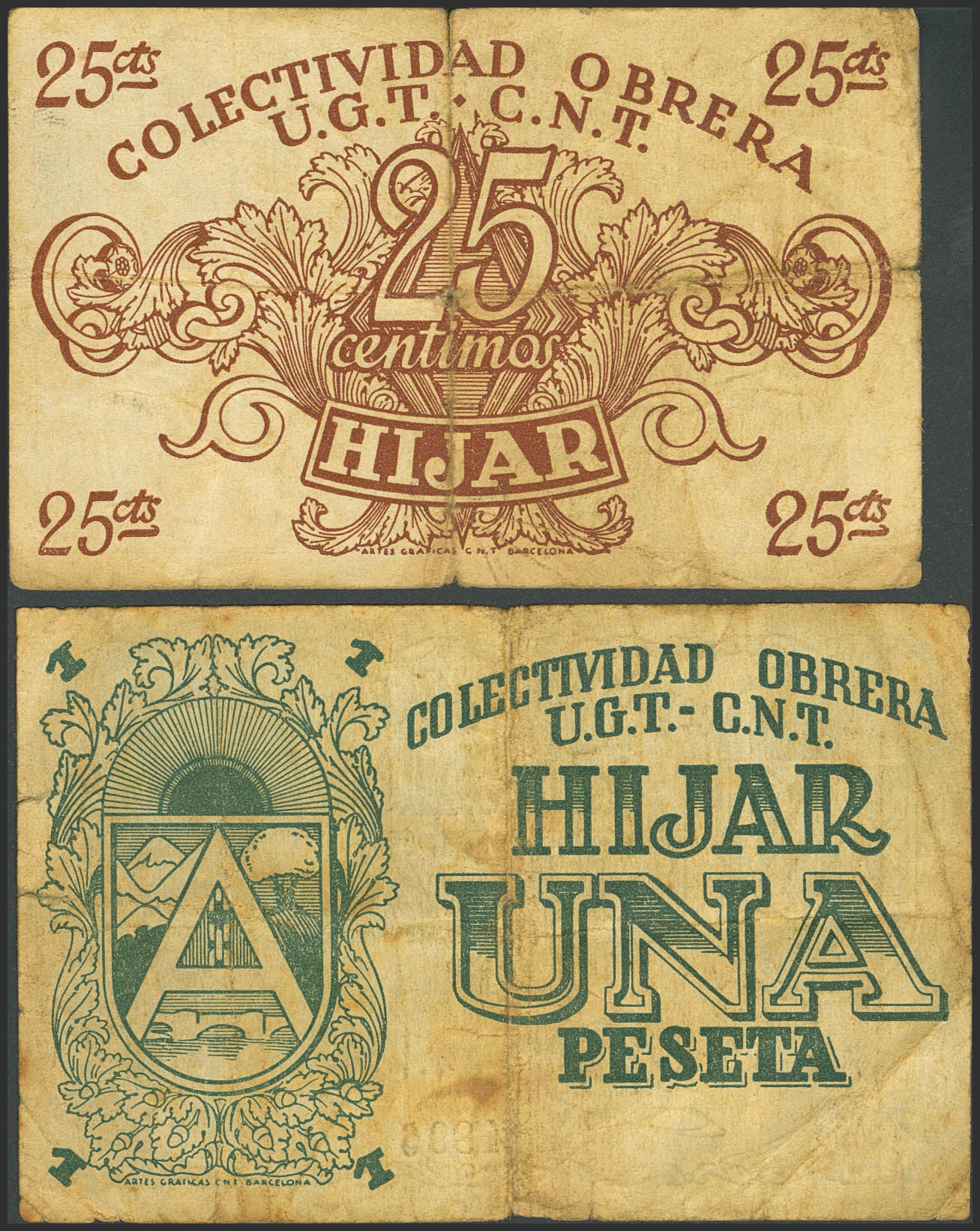 HIJAR (TERUEL). 25 Céntimos y 1 Peseta. (1937ca). (González: 2849/50). BC.