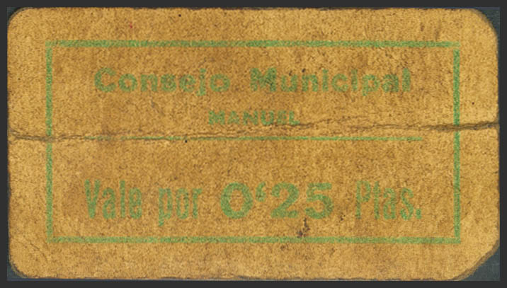 MANUEL (VALENCIA). 25 Céntimos. (1937ca). (González: 3366). Muy raro. BC.