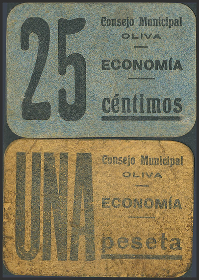OLIVA (VALENCIA). 25 Céntimos y 1 Peseta. (1937ca). (González: 3898, 3902). Raros. MBC.