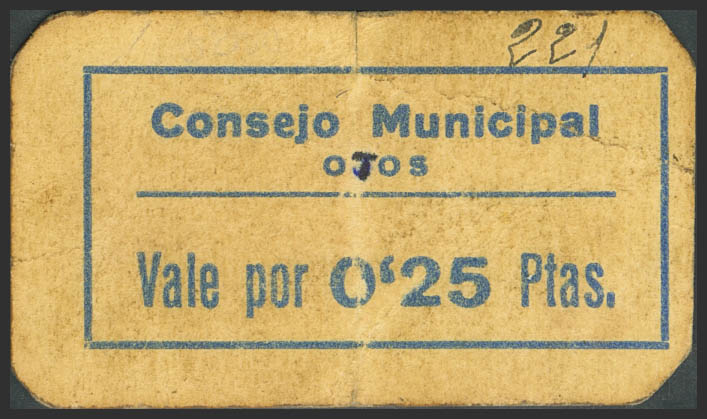 OTOS (VALENCIA). 25 Céntimos. (1937ca). (González: 4013). Muy raro. MBC-.