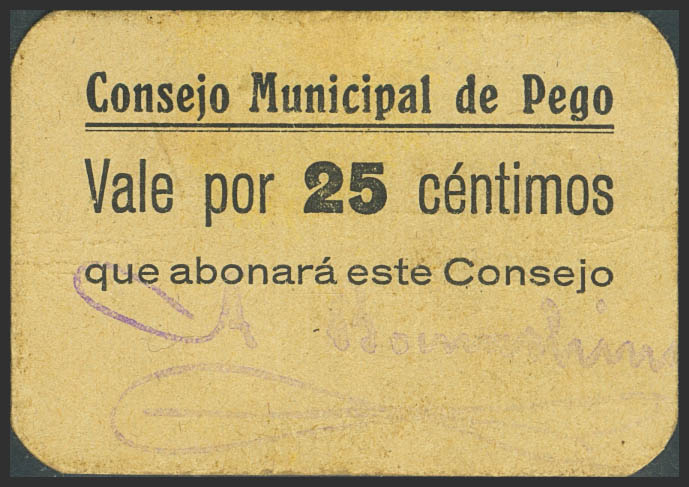PEGO (ALICANTE). 25 Céntimos. (1937ca). (González: 4125). Muy raro. MBC+.