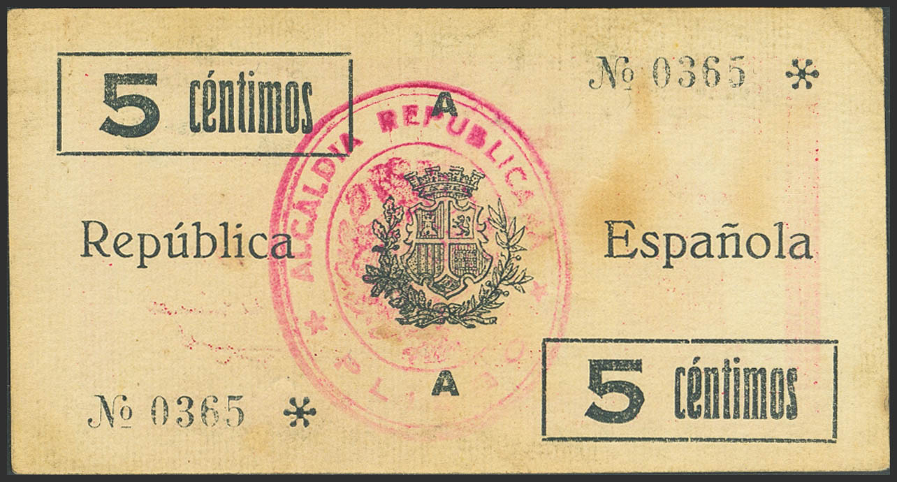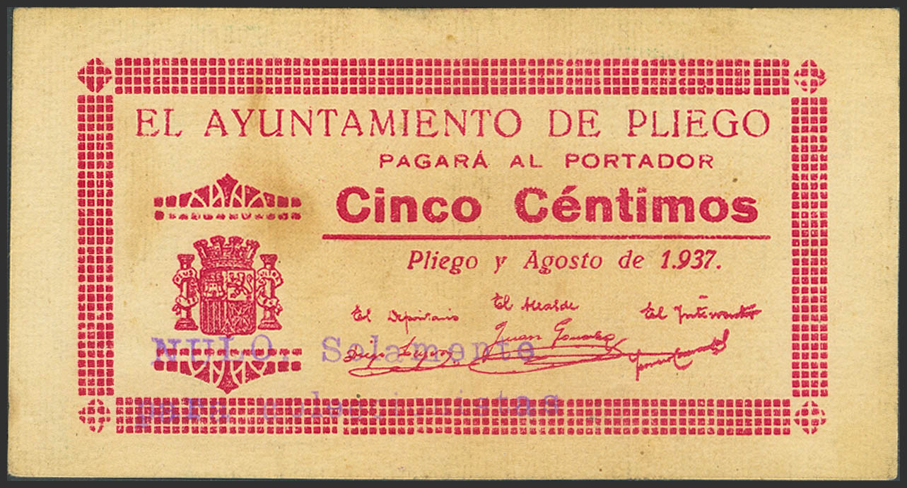 PLIEGO (MURCIA). 5 Céntimos. Agosto de 1937. Serie A. (González: 4211). Muy raro. EBC-.