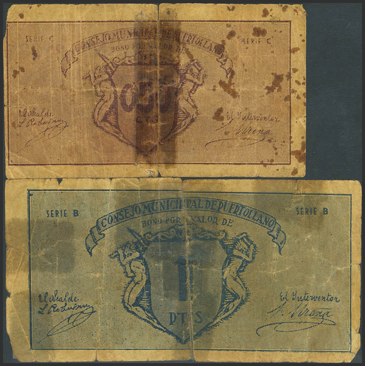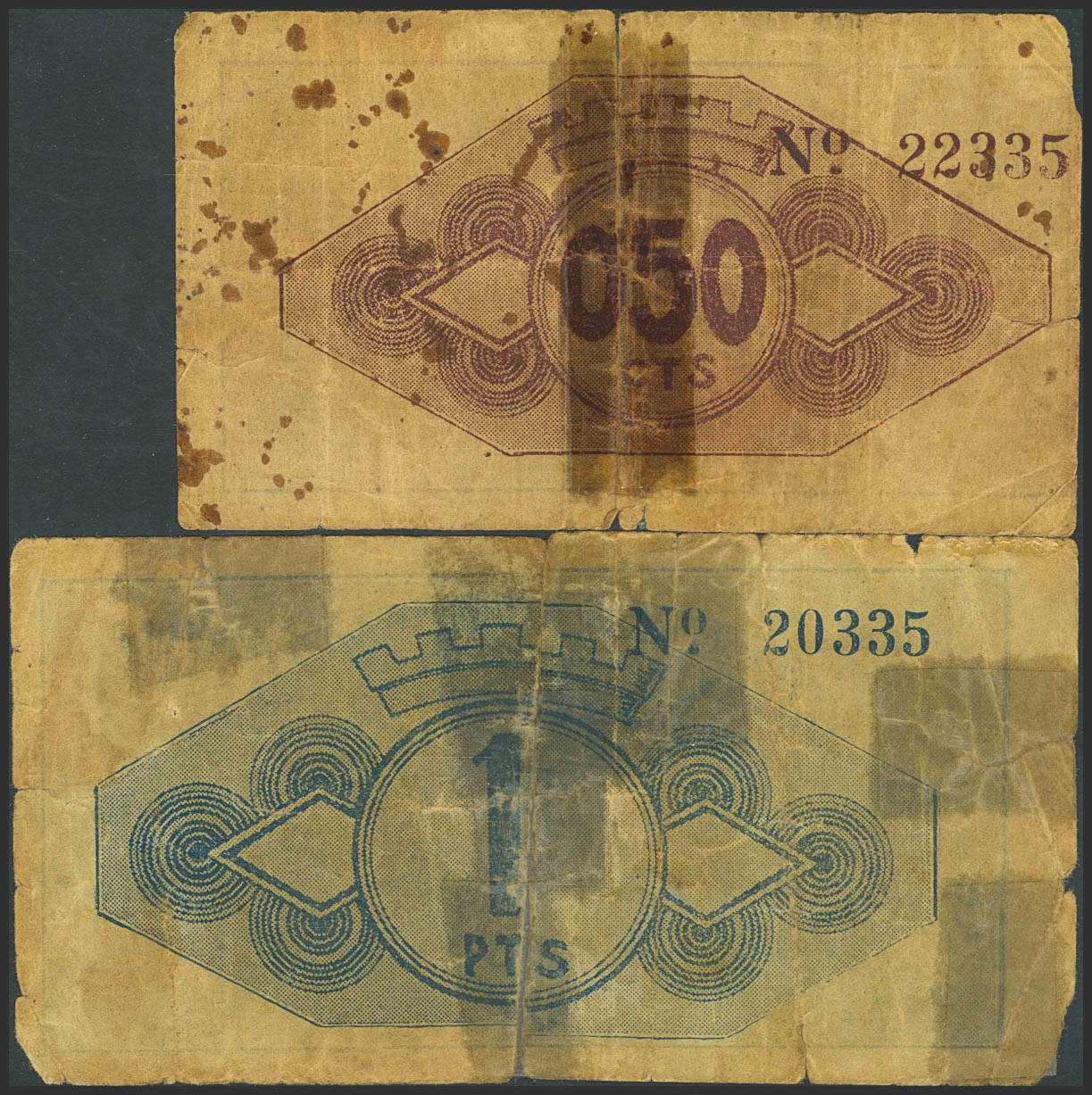PUERTOLLANO (CIUDAD REAL). 50 Céntimos y 1 Peseta. (1937ca). Serie C y B, respectivamente. (González: 4397, 4398). Inusual, presencia de cinta adhesiva. RC.