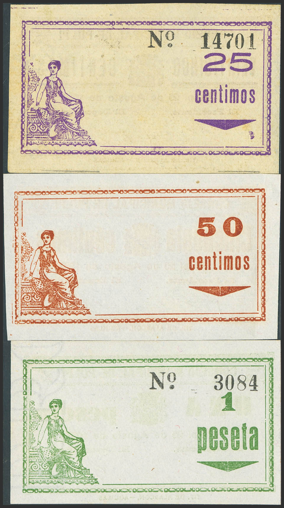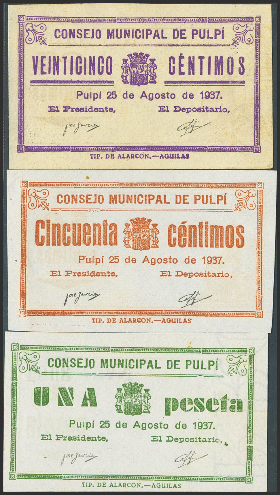 PULPI (ALMERIA). 25 Céntimos, 50 Céntimos y 1 Peseta. 25 de Agosto de 1937. (González: 4412/17). Inusual serie completa, especialmente en esta calidad. SC-/EBC+++.