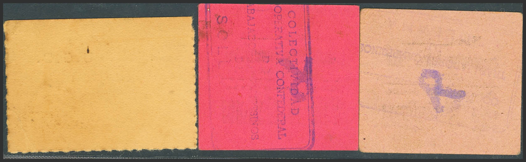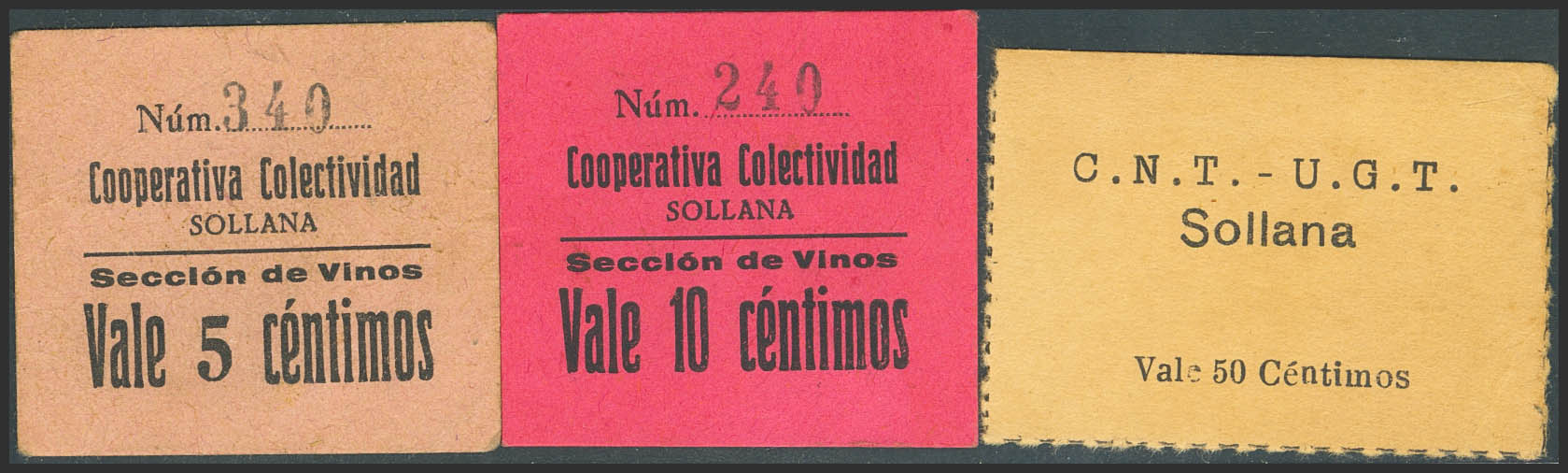 Conjunto de 3 billetes de Sollana (Valencia) de 5 Céntimos y 10 Céntimos de sección de vinos y 50 Céntimos de la C.N.T-U.G.T. (1937ca). (González: no catalogado). Muy raros. EBC-.