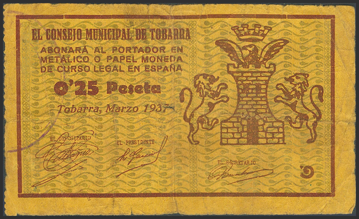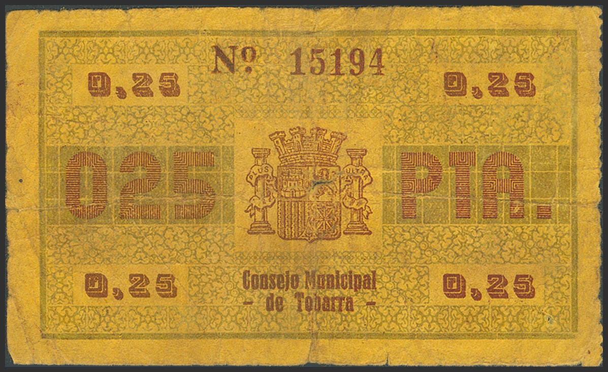 TOBARRA (ALBACETE). 25 Céntimos. Marzo de 1937. (González: 5016). Inusual. BC-.