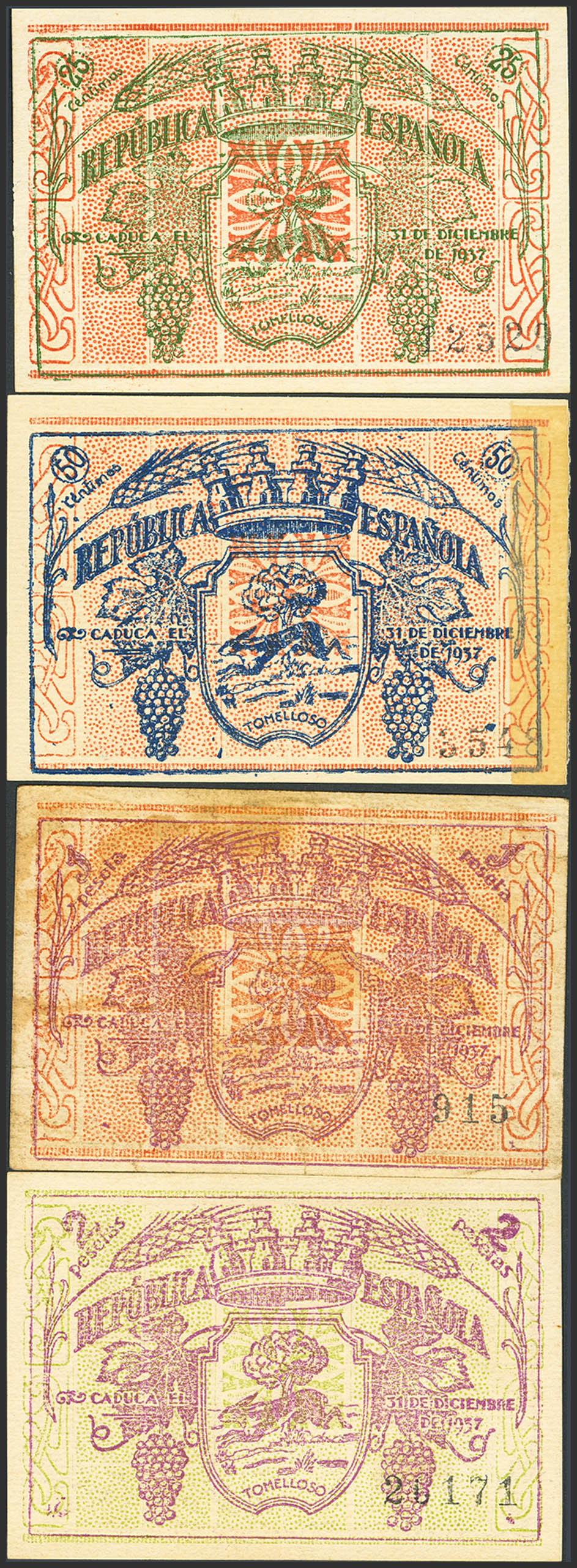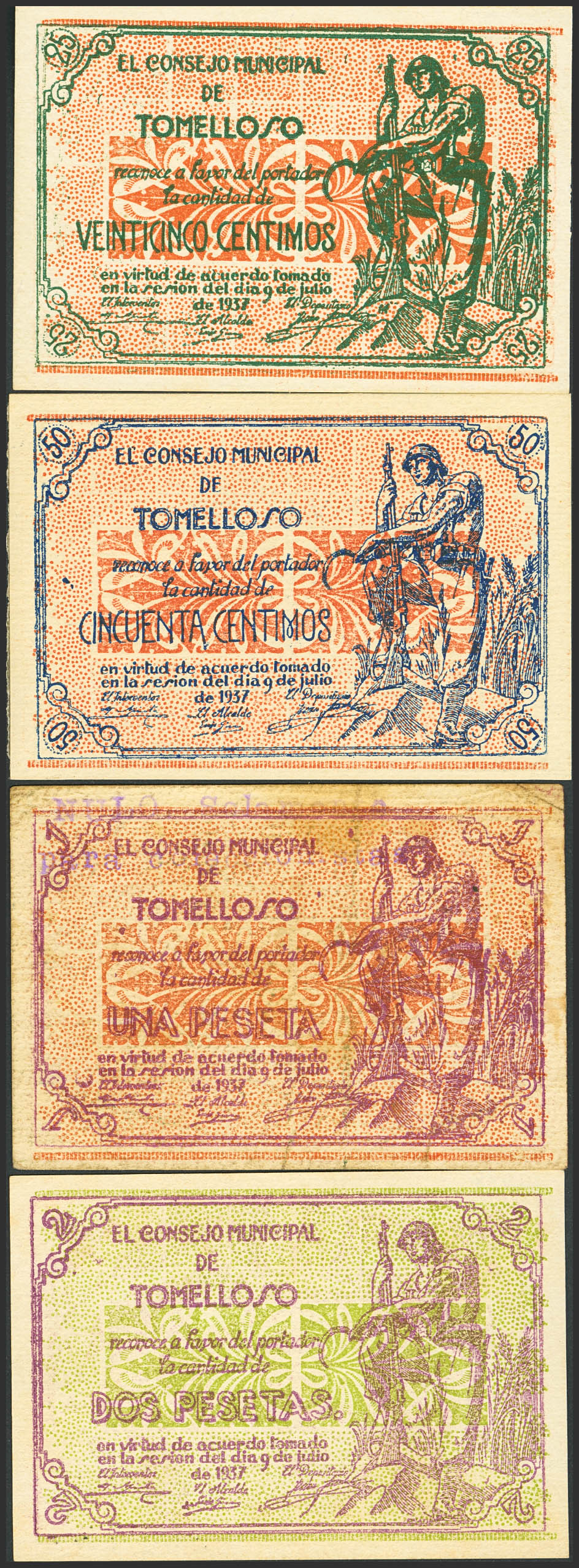 TOMELLOSO (CIUDAD REAL). 25 Céntimos, 50 Céntimos, 1 Peseta y 2 Pesetas. 9 de Julio de 1937. (González: 5042/45). Inusual serie completa. SC-/MBC.