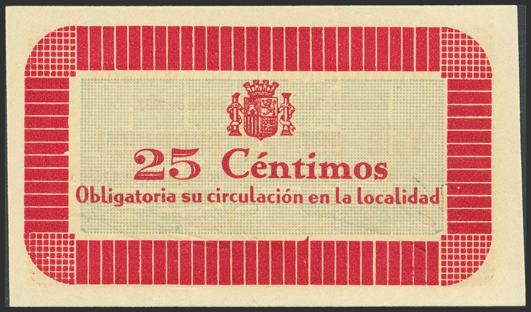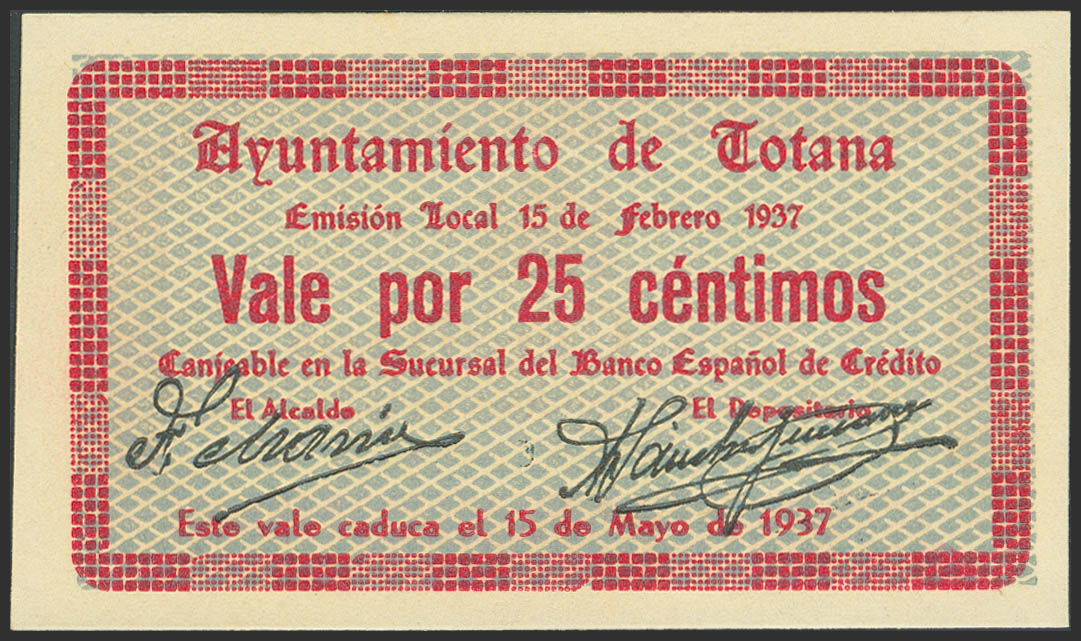 TOTANA (MURCIA). 25 Céntimos. 15 de Febrero de 1937. (González: 5159). Inusual, especialmente en esta calidad. SC.