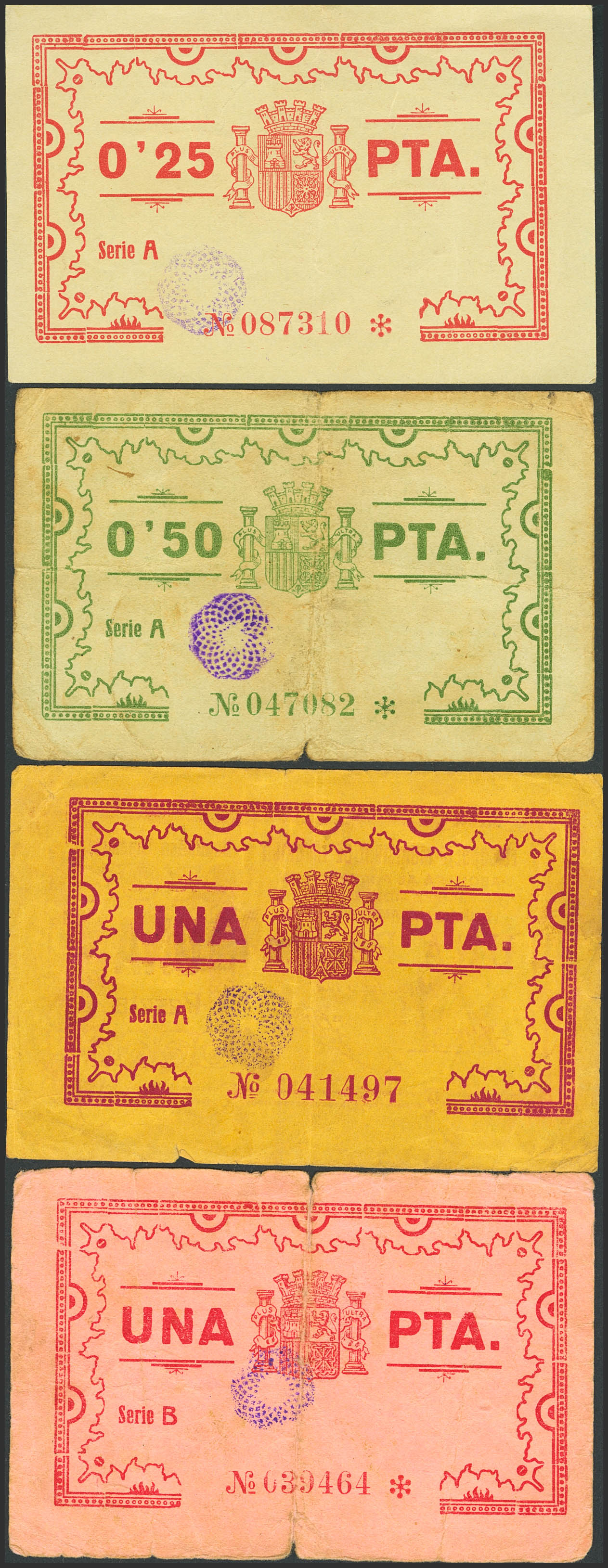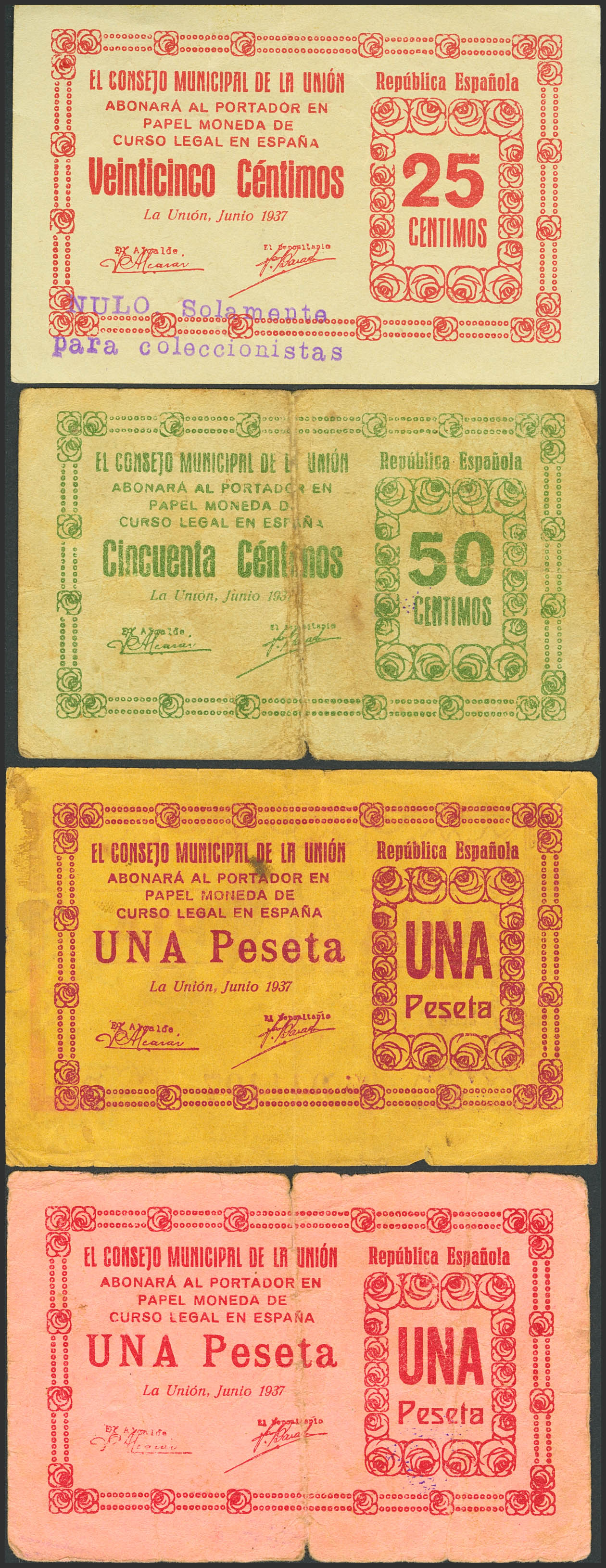 UNION (MURCIA). 25 Céntimos, 50 Céntimos y 1 Peseta (2). Junio de 1937. Serie A(2) y B(2), respectivamente. (González: 5220, 5222, 5224, 5226). Inusuales. SC--/MBC-.