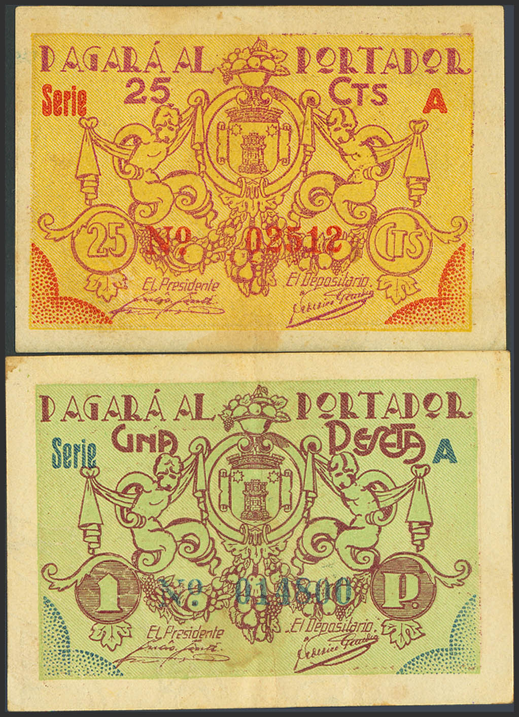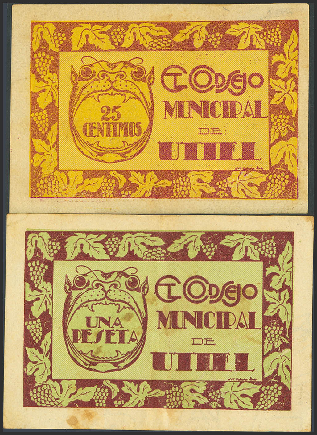 UTIEL (VALENCIA). 25 Céntimos y 1 Peseta. (1937ca). Serie A, ambos. (González: 5249/50). Serie completa. MBC+.